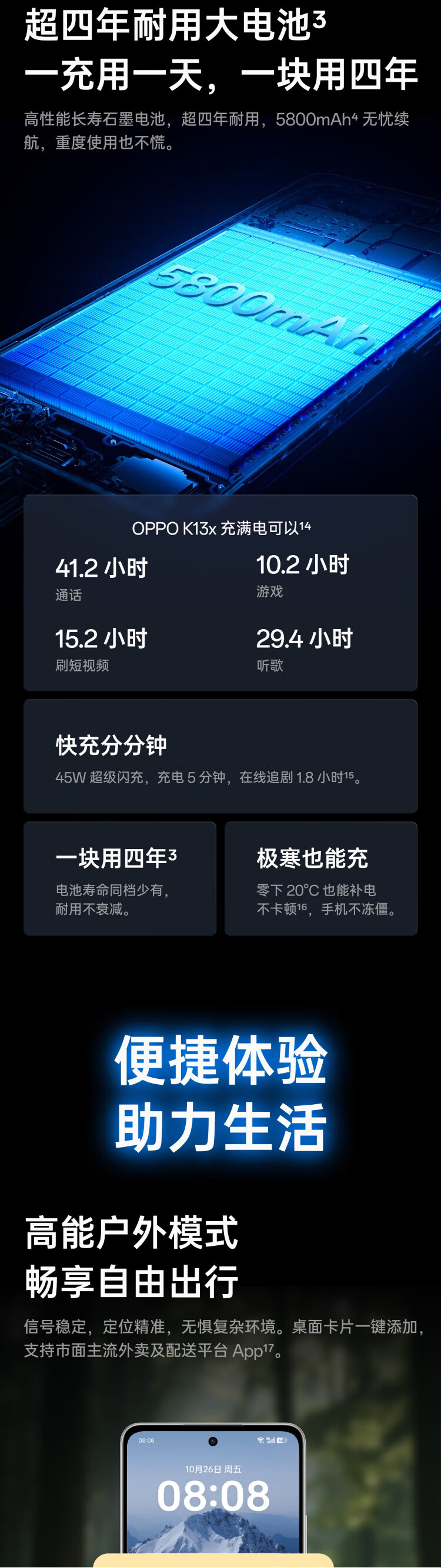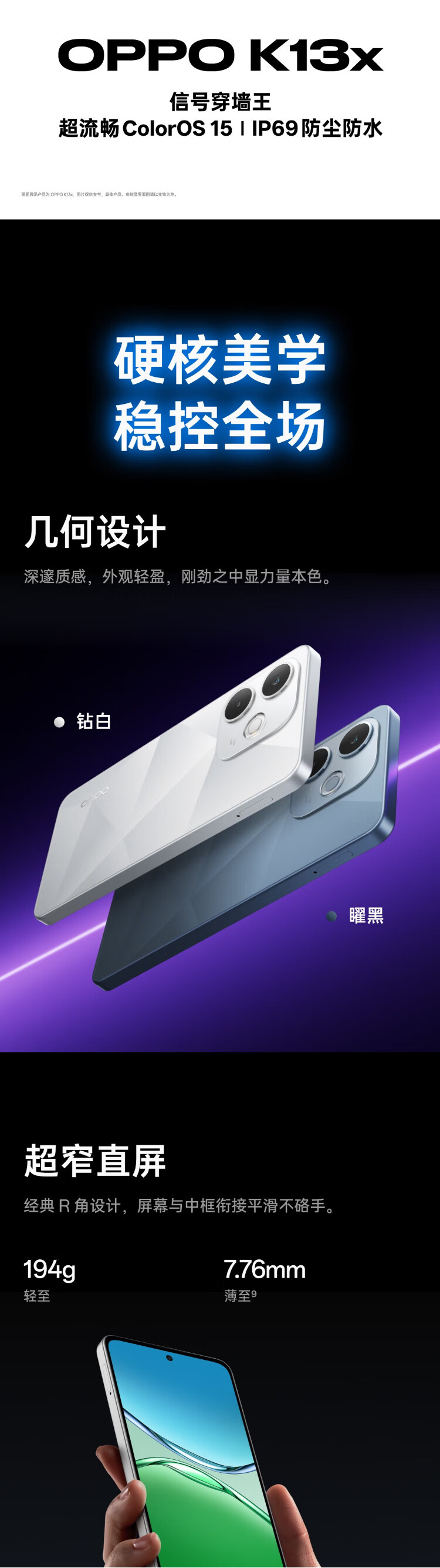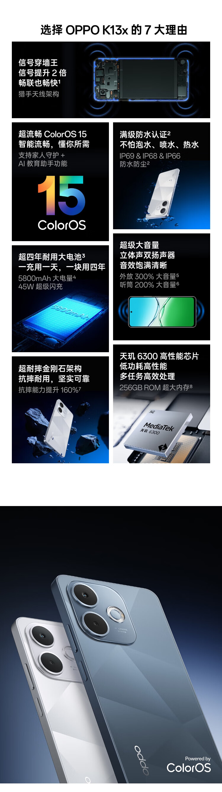 OPPO K13x 5G, the new thousand-yuan performance miracle machine, the king of signal penetration, super smooth ColorOS 15 IP69 dustproof and waterproof mobile phone, new product launch, black 8GB+256GB