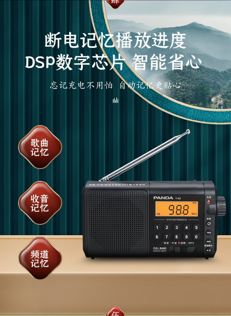 Panda (panda) T-02 full-band radio for the elderly plug-in card TF card portable old-fashioned rechargeable radio car backup semiconductor black