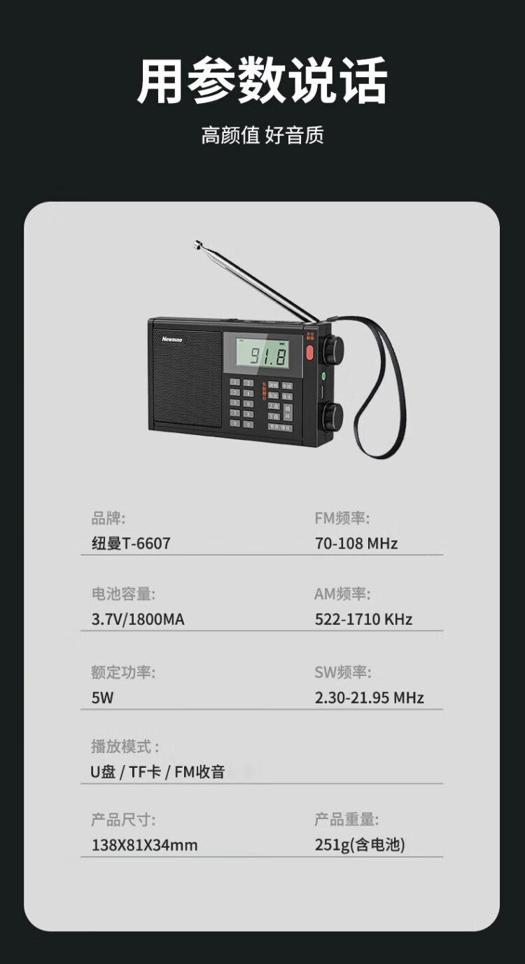 Newman T-6607 radio for the elderly special digital mini card rechargeable small audio portable walkman full-band FM college entrance examination English listening level 4 and 6 player