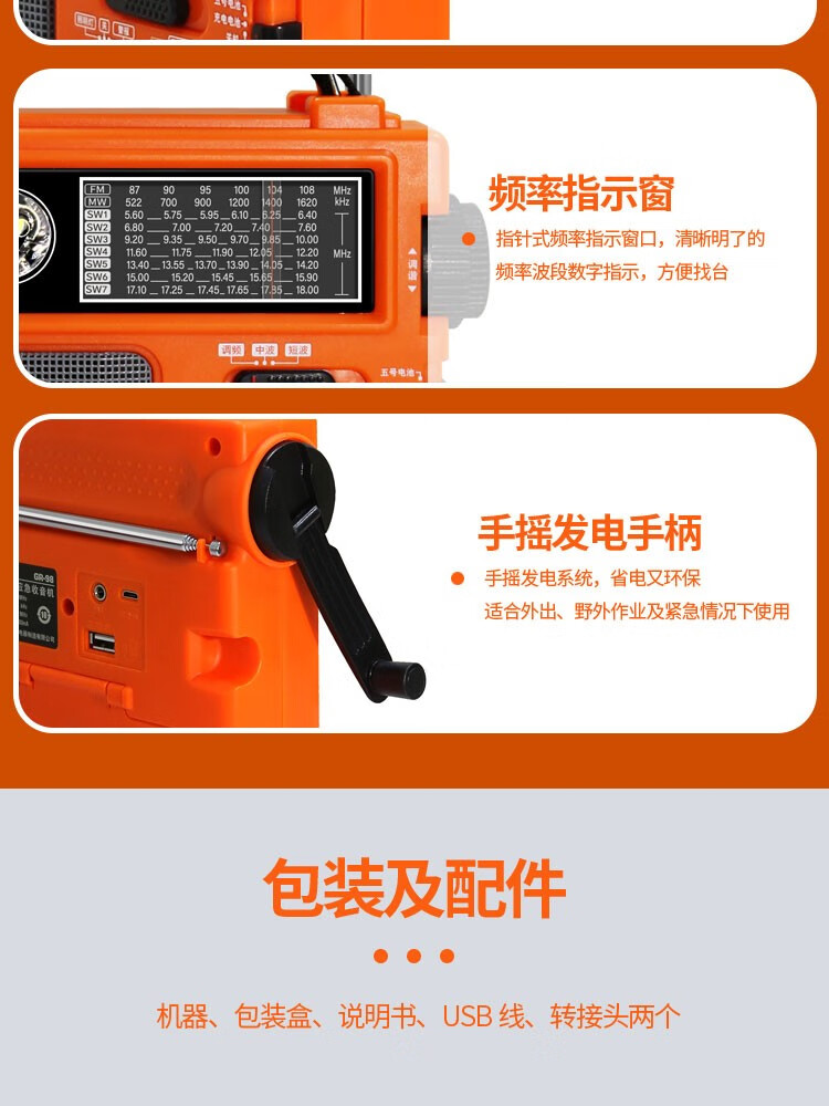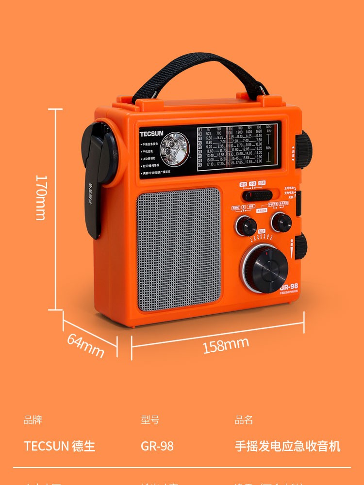 Tecsun GR-98 hand-operated emergency lighting radio buzzer alarm rechargeable external power supply DSP radio outdoor portable GR-98 orange standard