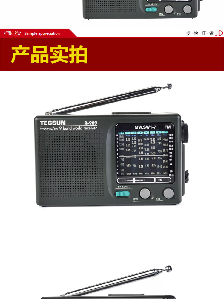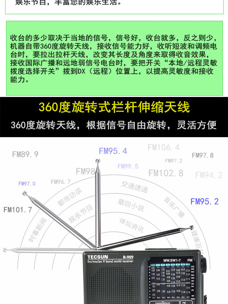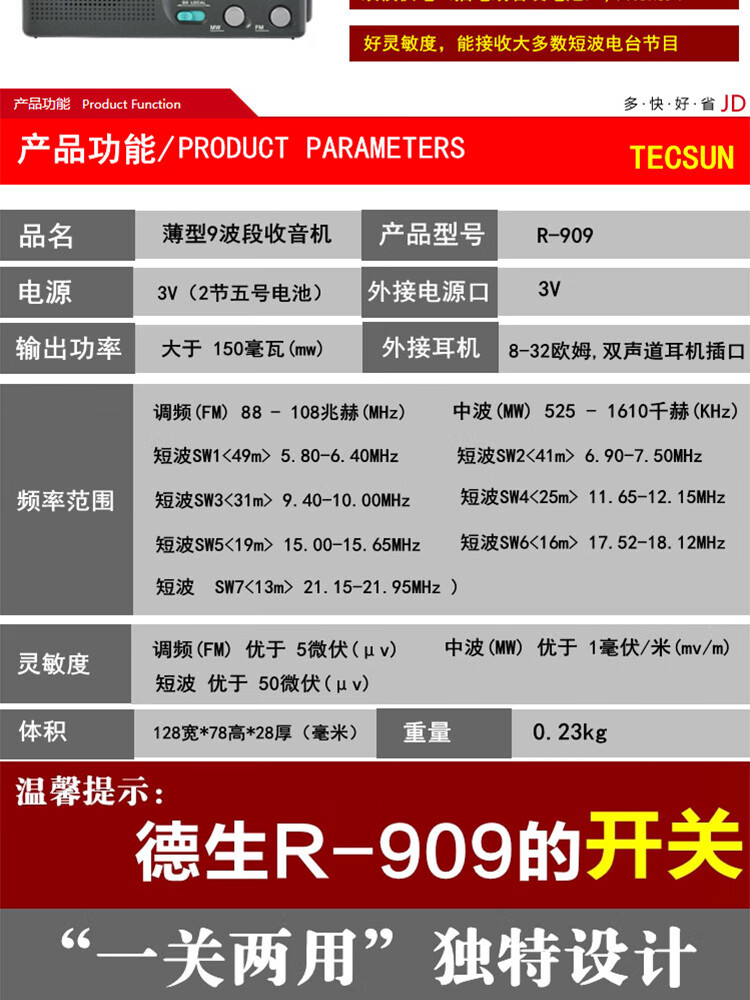 Tecsun R-909 portable full-band radio for the elderly, broadcast semiconductor pointer mini FM radio for the elderly, standard configuration + 2 rechargeable batteries + battery charger