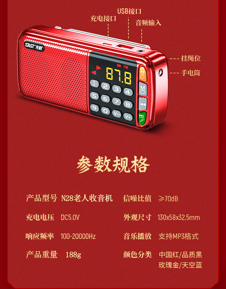 Xianke N28 Radio pour personnes âgées, lecteur Walkman pour personnes âgées, petite machine à chanter à semi-conducteur rechargeable 2025, rouge de Chine, carte mémoire 16 Go gratuite + 5000 chansons et narration d'opéra