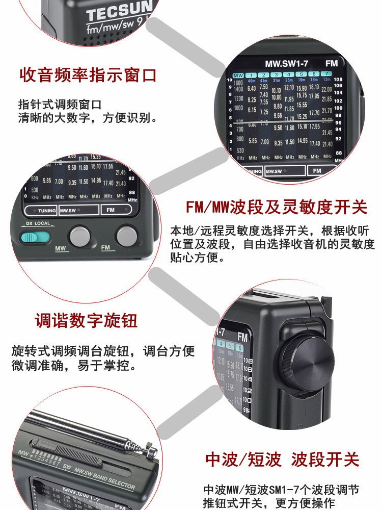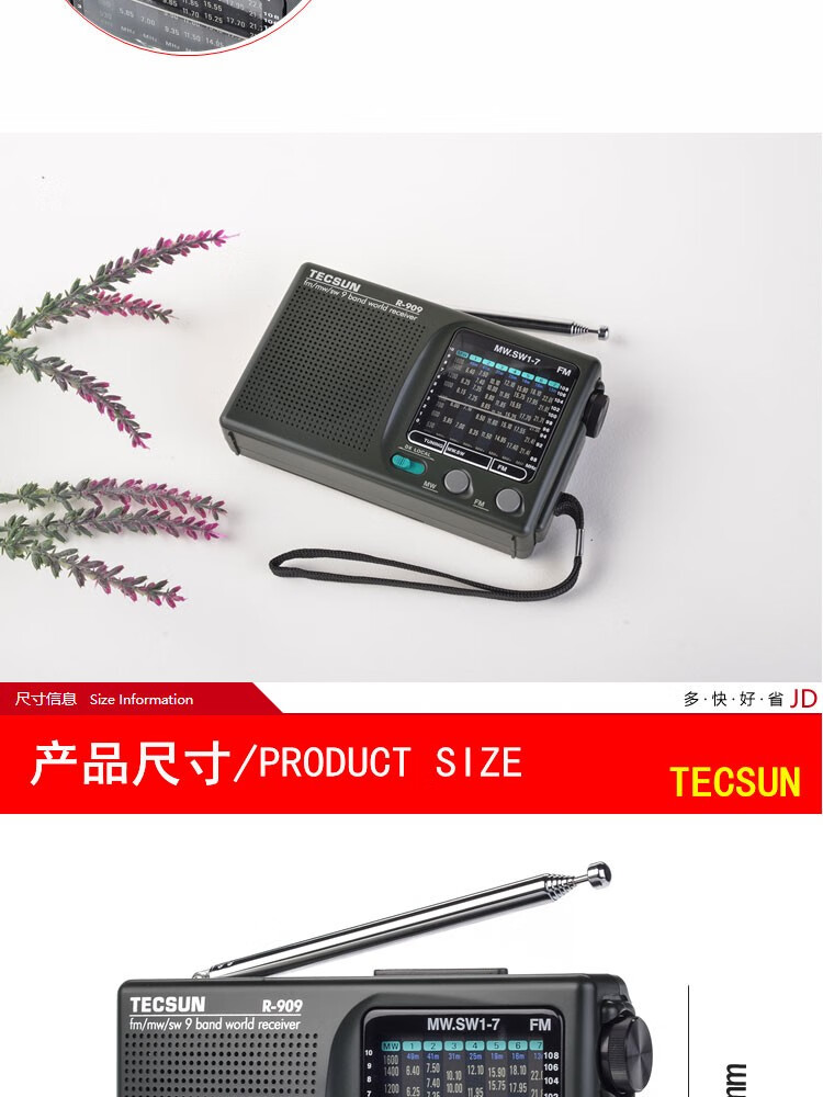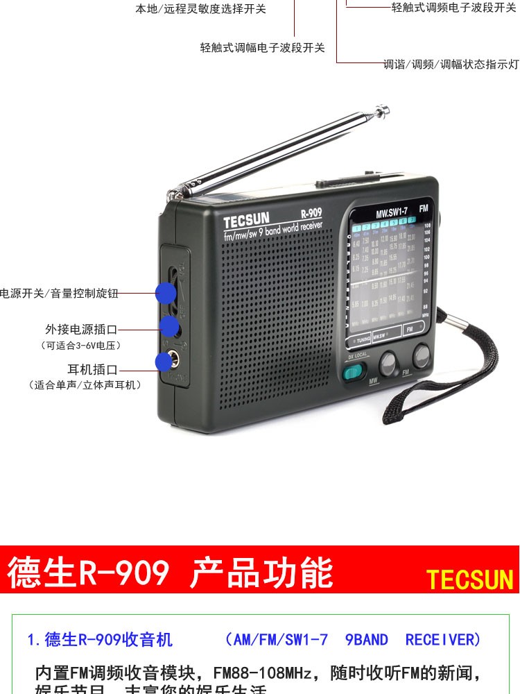 Tecsun R-909 elderly full-band radio broadcast semiconductor portable elderly pointer mini FM radio standard + power adapter