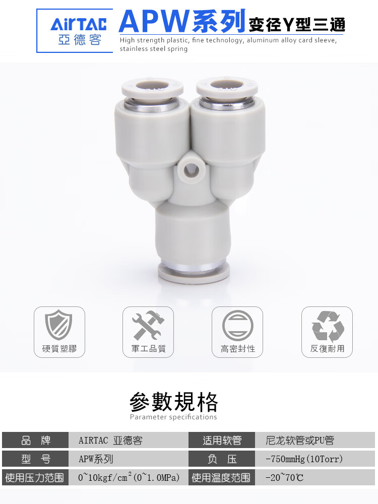 AirTac air pipe quick-in connector Y-type tee reducing diameter APW6-4/8-6/10-8/12-10 APW8-6