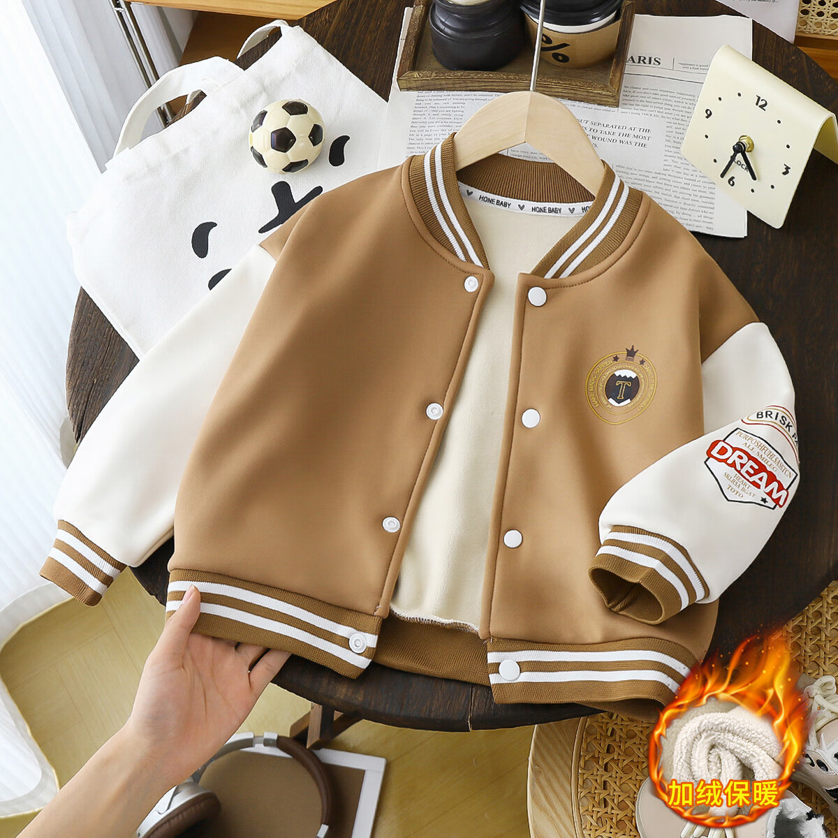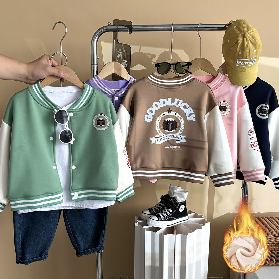 Children's new autumn and winter velvet thickened baseball jackets for boys and girls, fashionable and versatile tops for babies, coffee color, size 100 (recommended height 85-95cm)