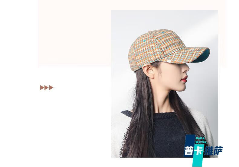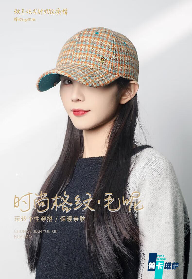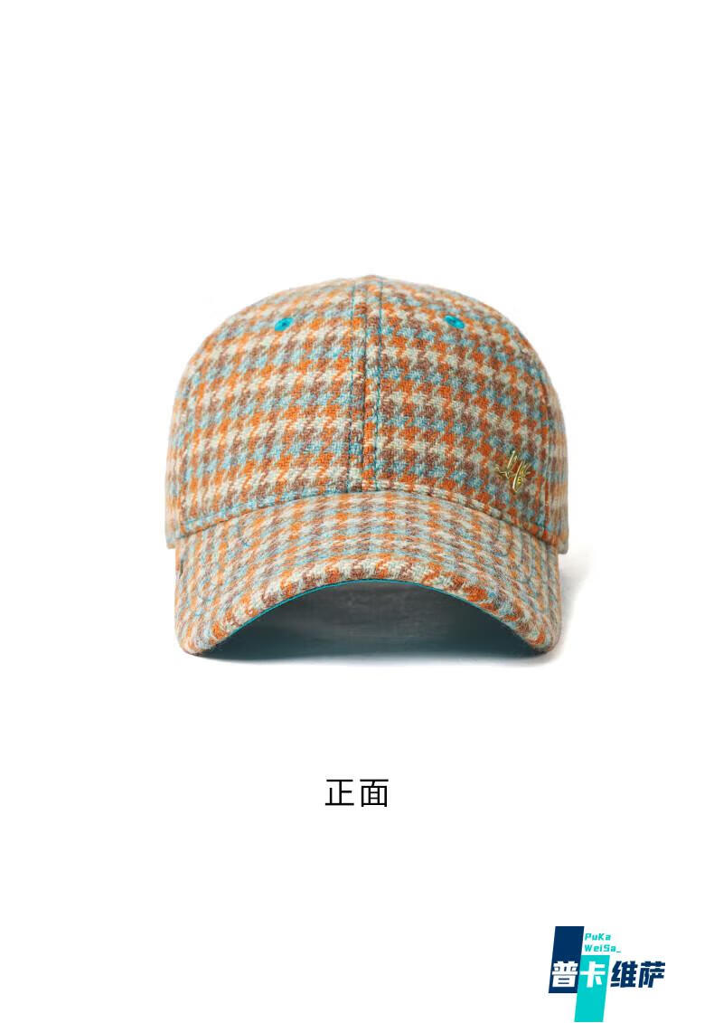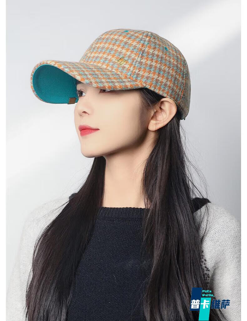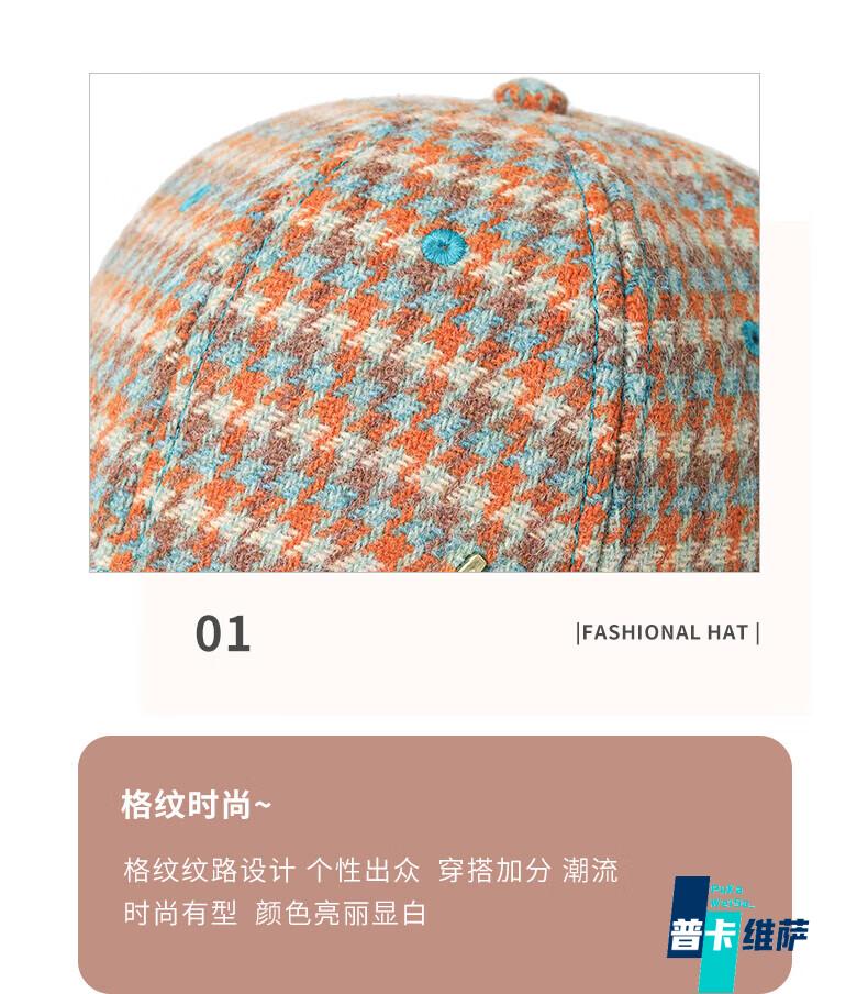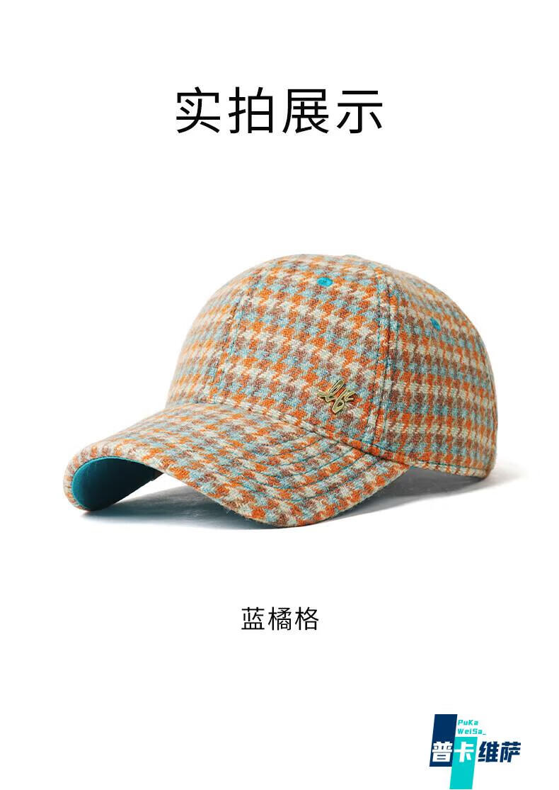 Pukaweisa brand fashionable houndstooth warm woolen baseball cap women's autumn and winter face-showing small duck cap soft top casual hat blue and orange check one size adjustable