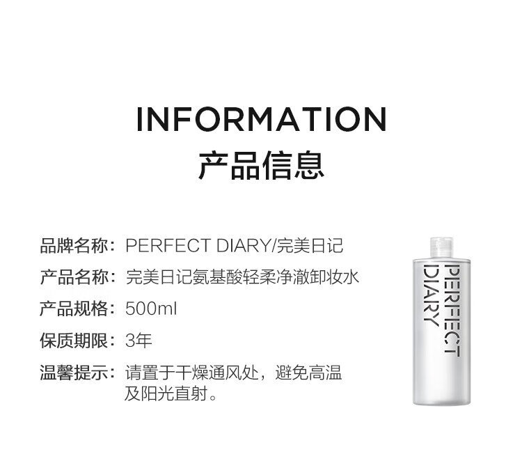 Perfect Diary Amino Acid Makeup Remover Water Gentle Purifying Makeup Remover 500ml*2 Cleansing Eyes and Lips Gentle Remover 2 Bottles