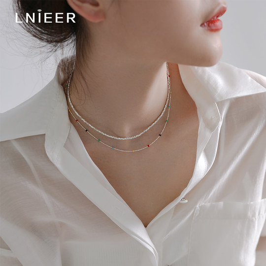 South Korea's IU same style 925 sterling silver broken silver necklace women's summer light luxury niche design colorful beads clavicle chain stacked high-end