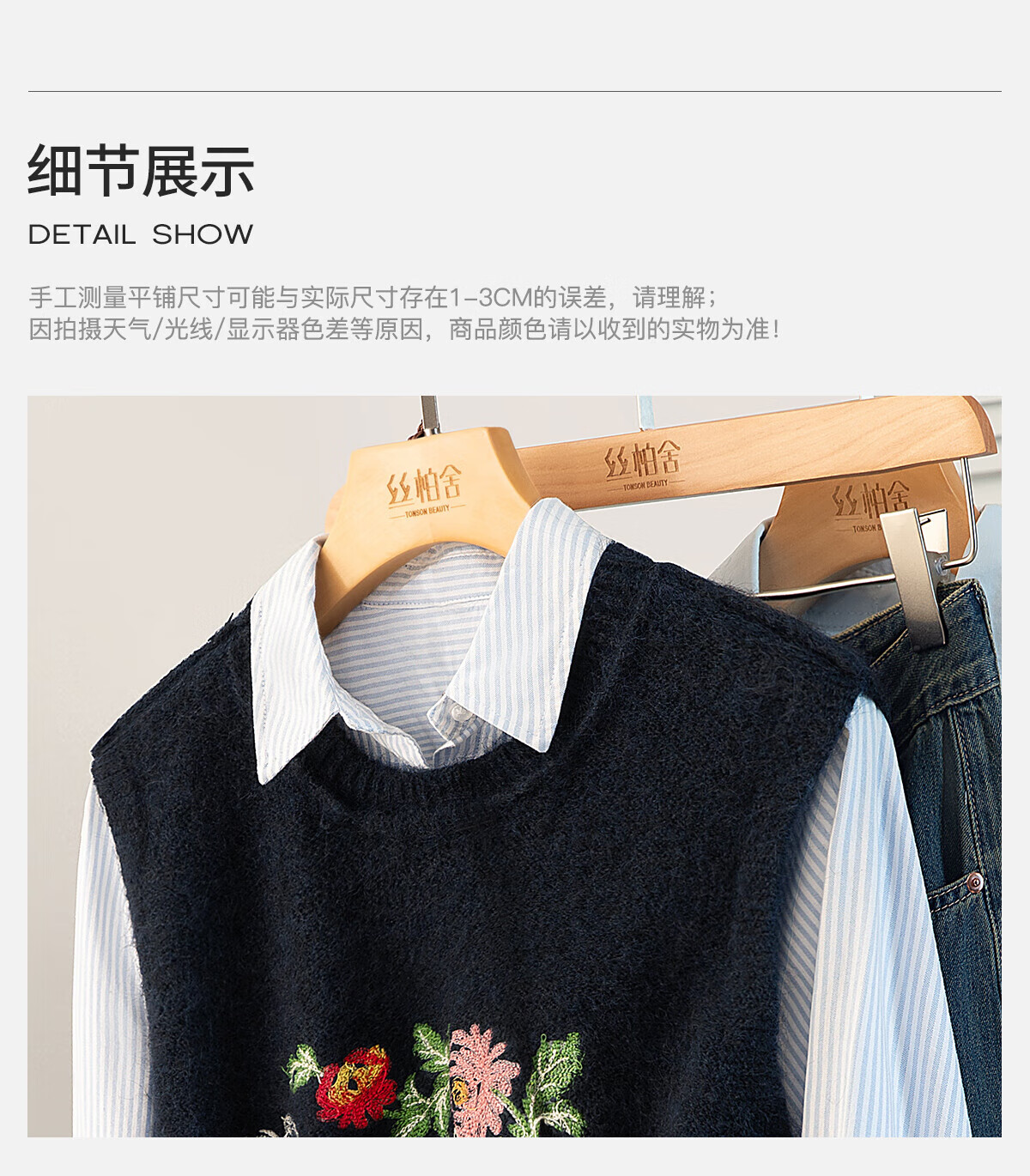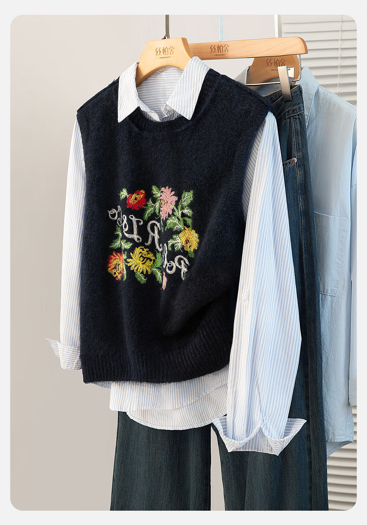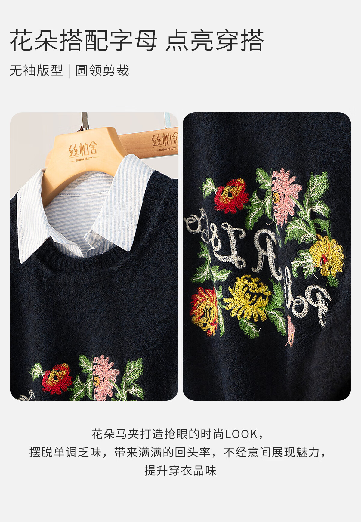 丝柏舍圆领绣花叠穿针织马夹女2025秋装新款时尚气质套头马甲