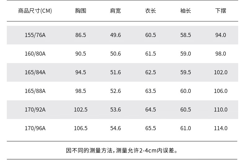 China (cm) 160-165/84-86 165-170 / 88-90 167-172 / 92-96 168-173 / 98-102 170-176 / 106-110