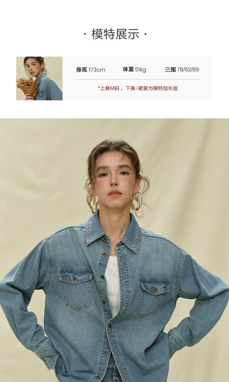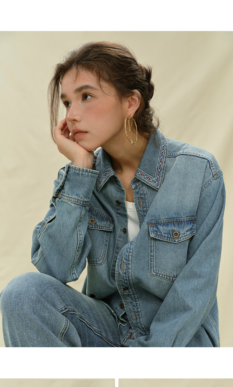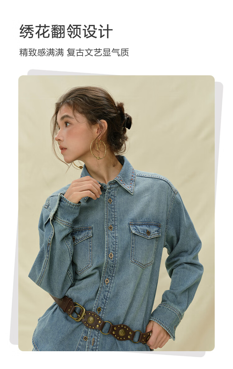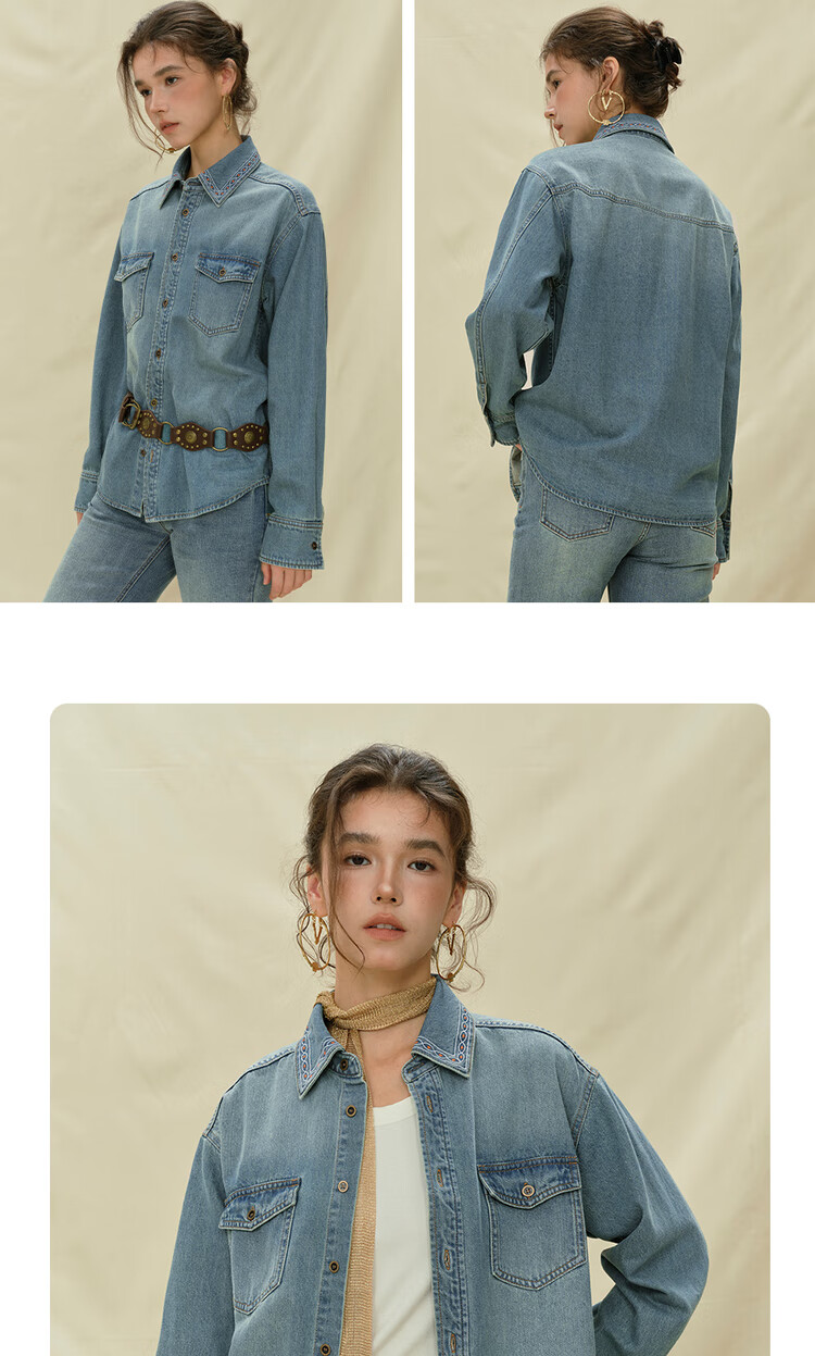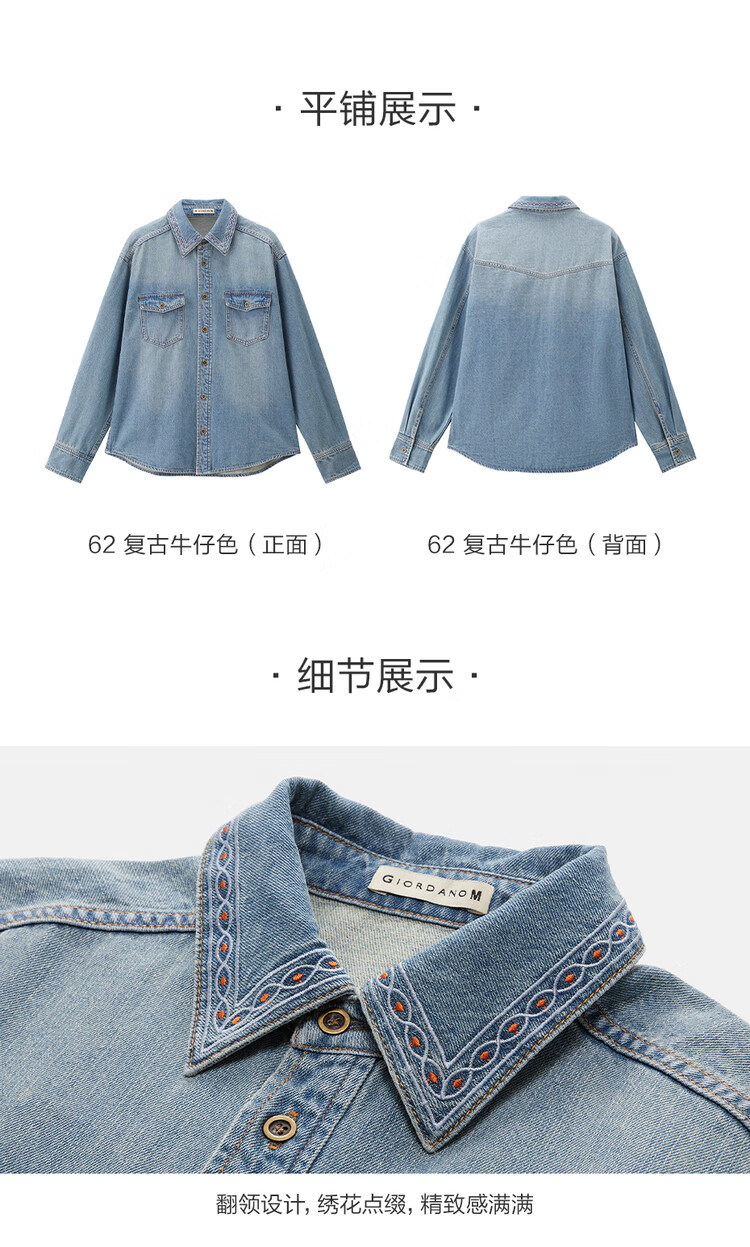 佐丹奴 设计师款女装复古绣花翻领双口袋宽松长袖牛仔衬衫18345617 62复古牛仔色 M