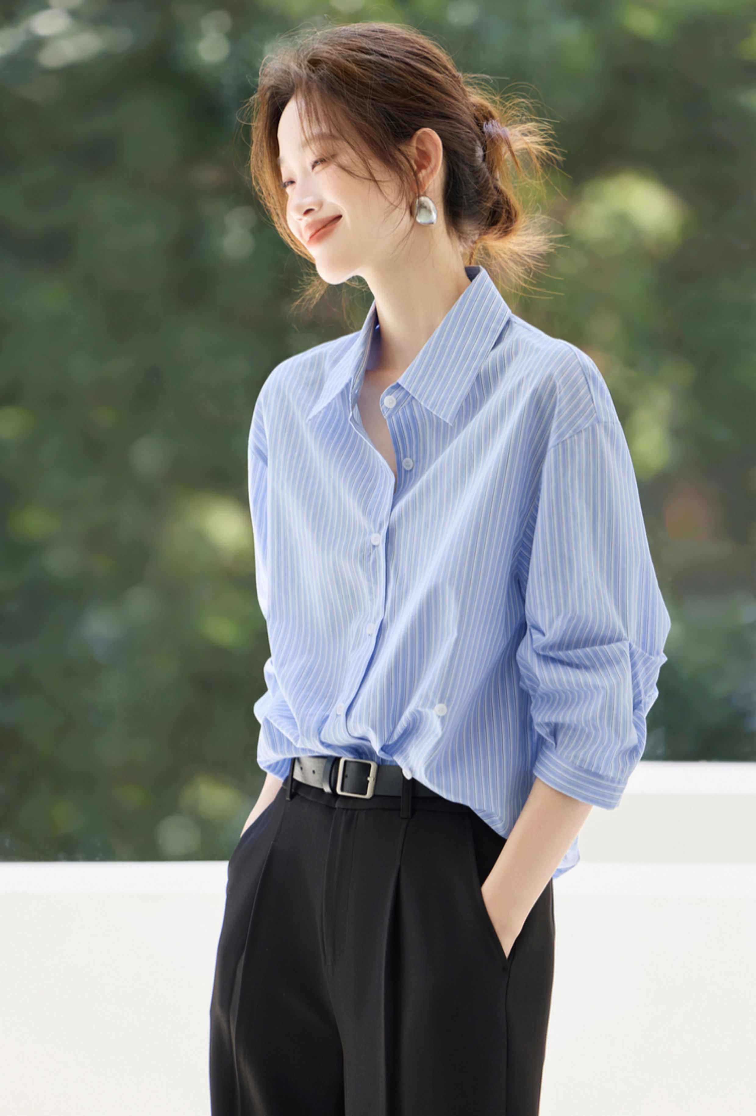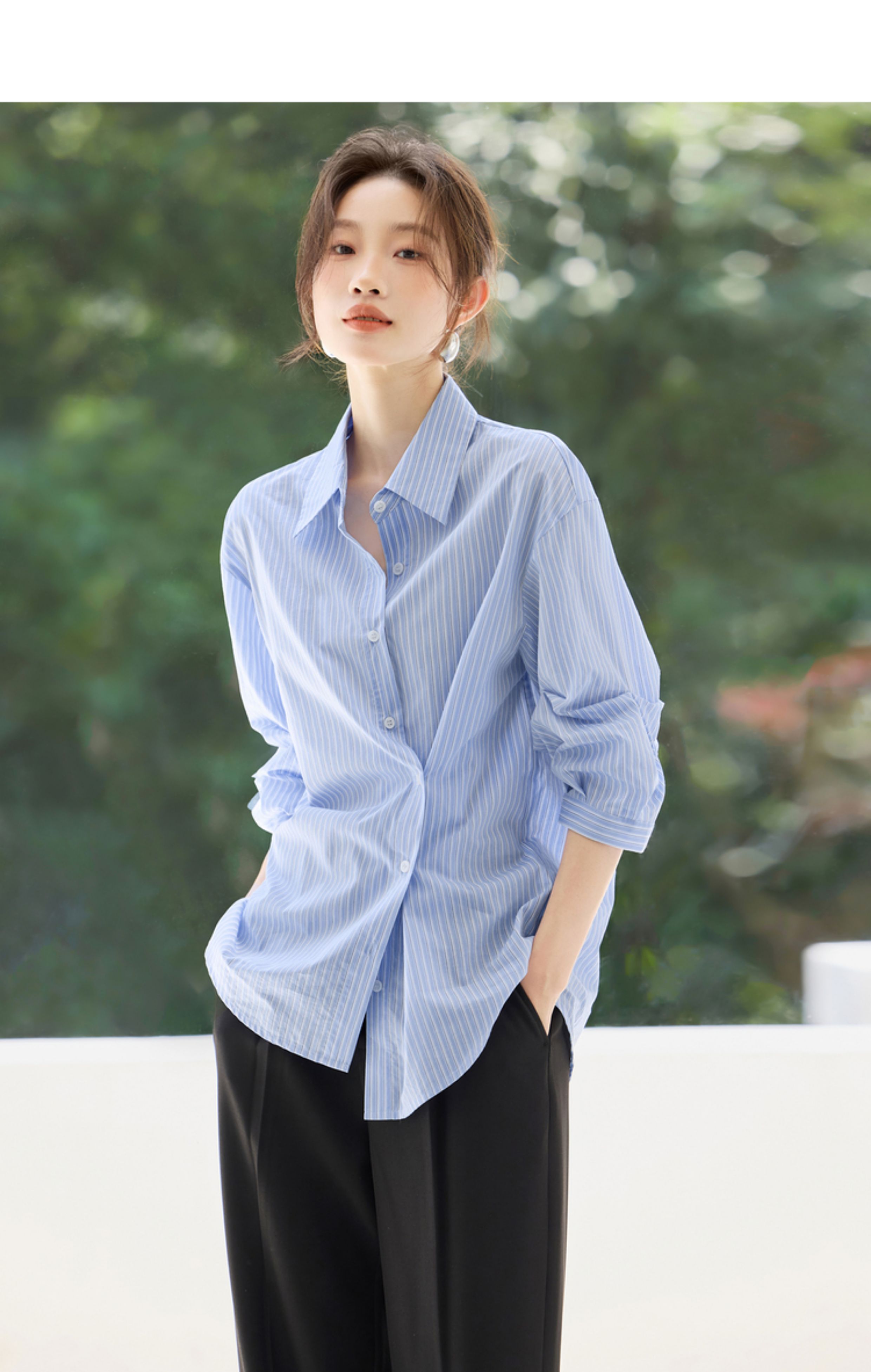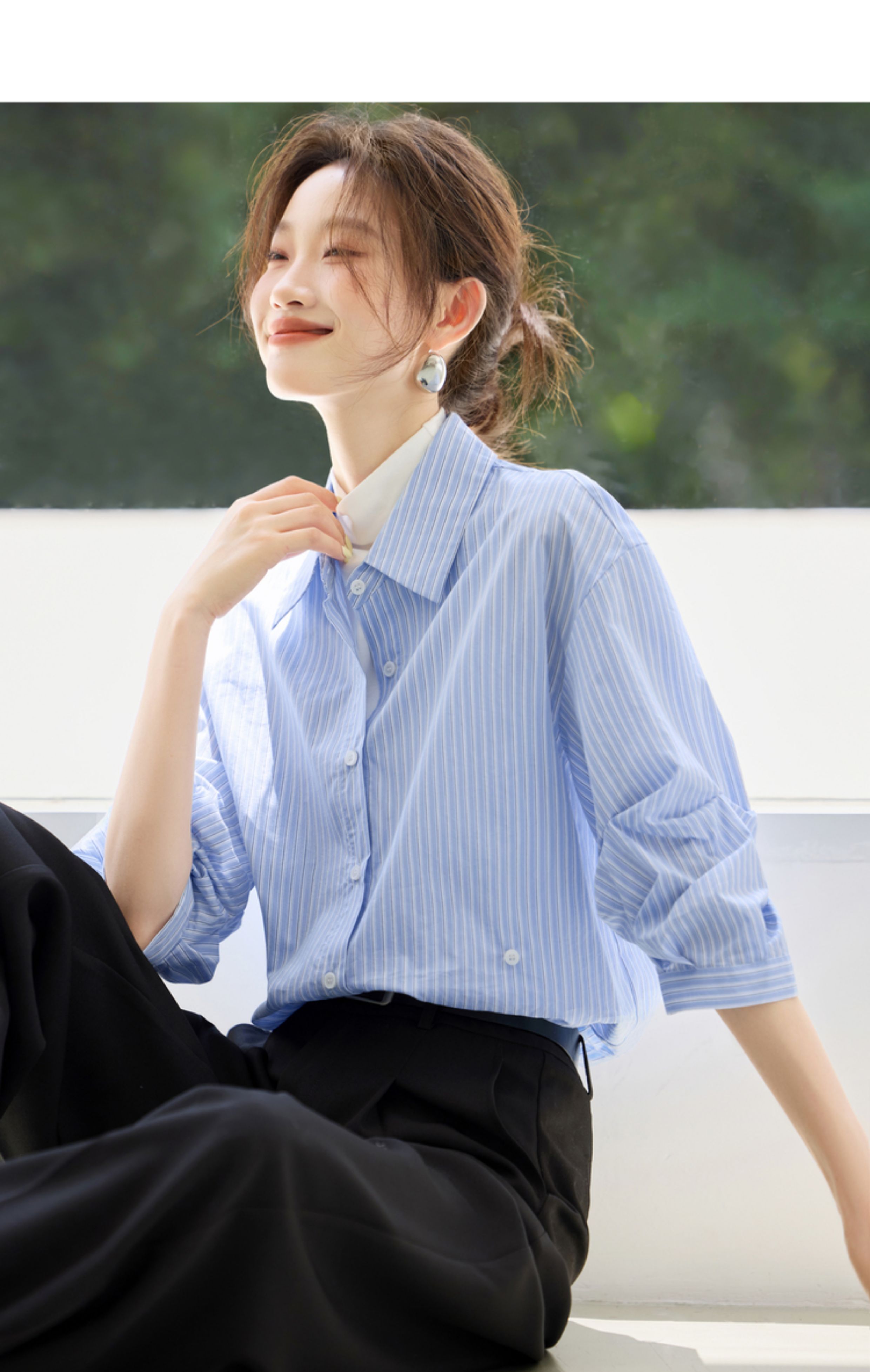 Mohan Yimei striped shirt 2025 summer new style French style age-reducing design loose niche shirt for women blue striped M