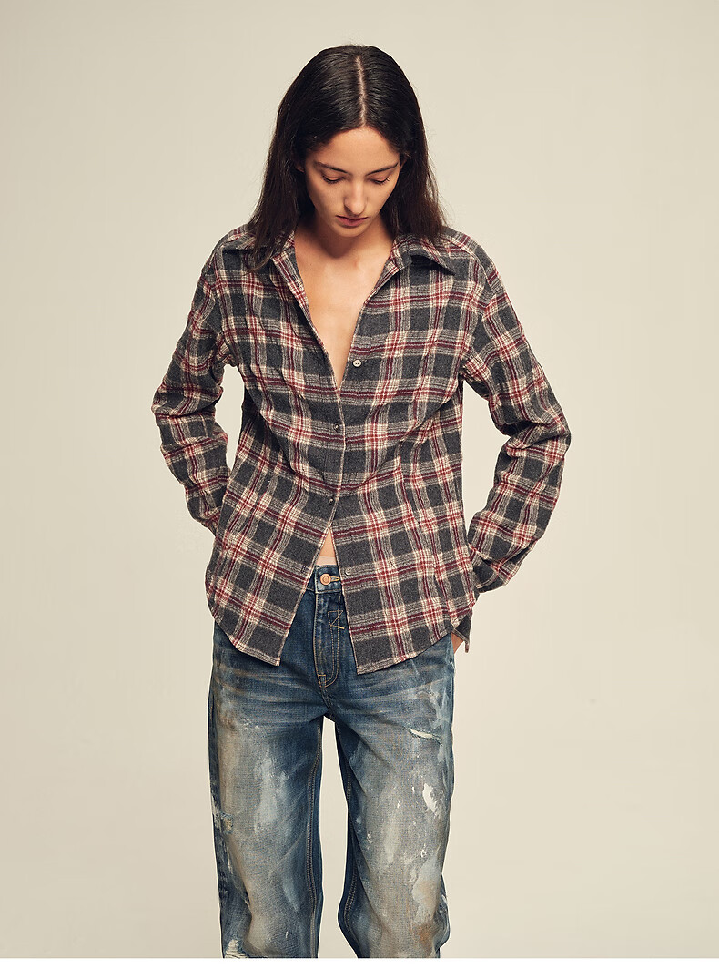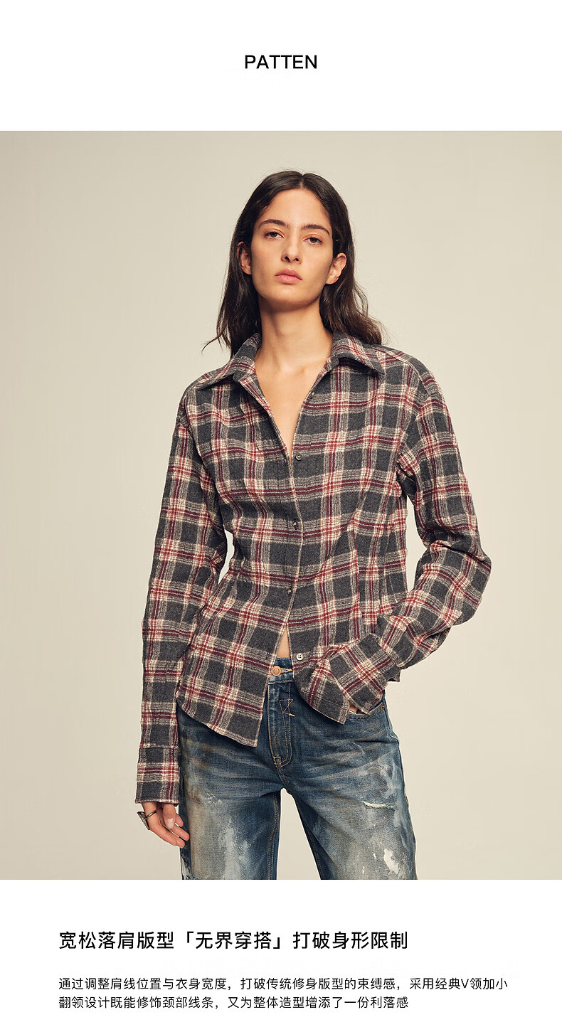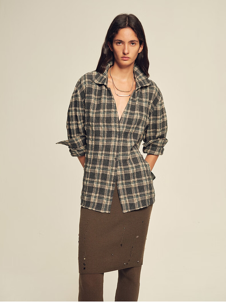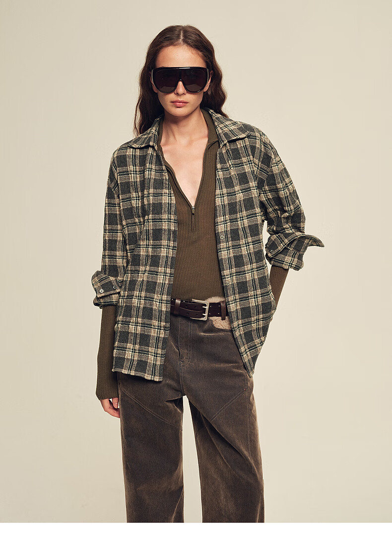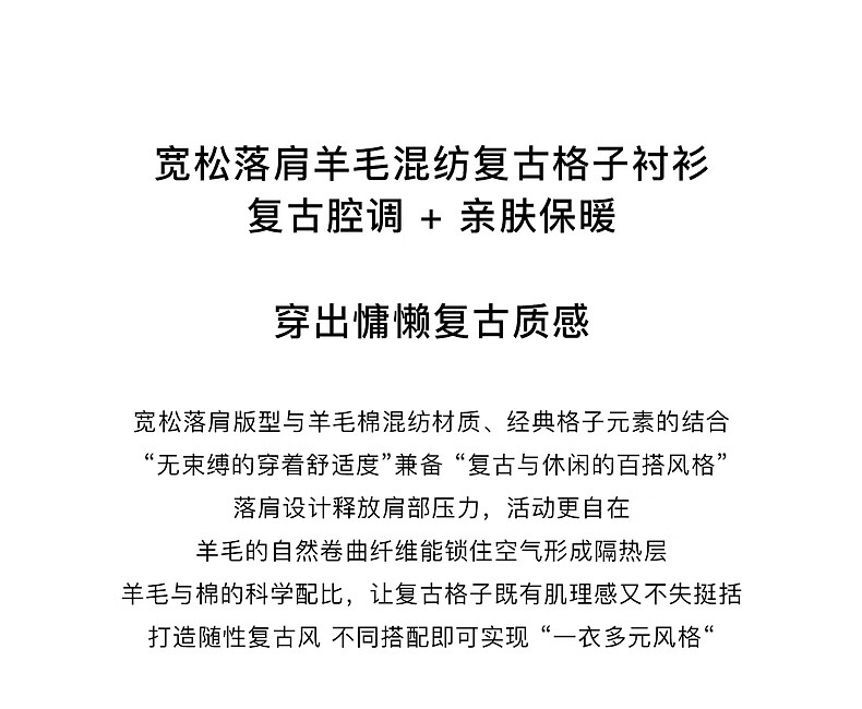 付智恩  英伦格调 复古宽松羊毛棉混纺盐缩磨毛工艺落肩格子衬衫女 松灰格 S