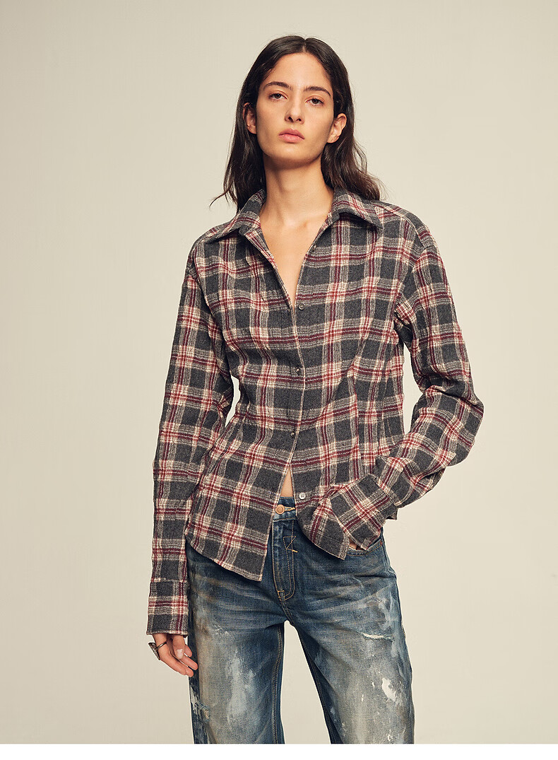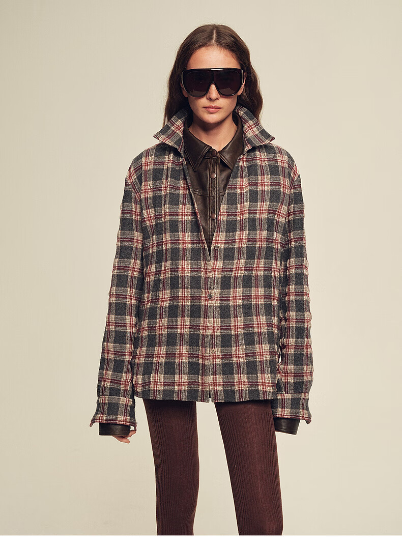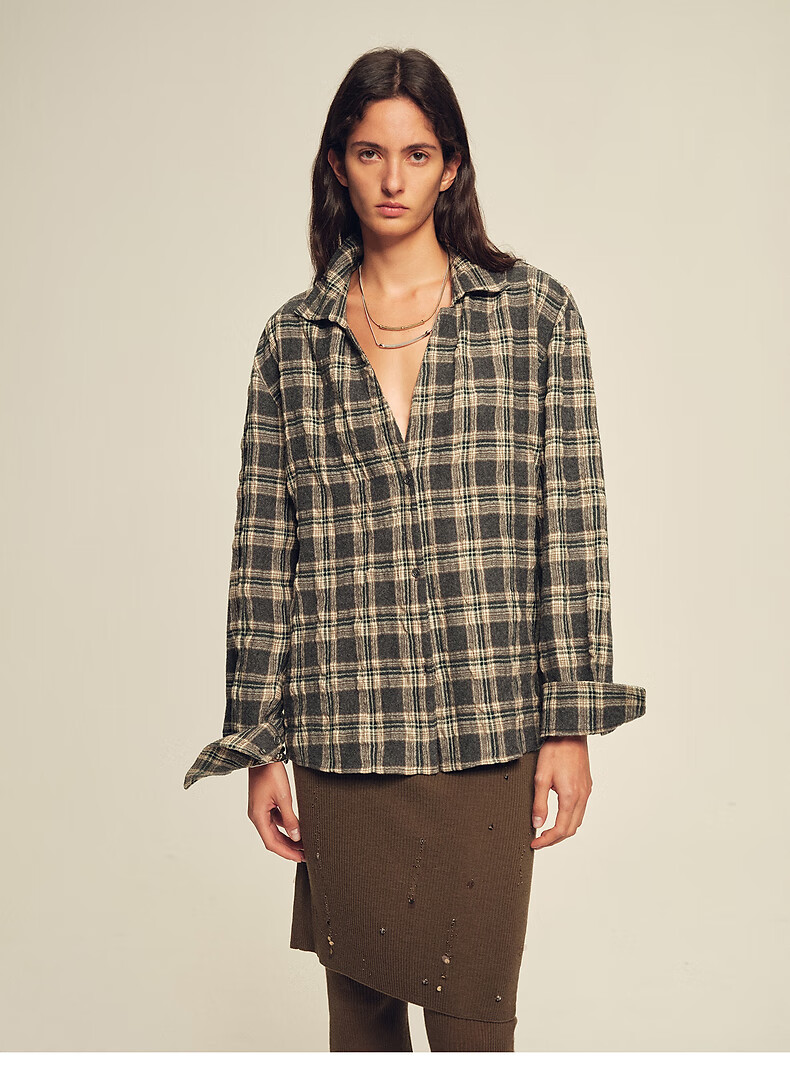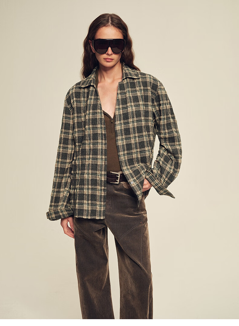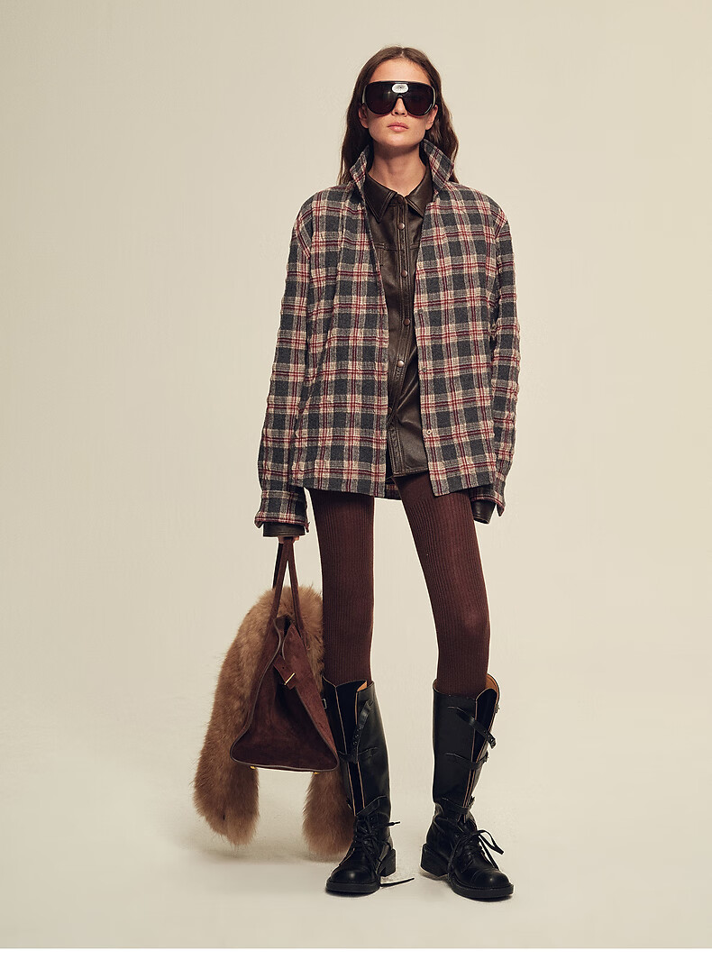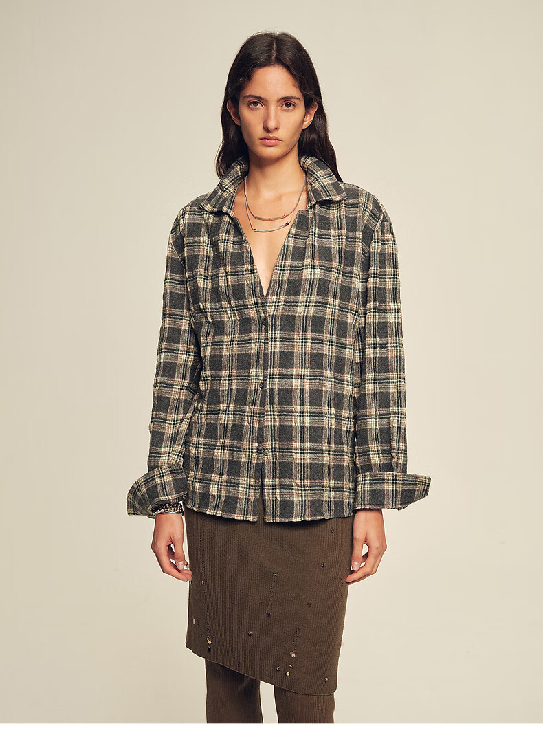 付智恩  英伦格调 复古宽松羊毛棉混纺盐缩磨毛工艺落肩格子衬衫女 松灰格 S