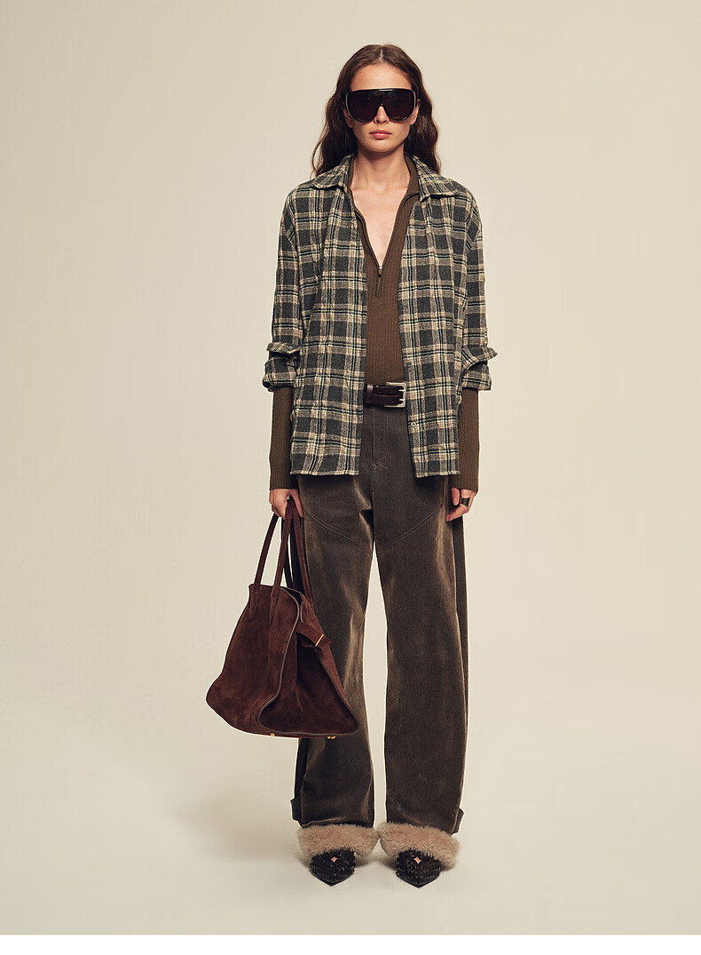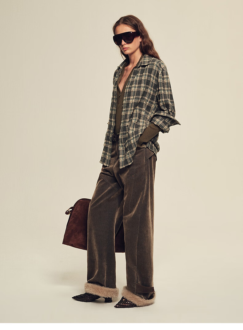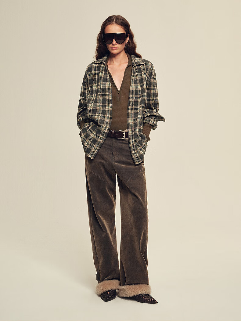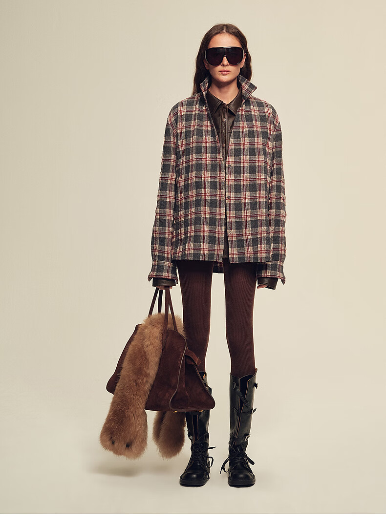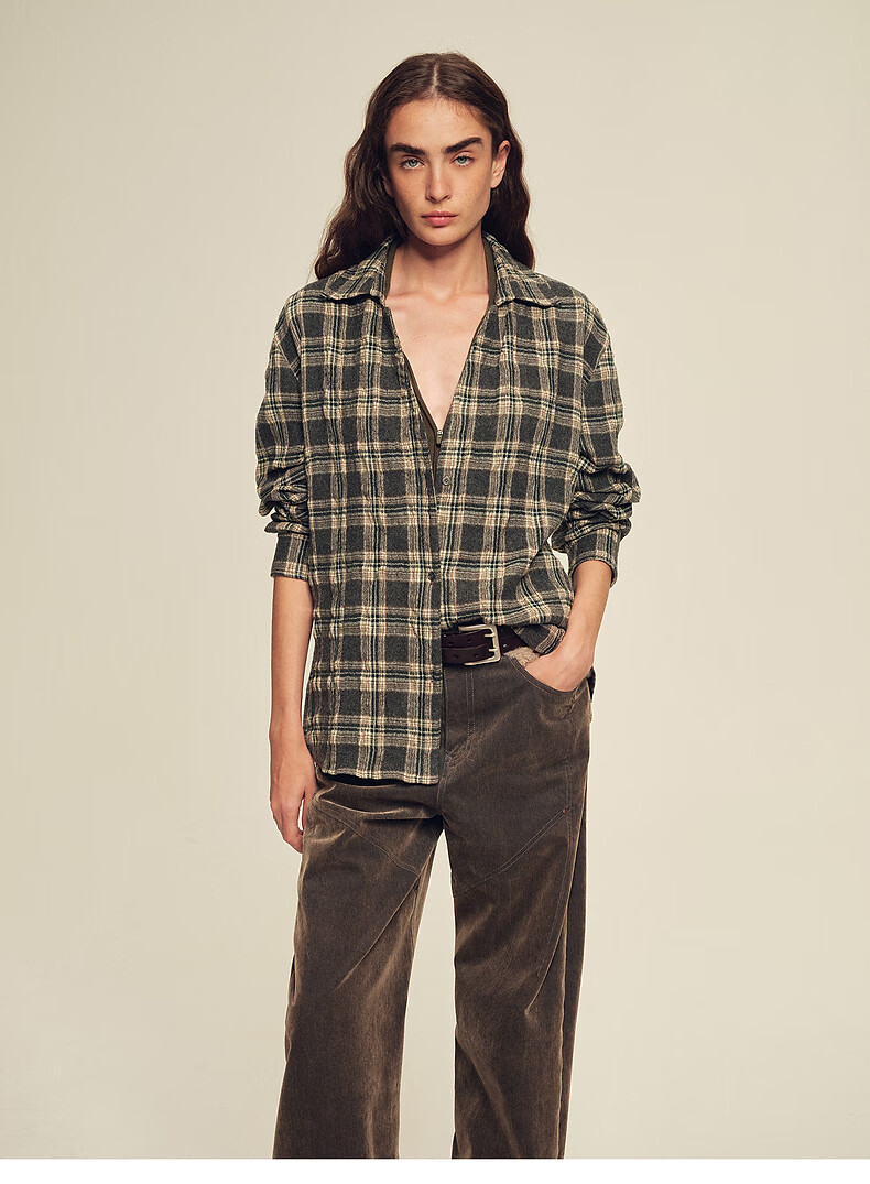 付智恩  英伦格调 复古宽松羊毛棉混纺盐缩磨毛工艺落肩格子衬衫女 松灰格 S