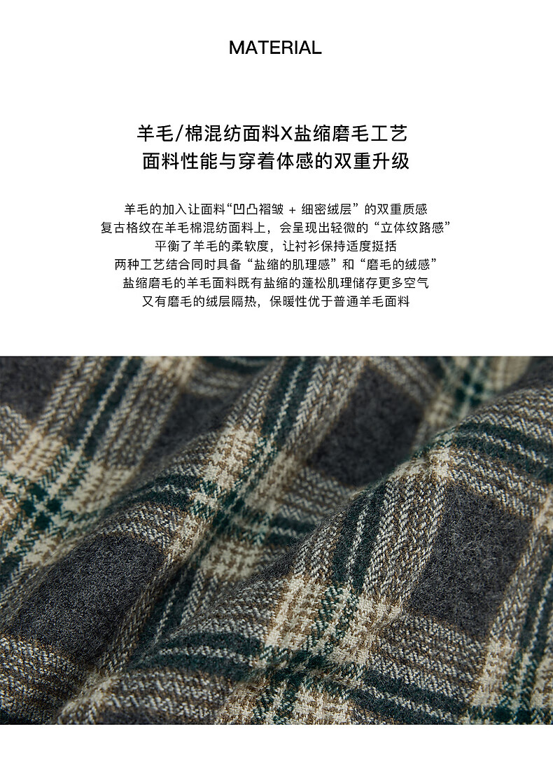 付智恩 英伦格调 复古宽松羊毛棉混纺盐缩磨毛工艺落肩格子衬衫女 松灰格 S