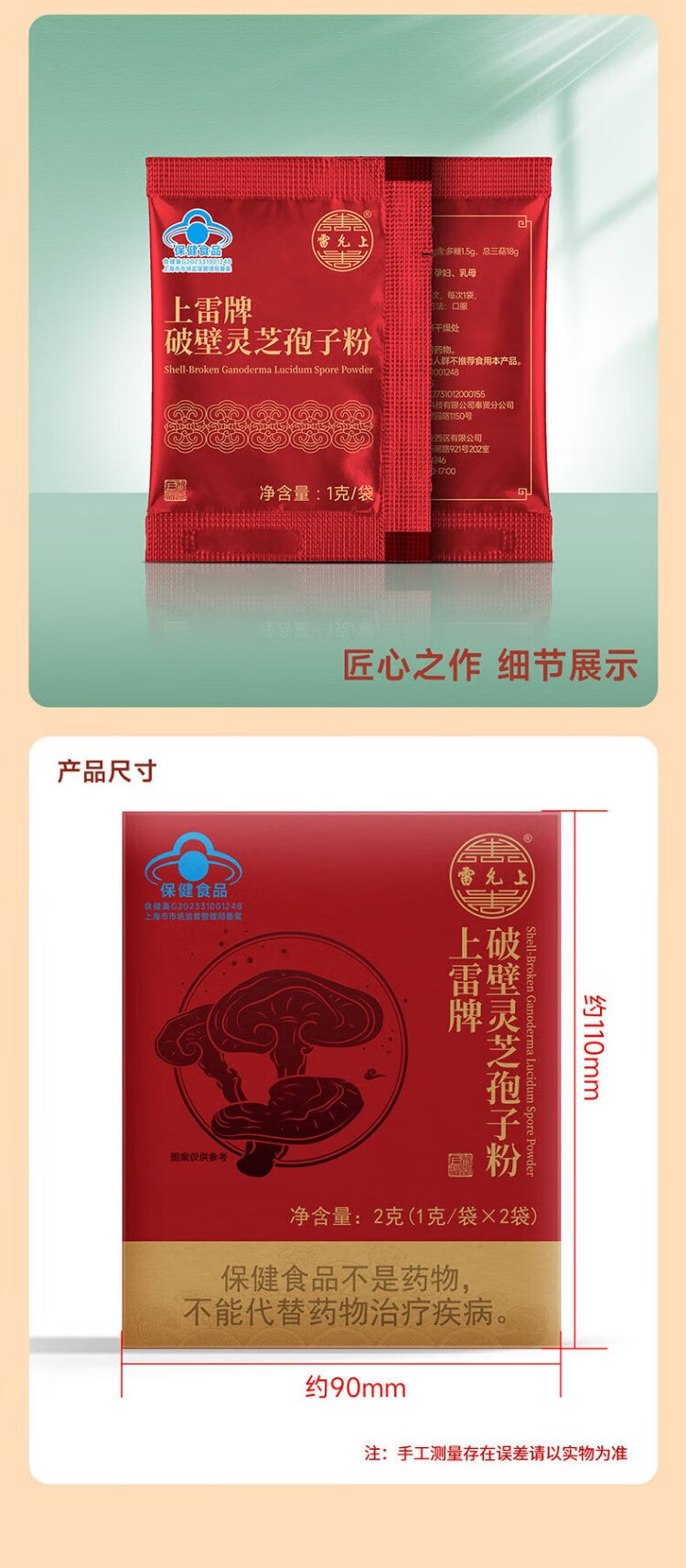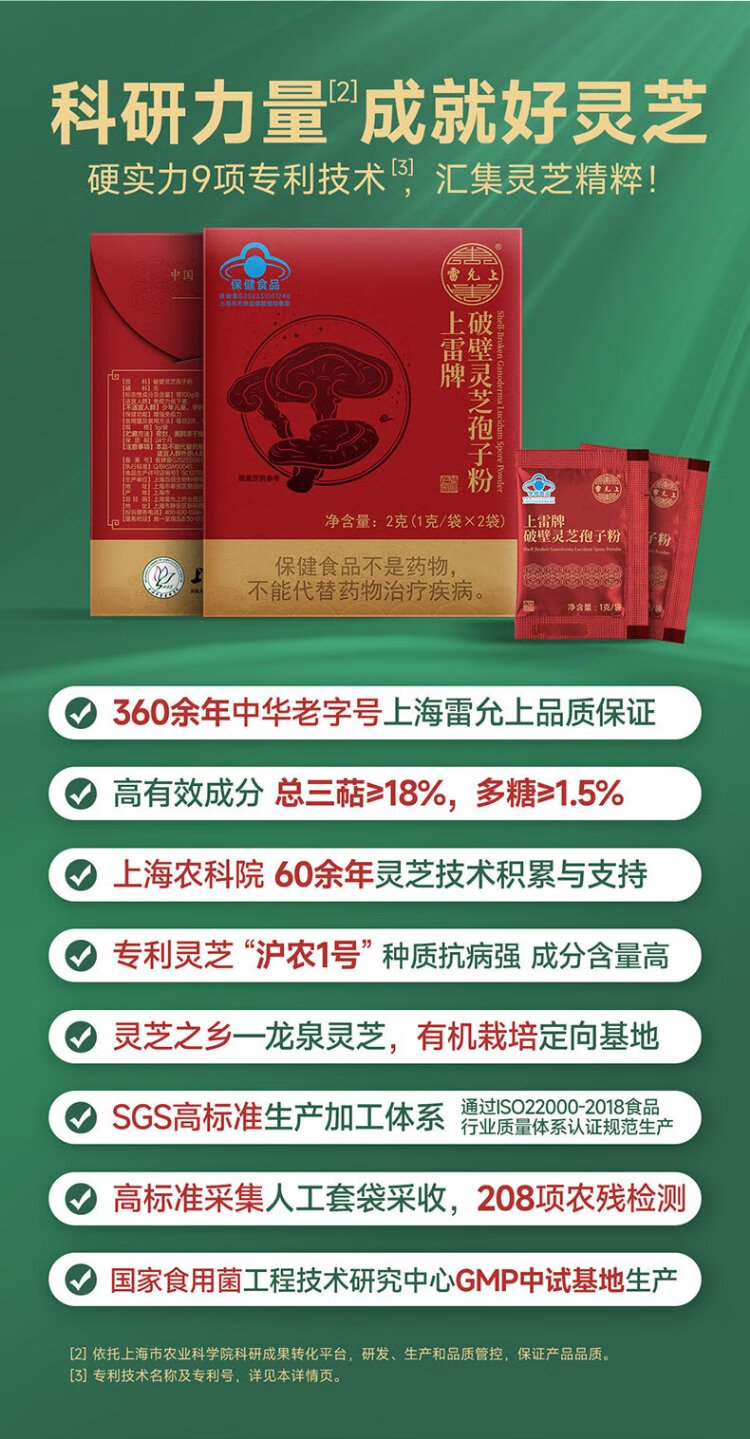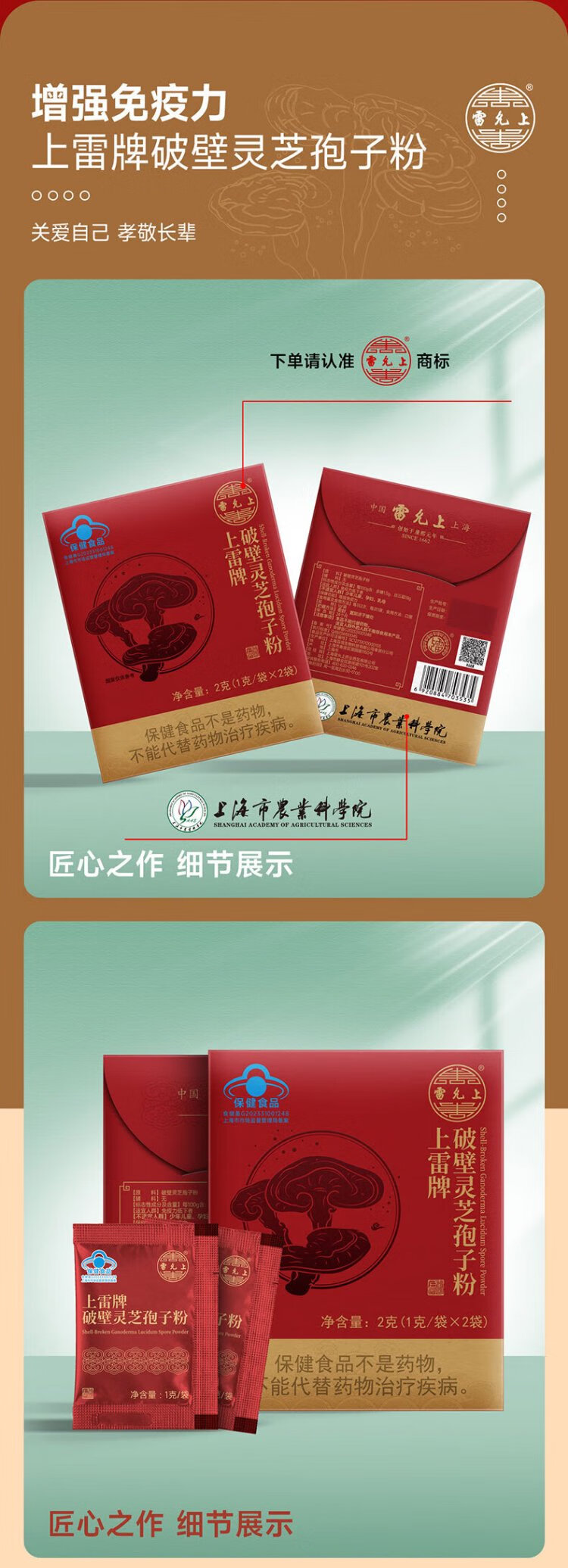 雷允上破壁灵芝孢子粉1克*2袋上海农科院林芝袍子粉高三萜增强免疫