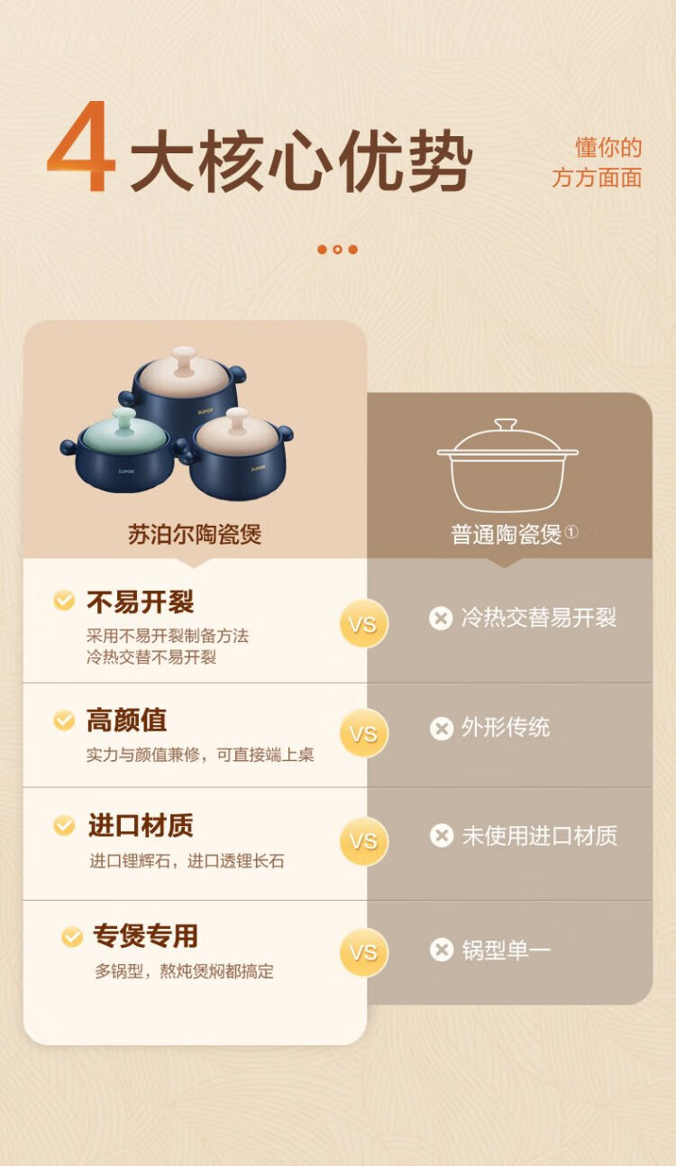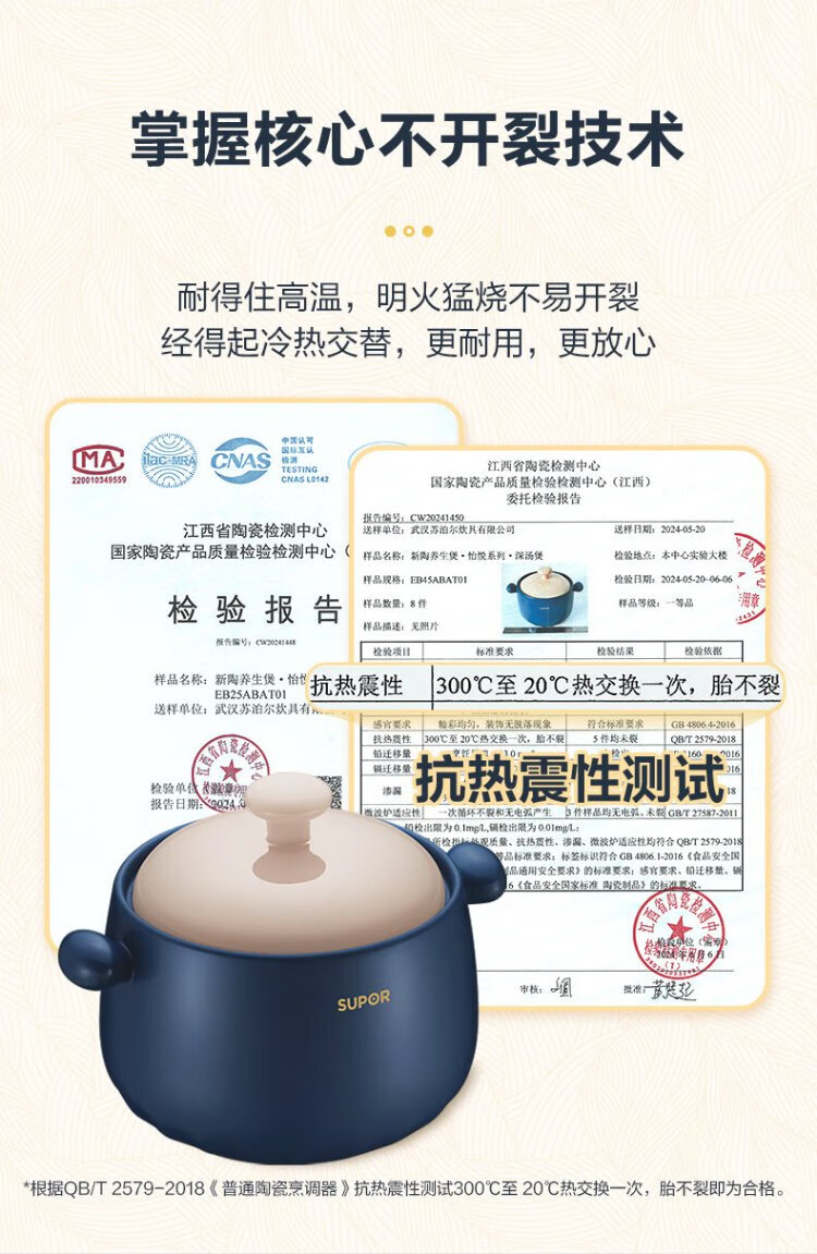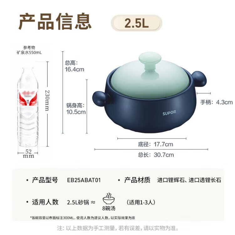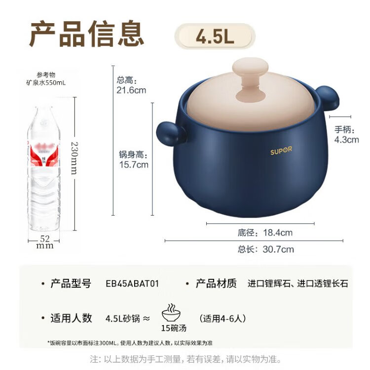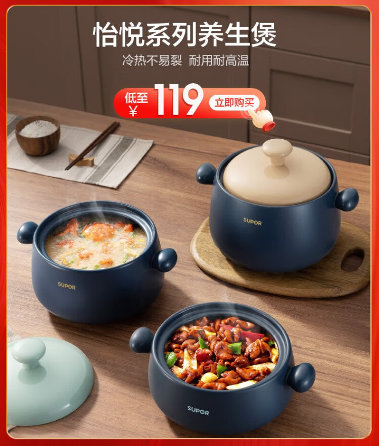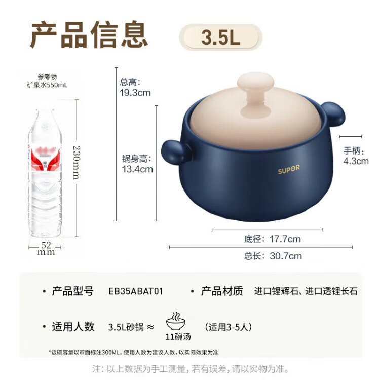 SUPOR casserole is high temperature resistant and not easy to crack. Household clay pot rice casserole Chinese medicine decoction soup casserole stew pot ceramic pot deep soup pot suitable for 3~5 people 3.5L