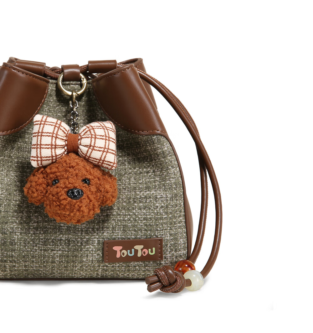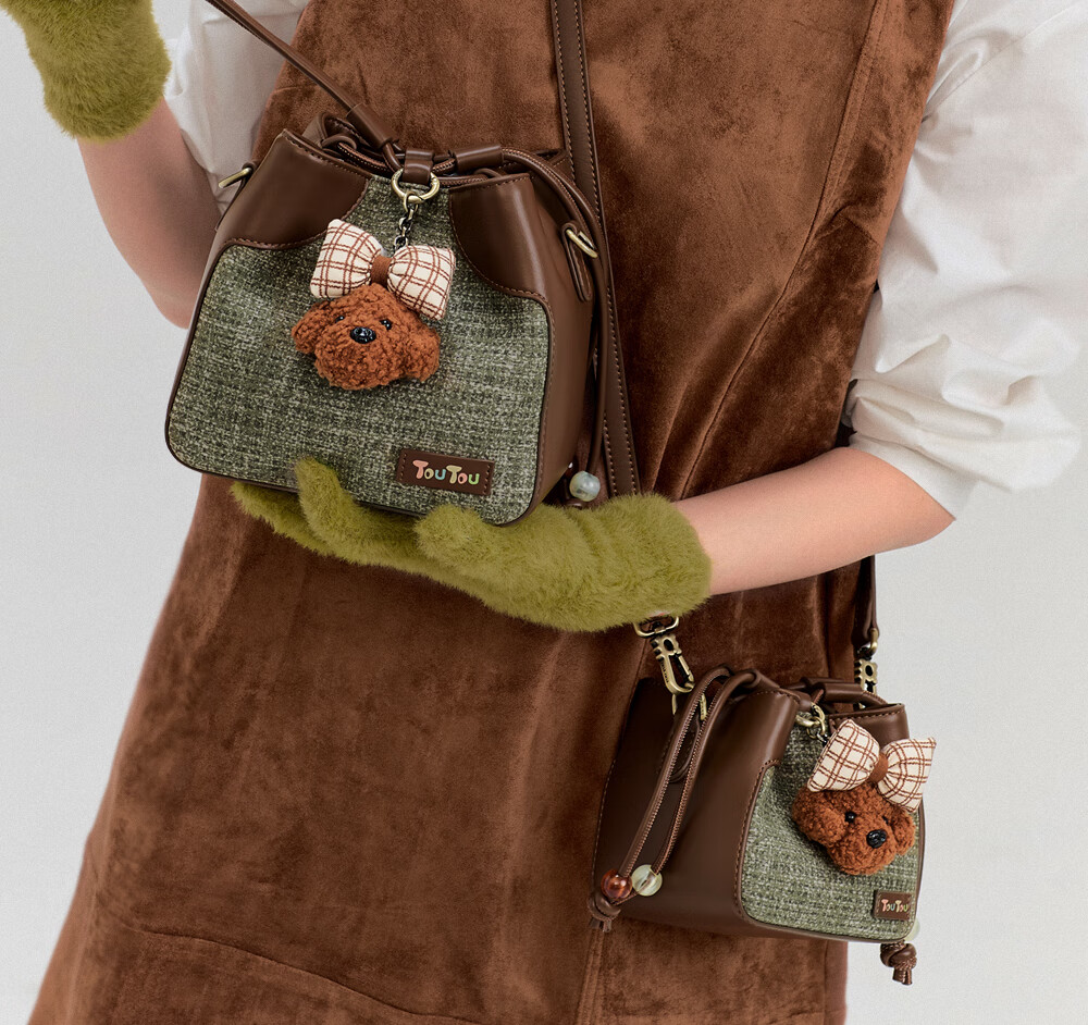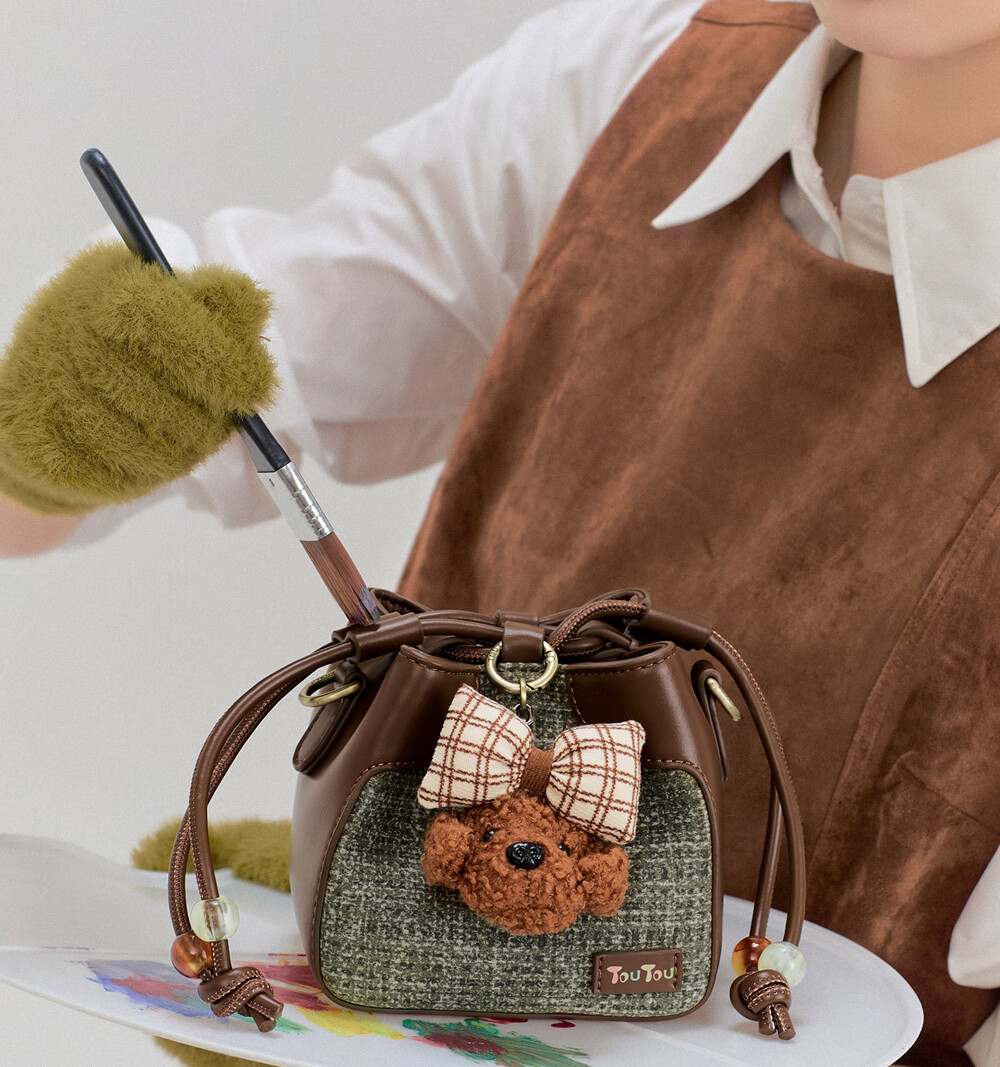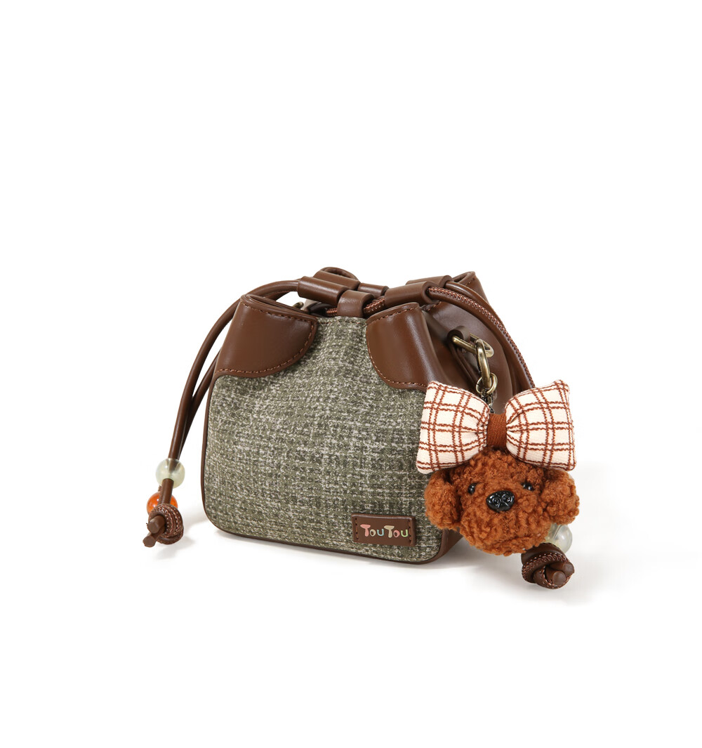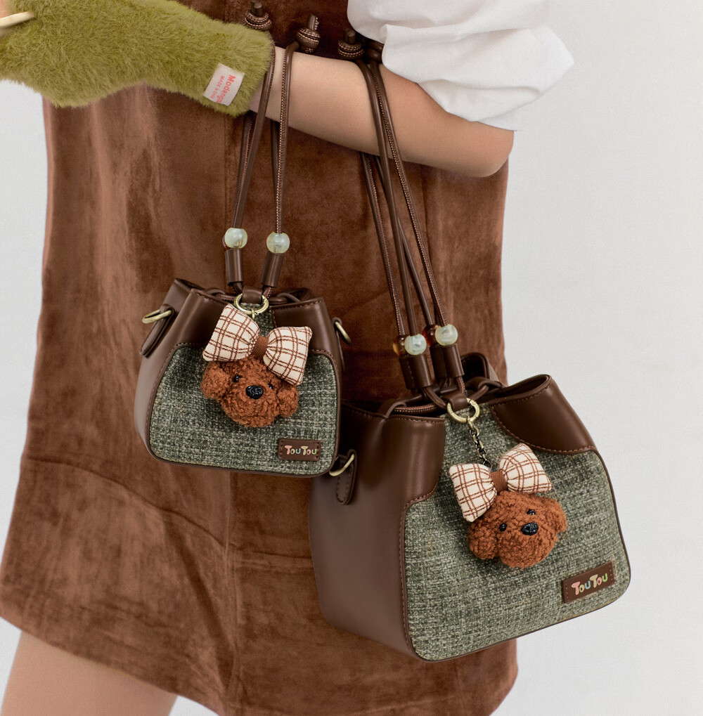 Toutou2025 new bag woolen bucket bag-standard plaid butterfly puppy pendant bucket bag chocolate brown (small version)