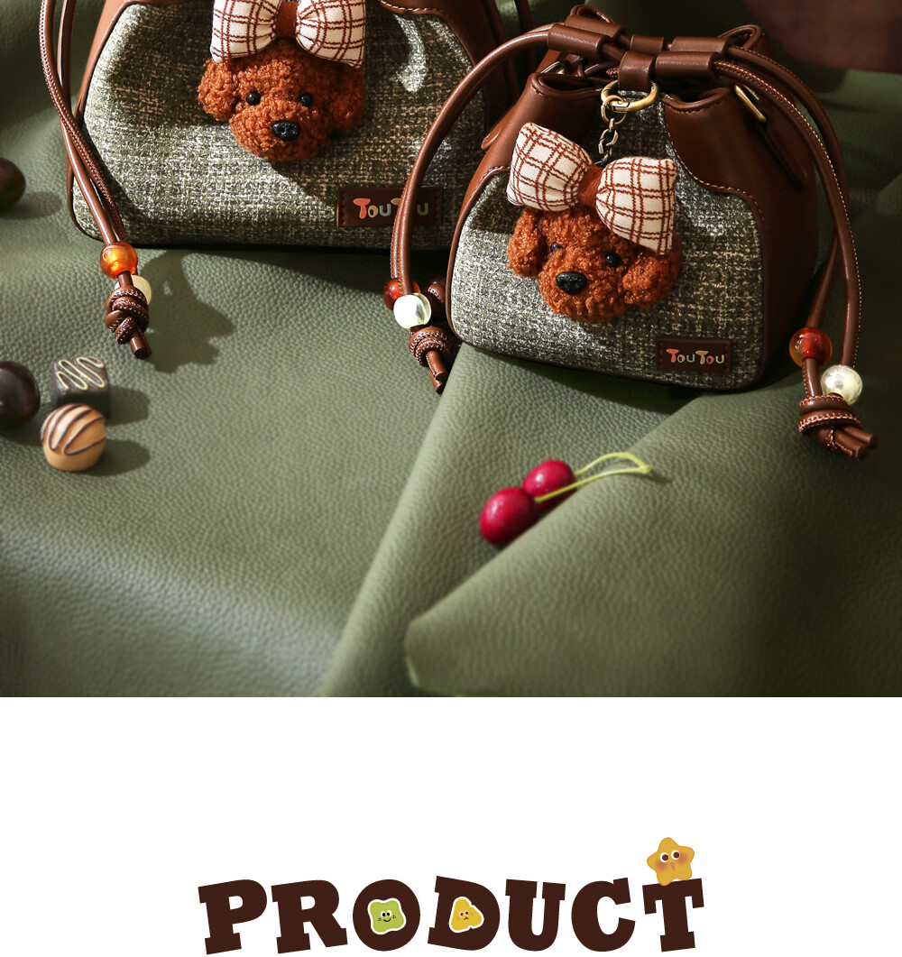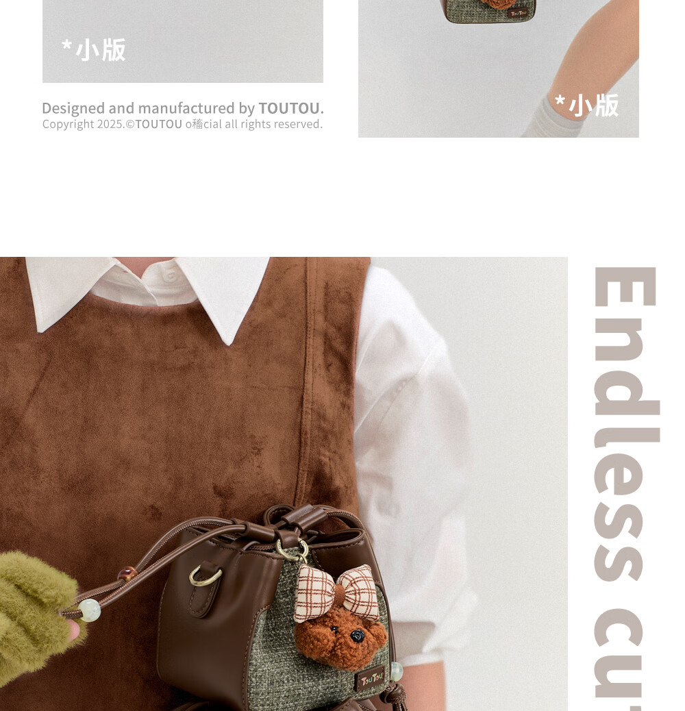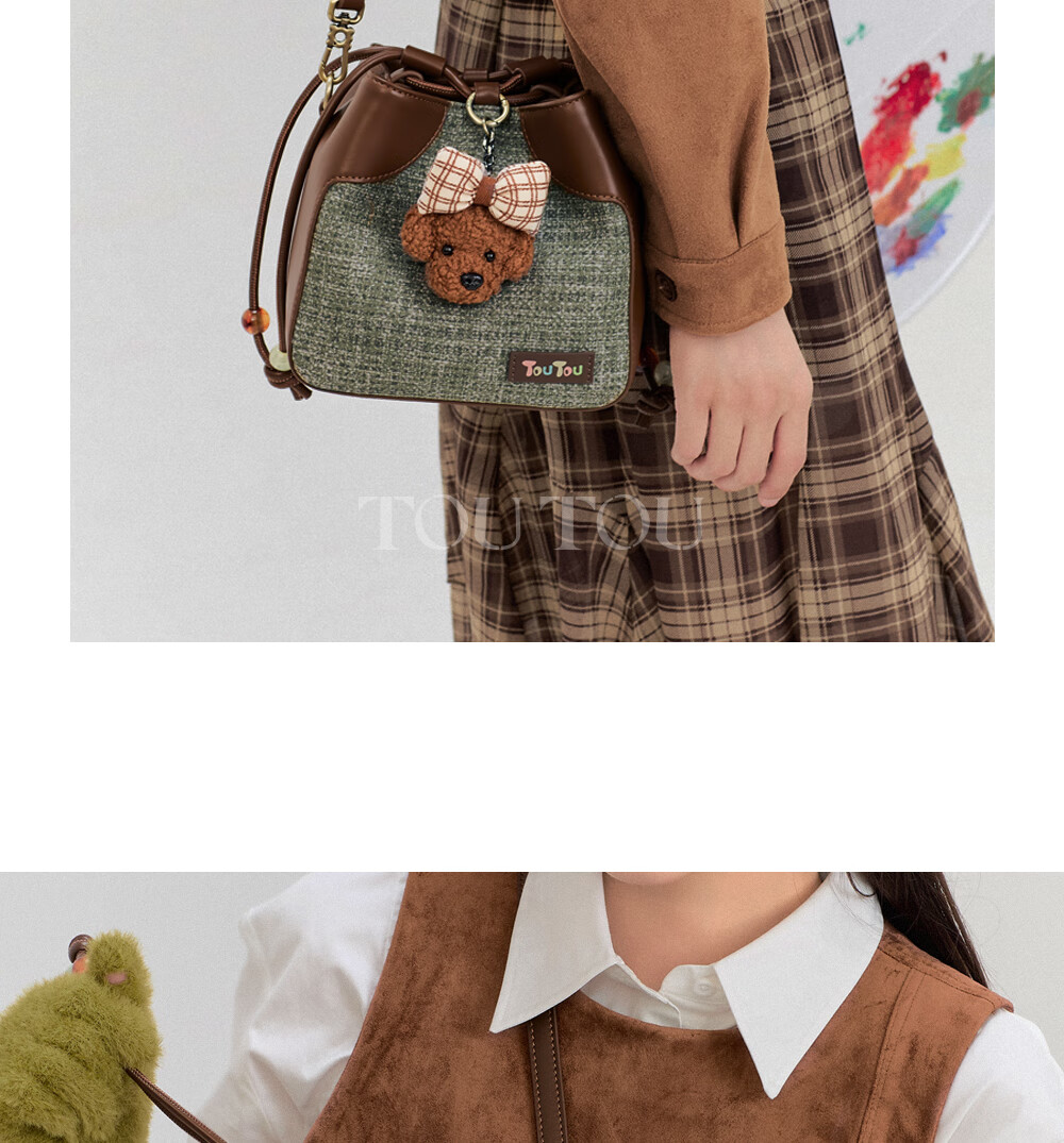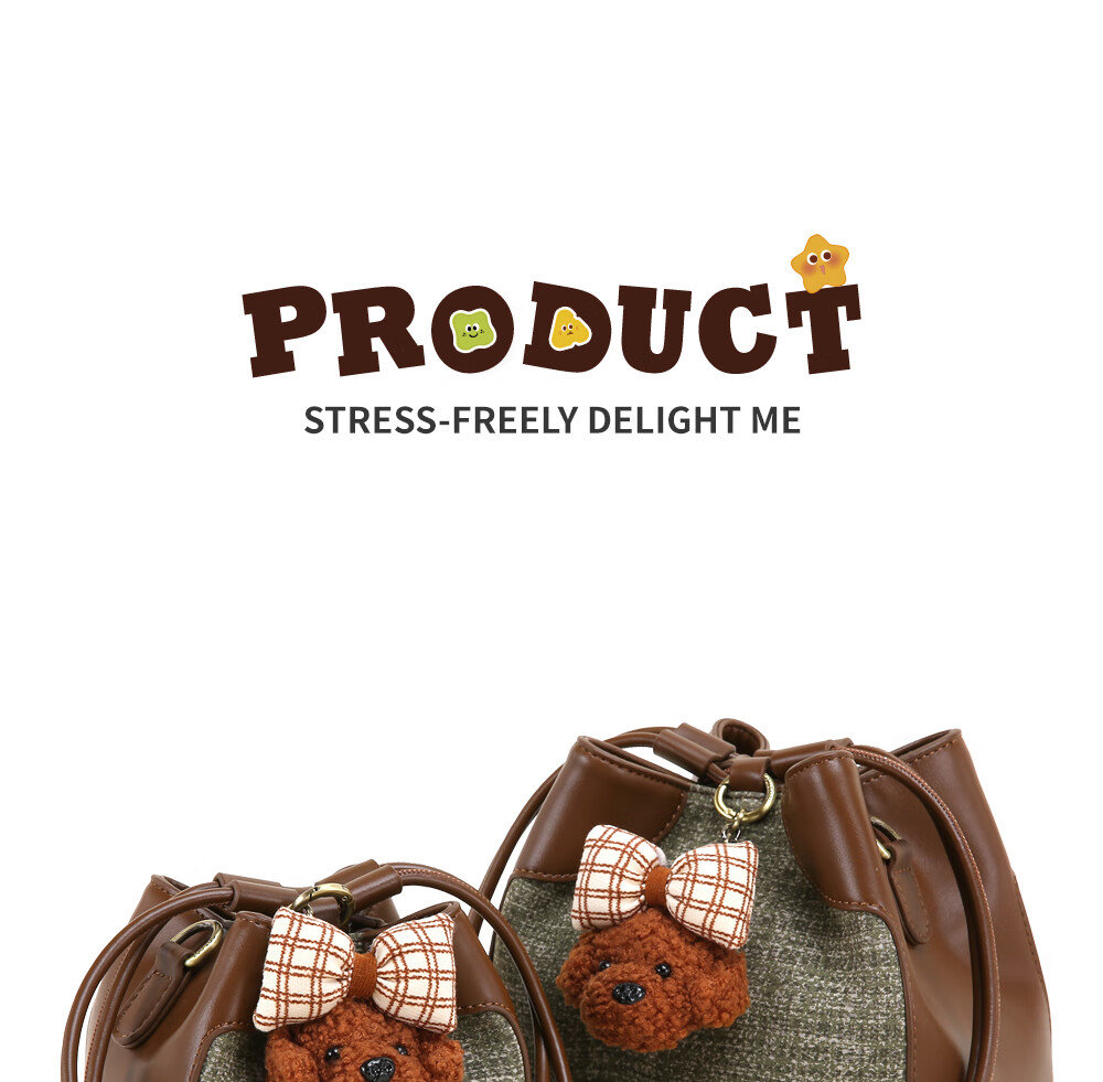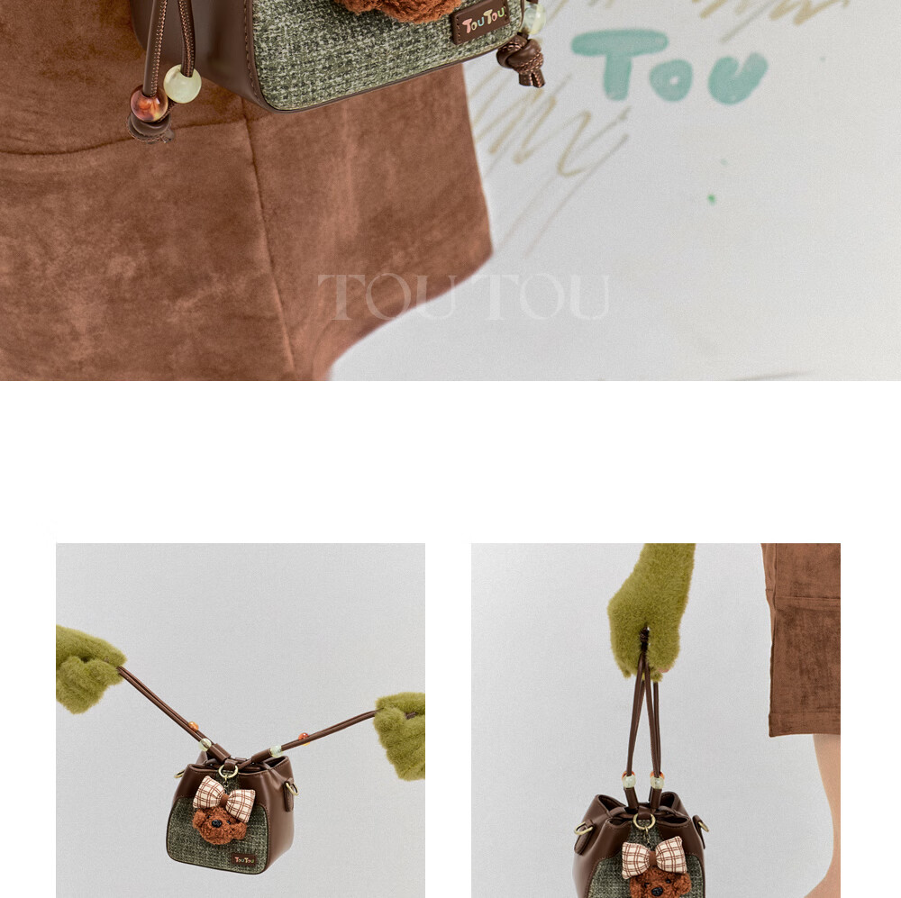 Toutou2025 new bag woolen bucket bag-standard plaid butterfly puppy pendant bucket bag chocolate brown (small version)