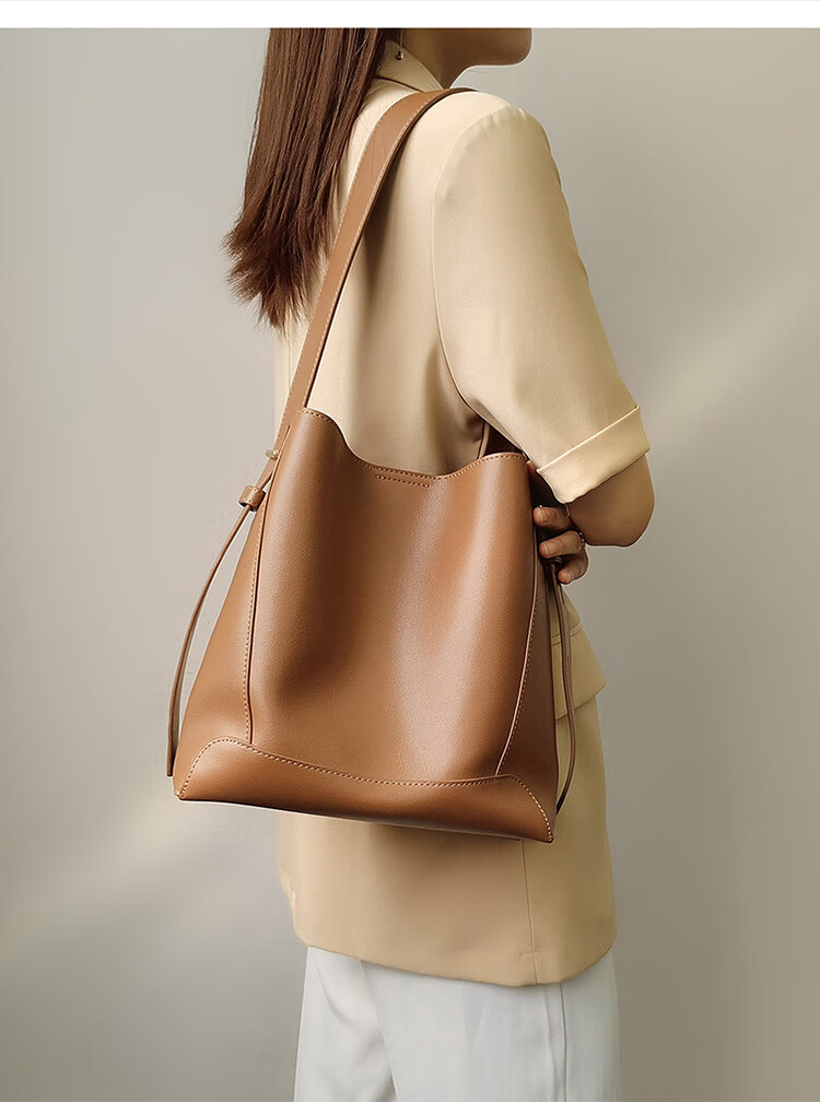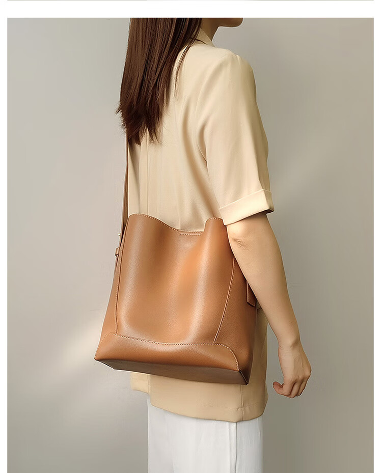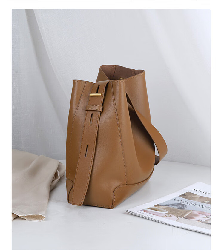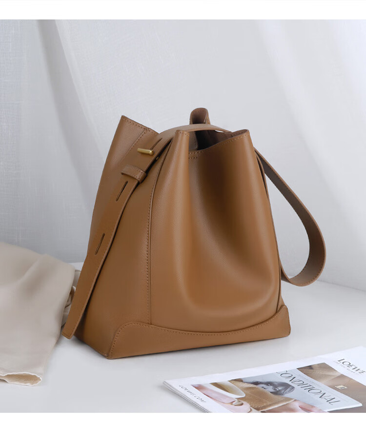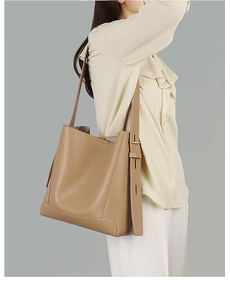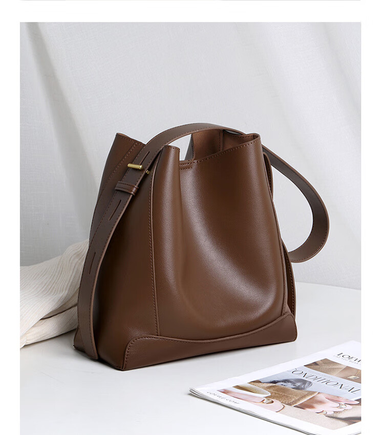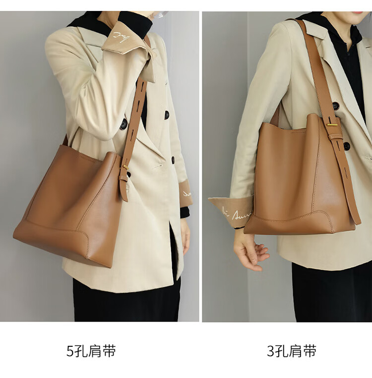 Bucket Bag Women's Large Capacity Lightweight Genuine Leather Bag 2025 New Single Shoulder Crossbody Bag Commuting Tote Senior Mom Milk Tea Brown (3 Hole Shoulder Strap)