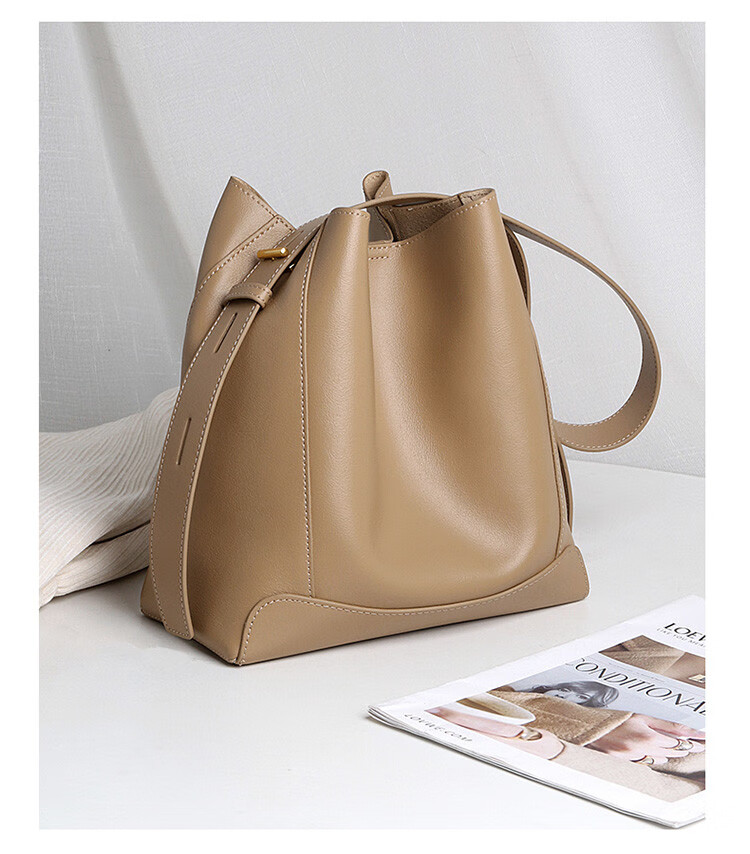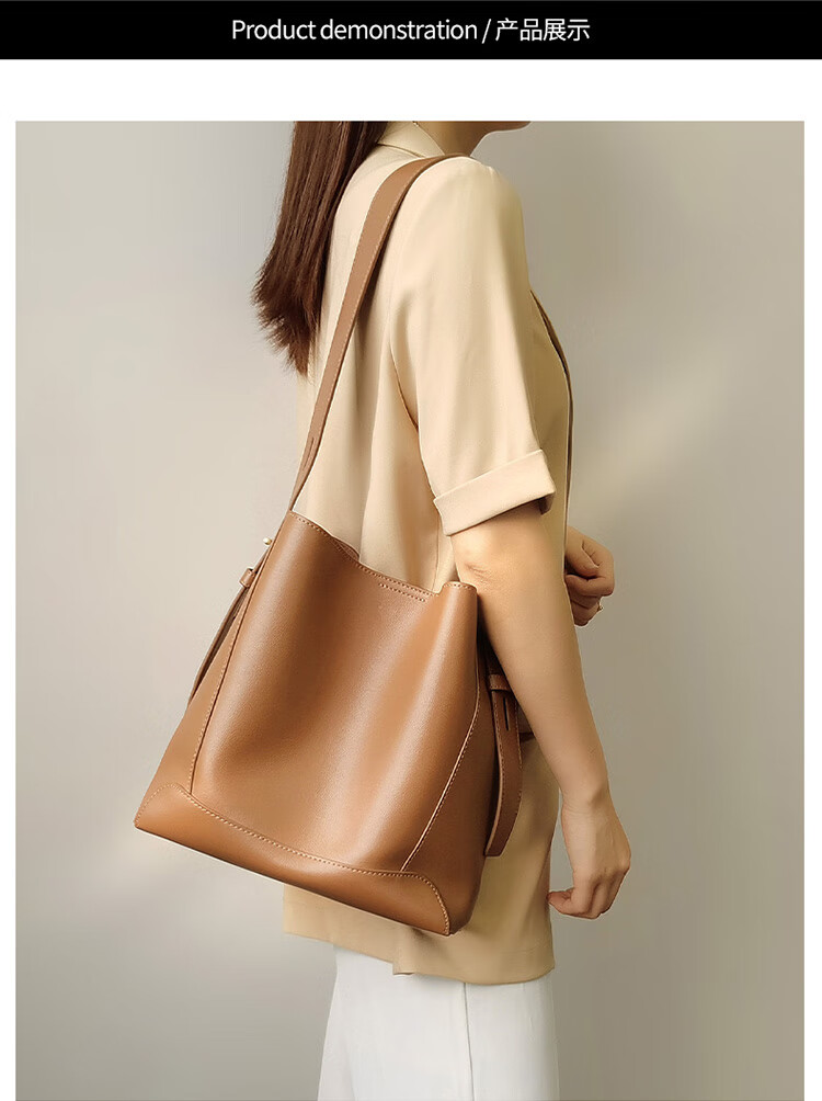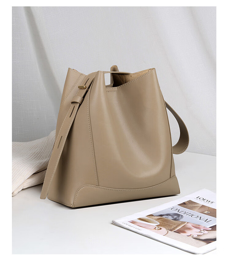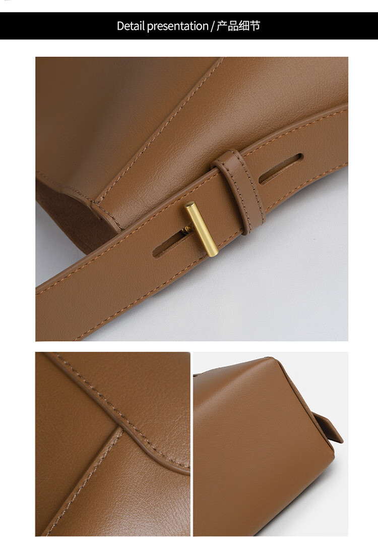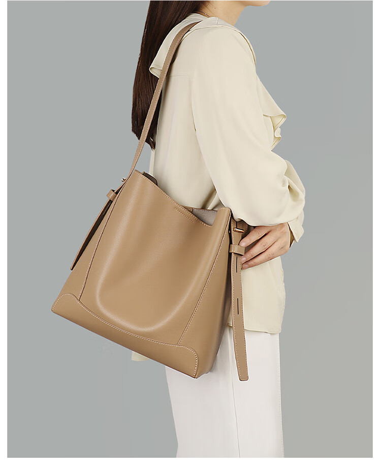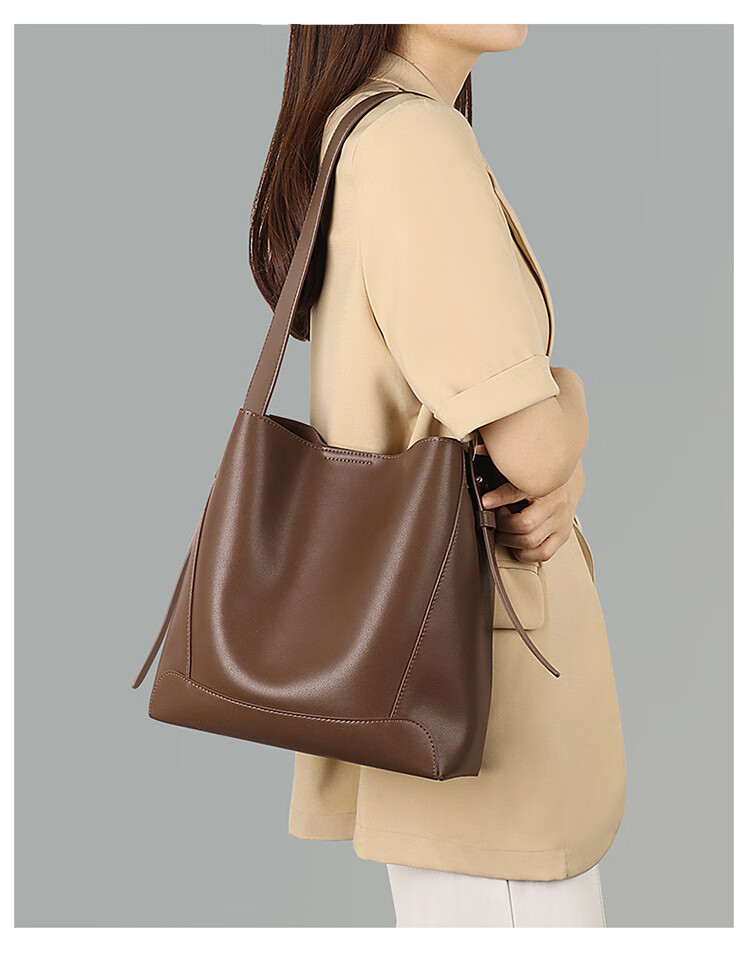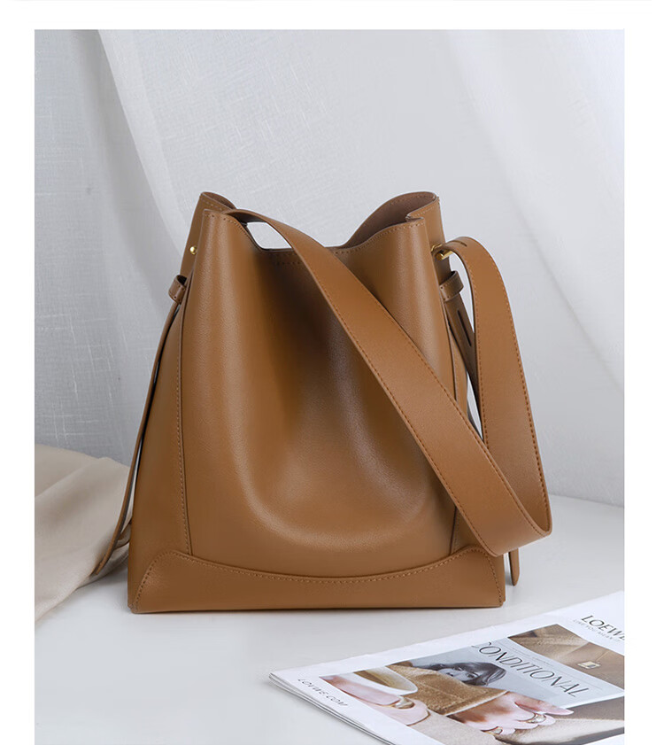Bucket Bag Women's Large Capacity Lightweight Genuine Leather Bag 2025 New Single Shoulder Crossbody Bag Commuting Tote Senior Mom Milk Tea Brown (3 Hole Shoulder Strap)