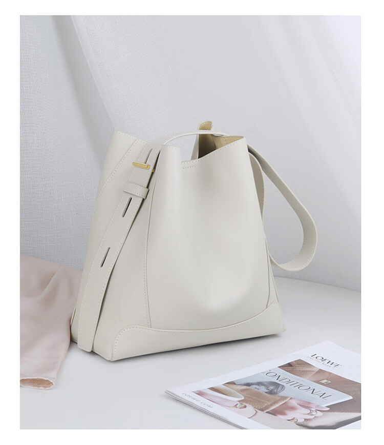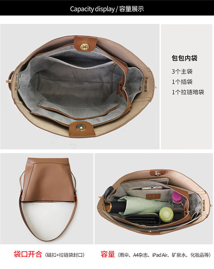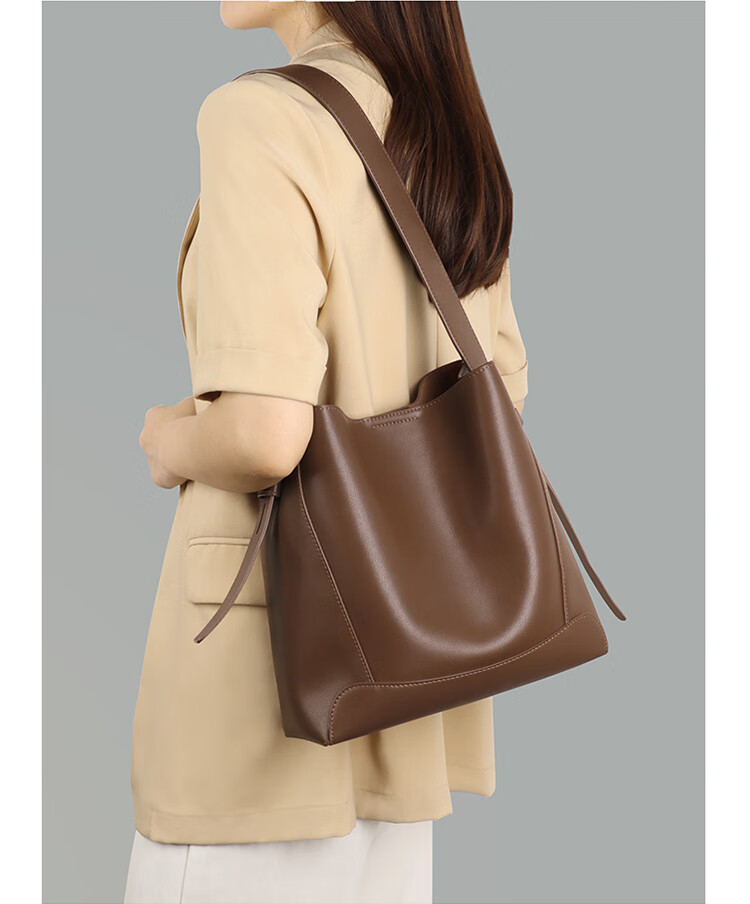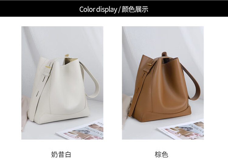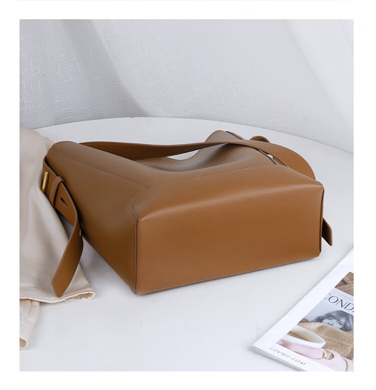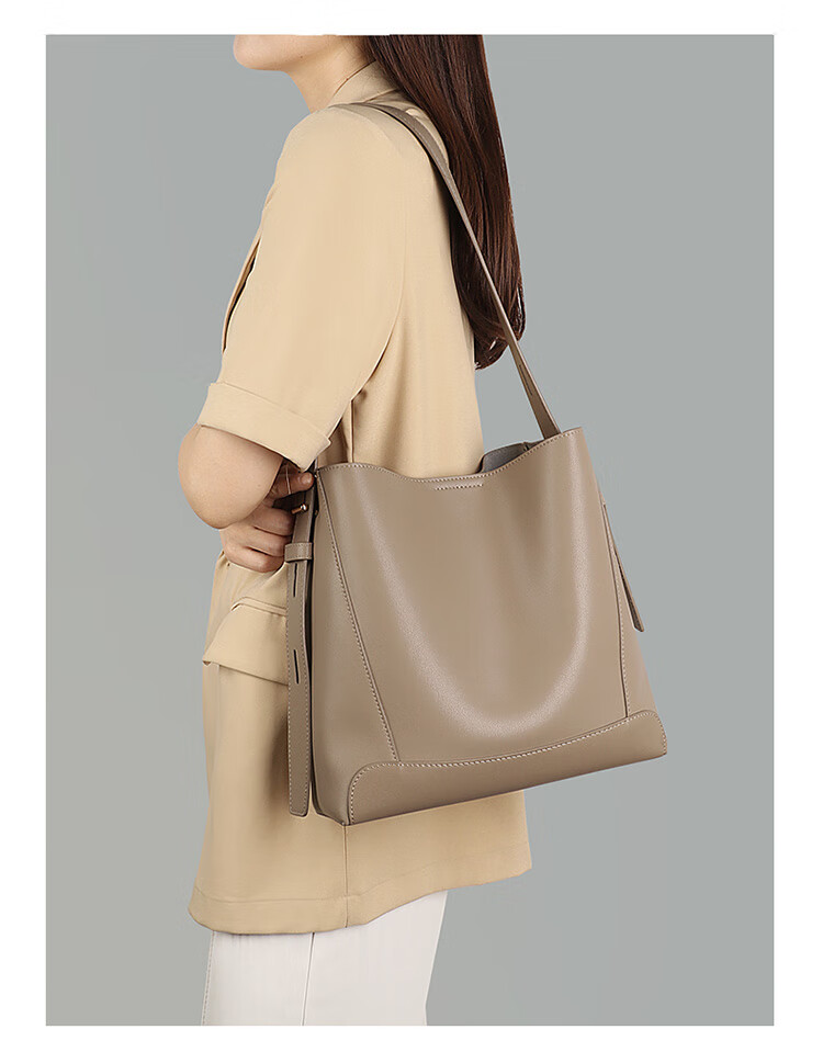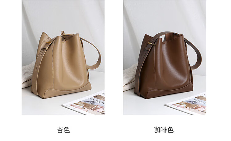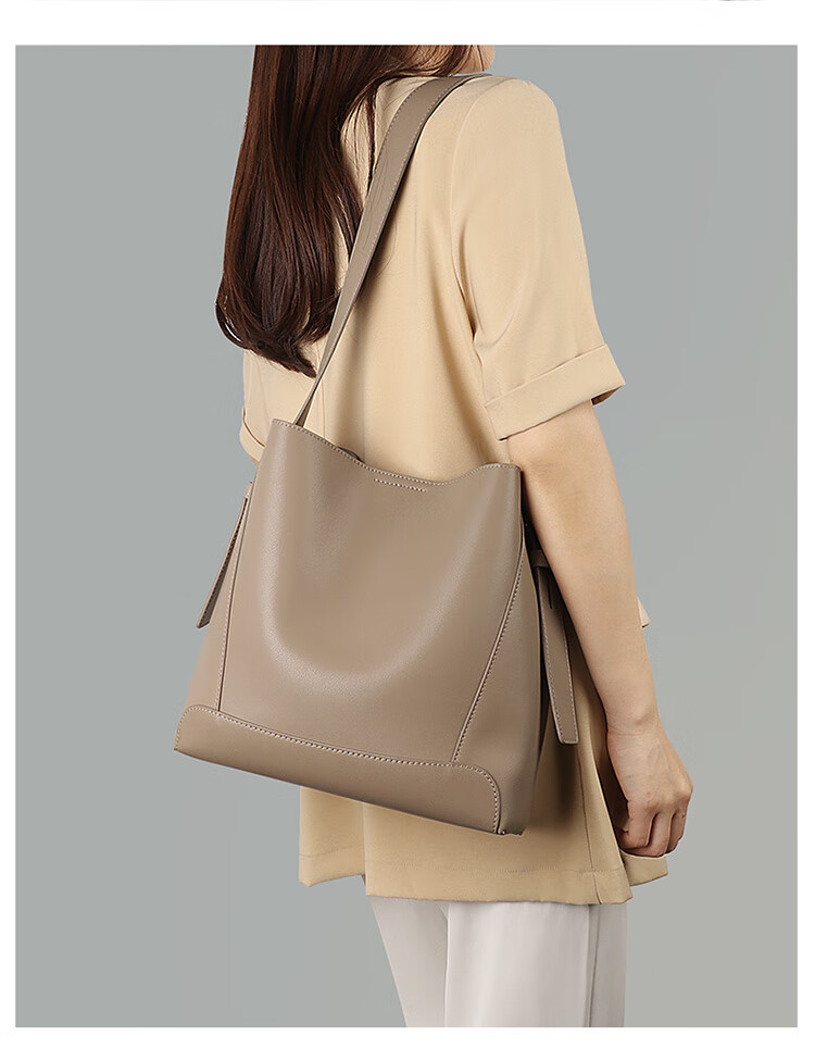 Bucket Bag Women's Large Capacity Lightweight Genuine Leather Bag 2025 New Single Shoulder Crossbody Bag Commuting Tote Senior Mom Milk Tea Brown (3 Hole Shoulder Strap)