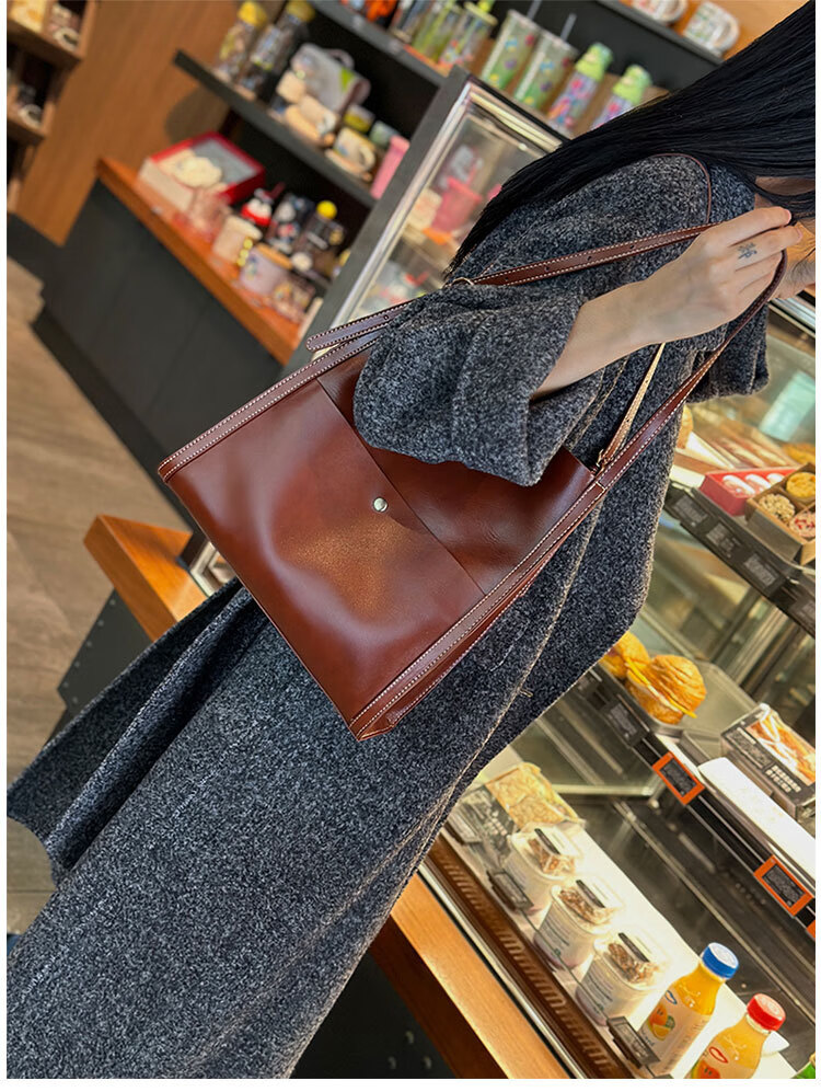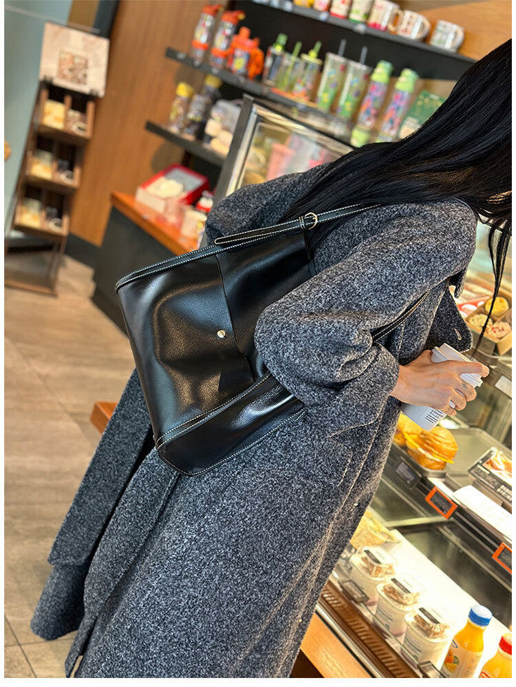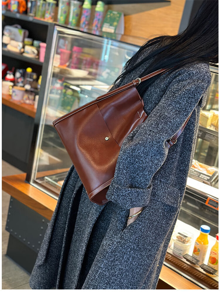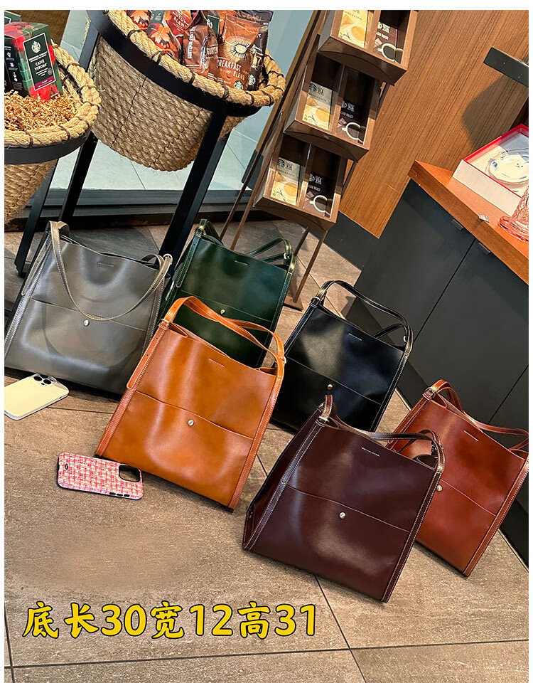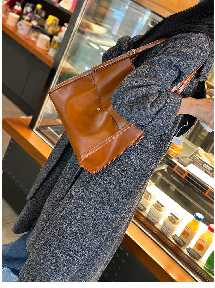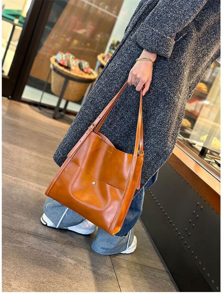 Japanese Tote Bag Women's Large Capacity 2025 Spring and Summer New Commuting Genuine Leather Women's Bag Bucket Bag Versatile Cowhide Shoulder Sunset Yellow