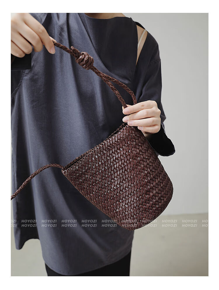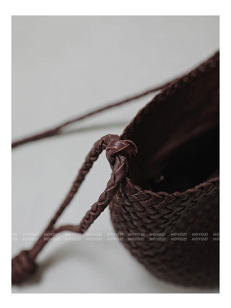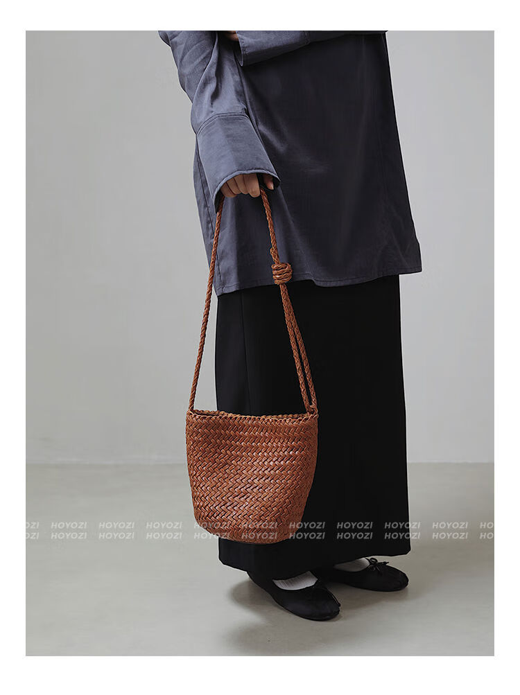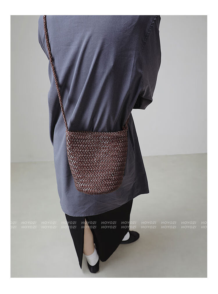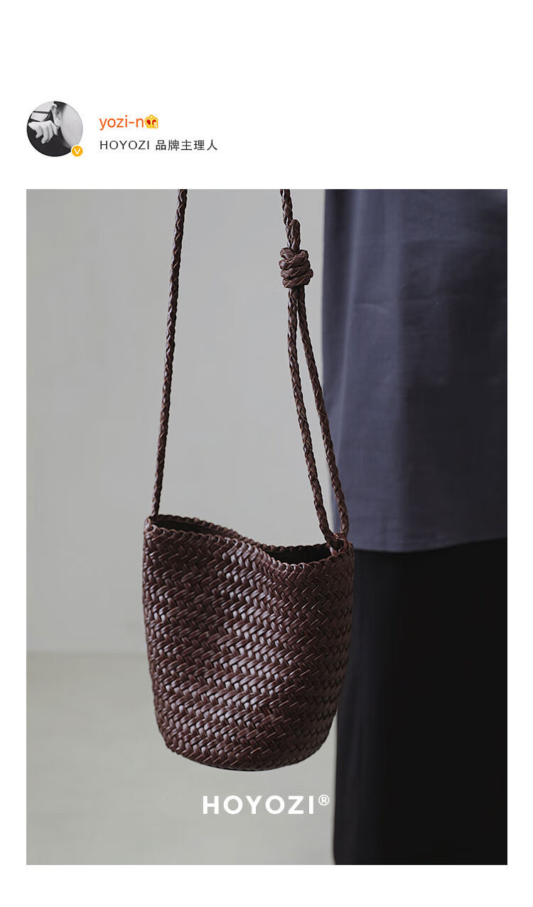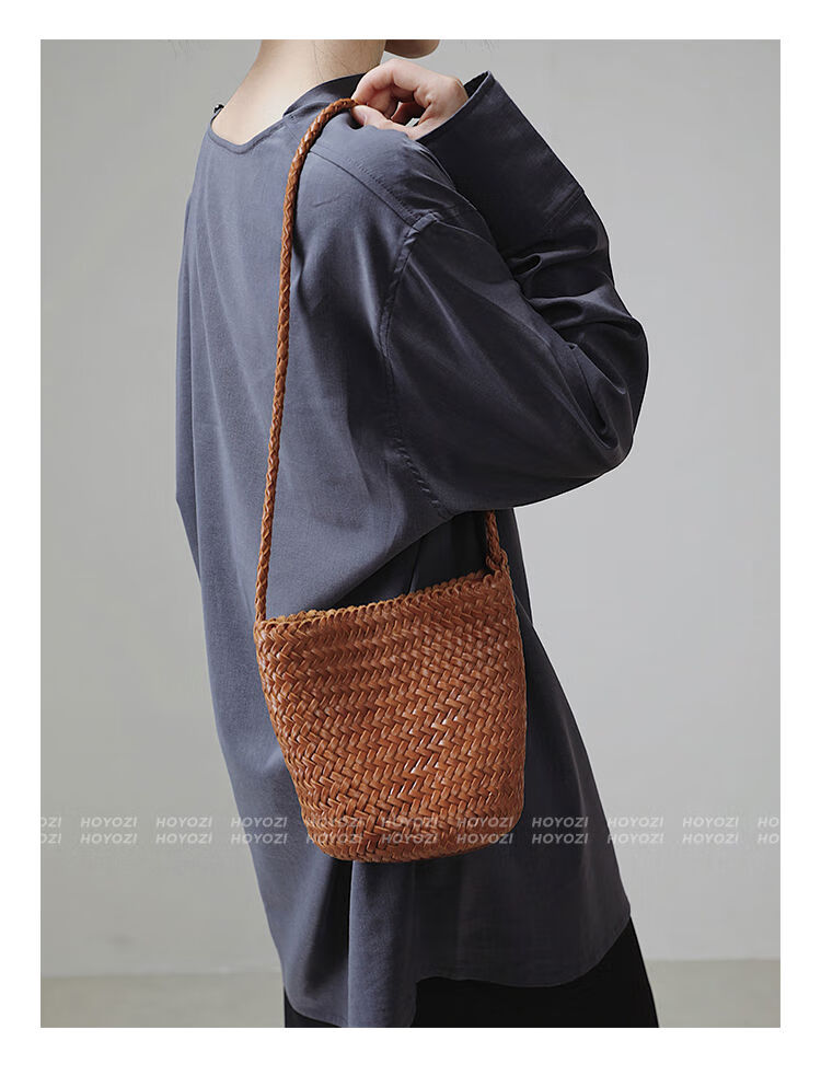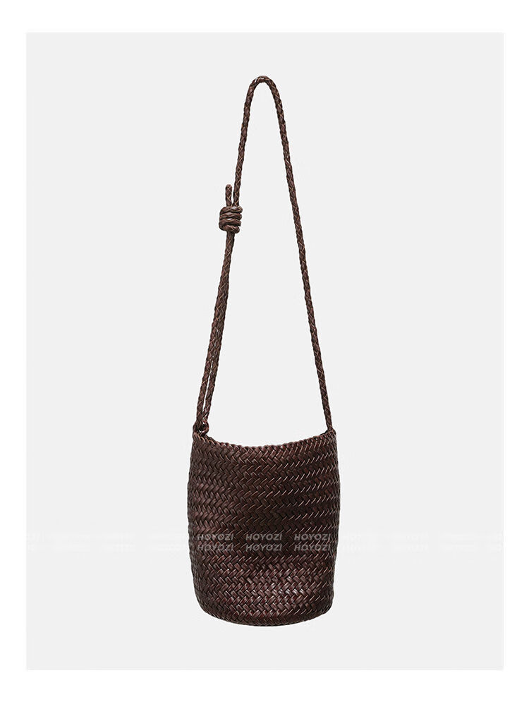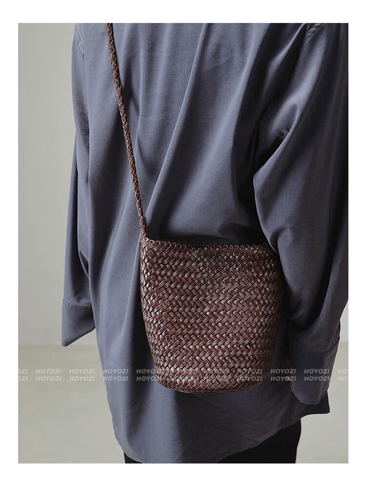 HOYOZI first-layer cowhide hand-woven bag women's summer shoulder crossbody bucket bag coffee color pre-sale first-order first-layer cowhide, purely hand-woven