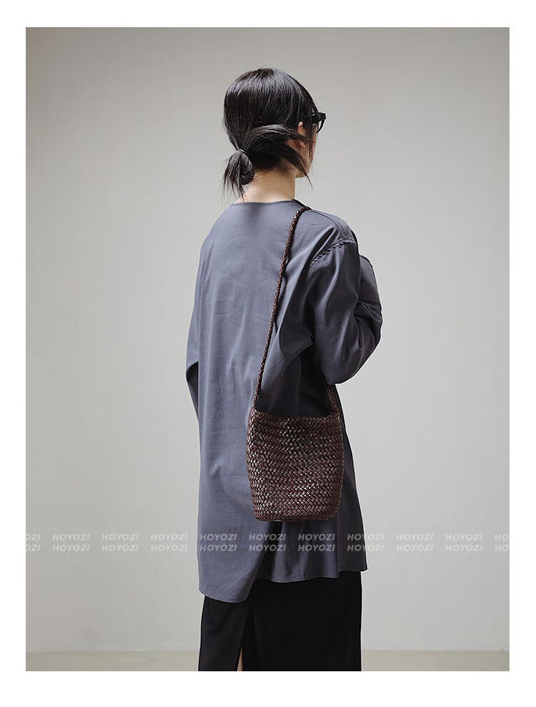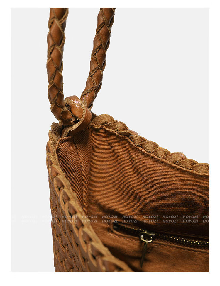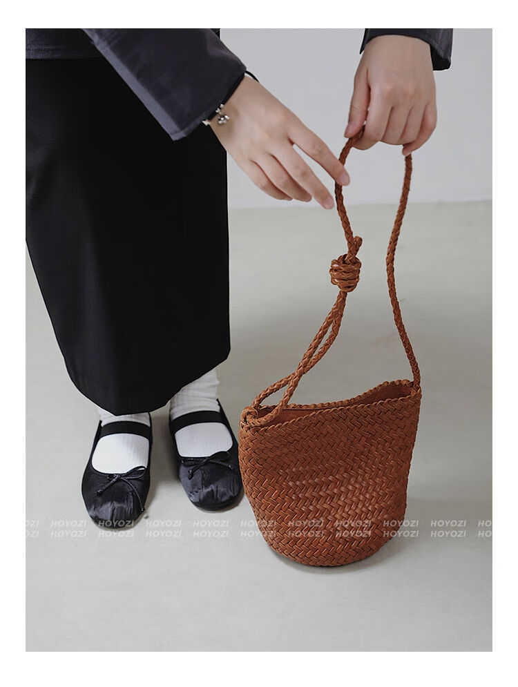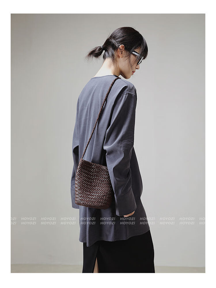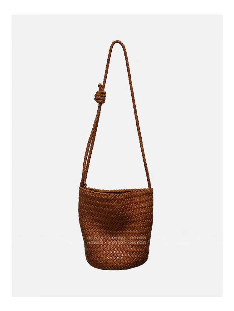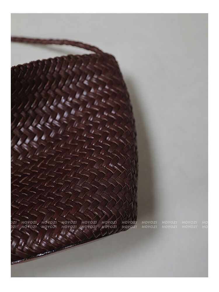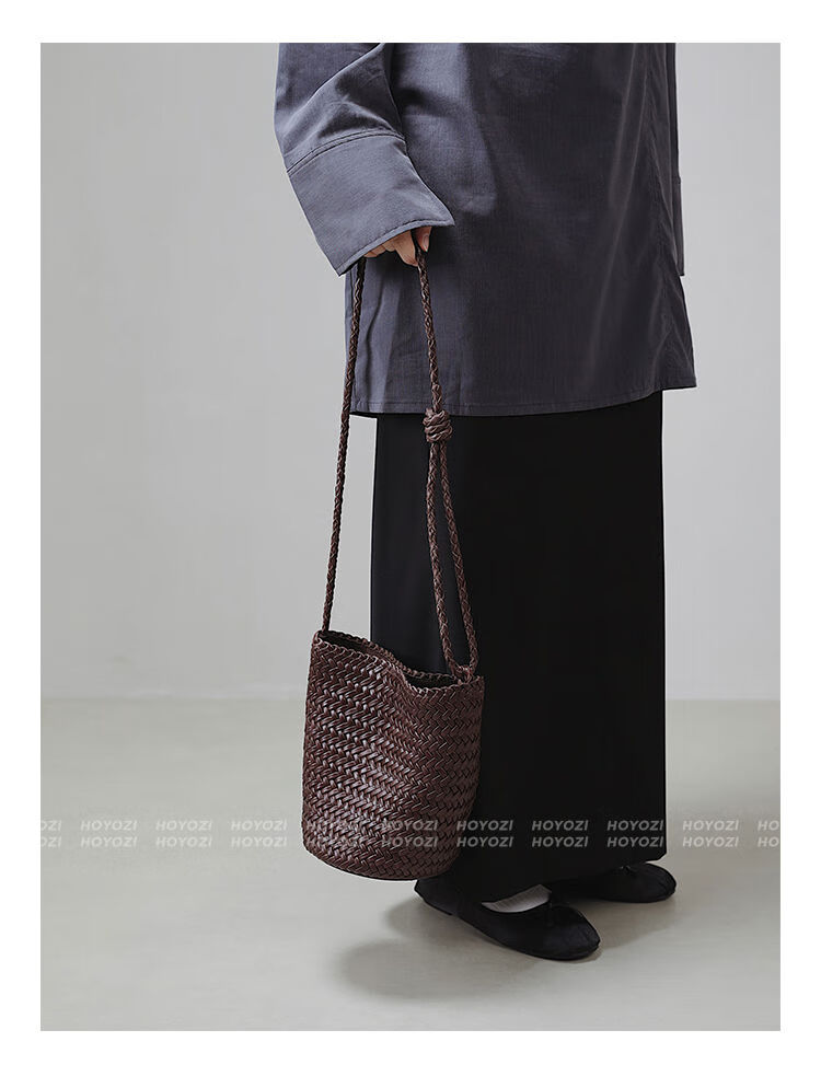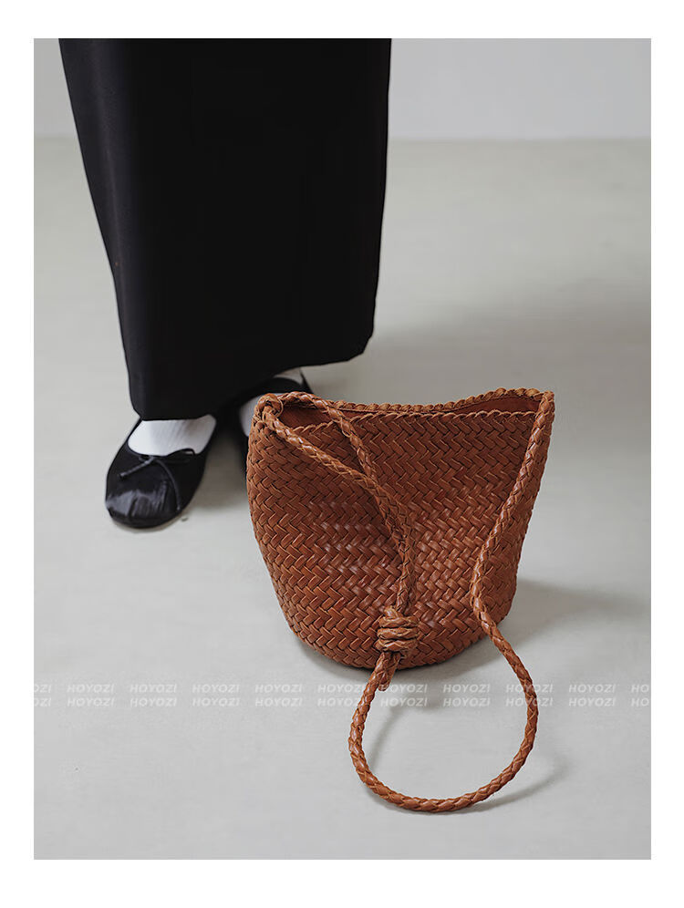HOYOZI first-layer cowhide hand-woven bag women's summer shoulder crossbody bucket bag coffee color pre-sale first-order first-layer cowhide, purely hand-woven