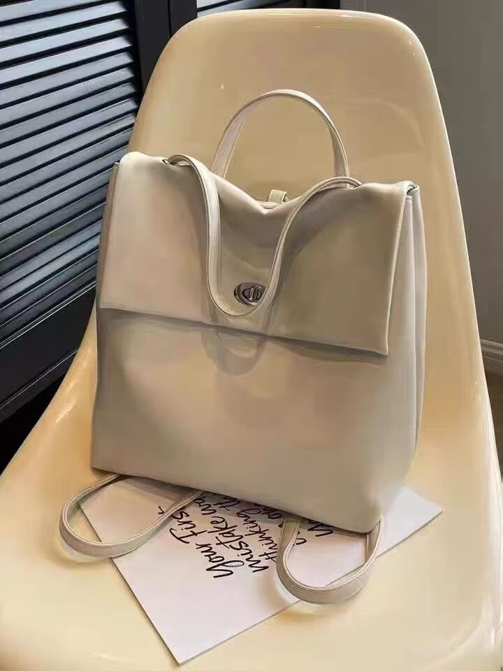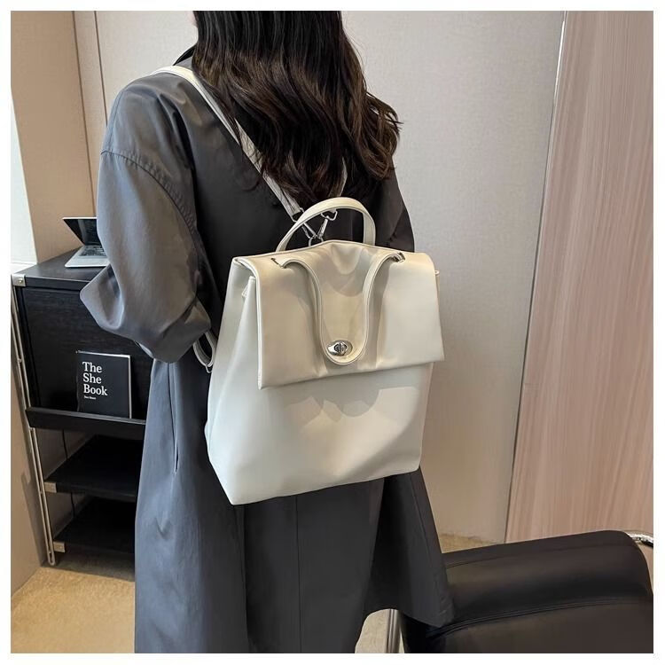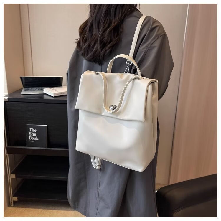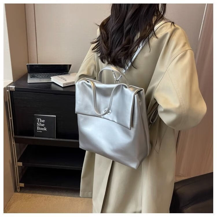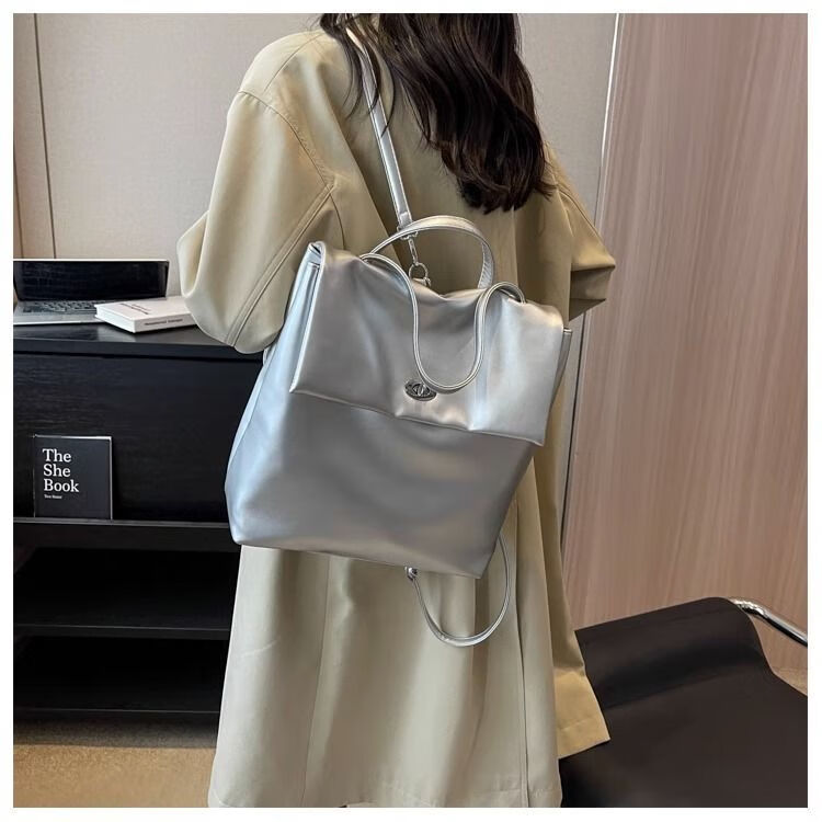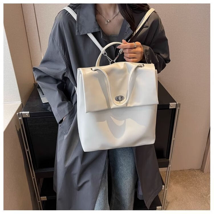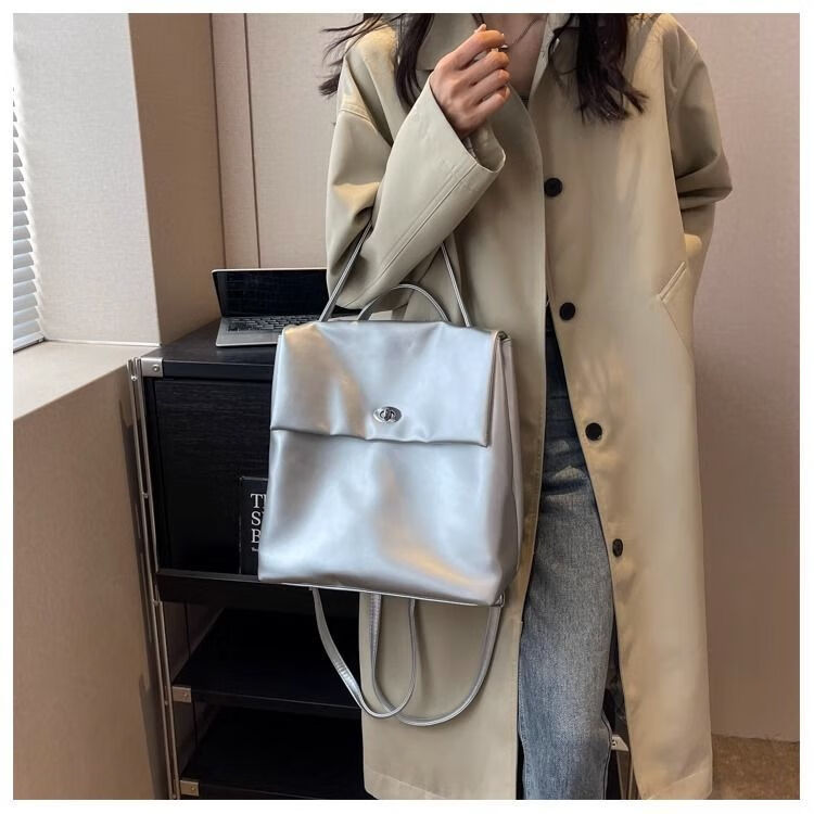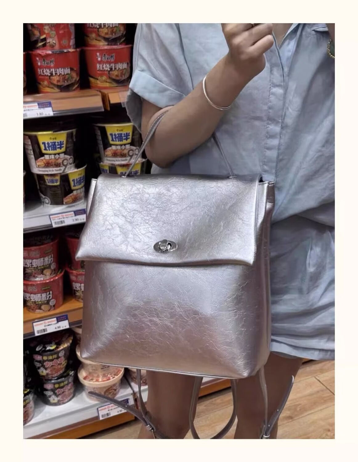Korean niche silver waxed leather backpack for women, versatile large capacity student commuter school bag, travel backpack, white