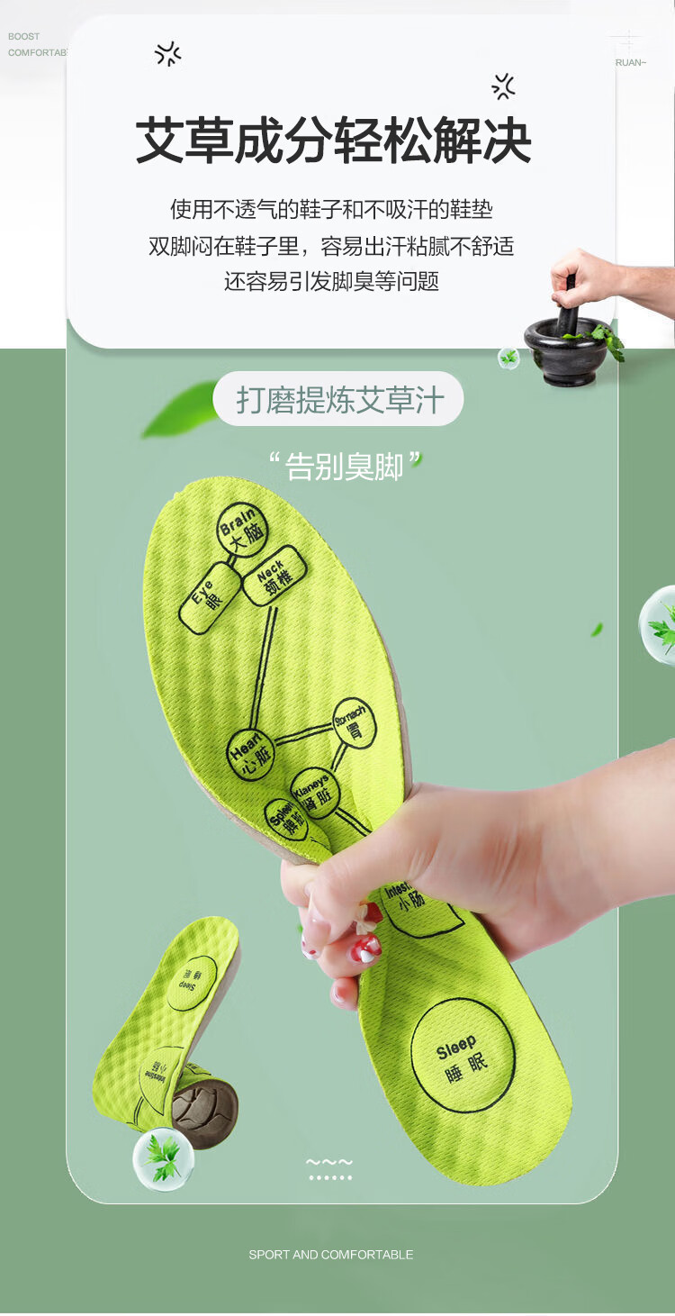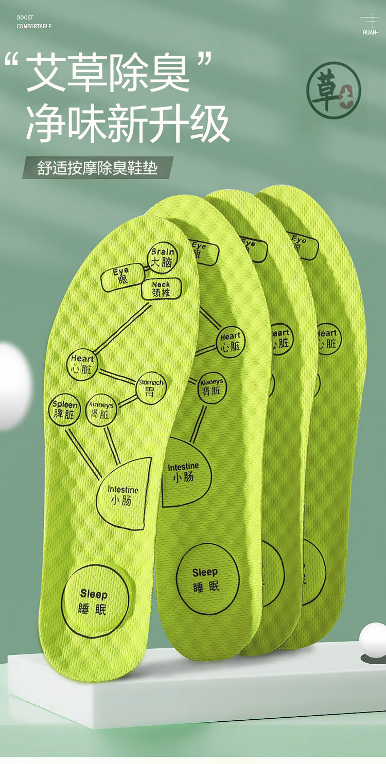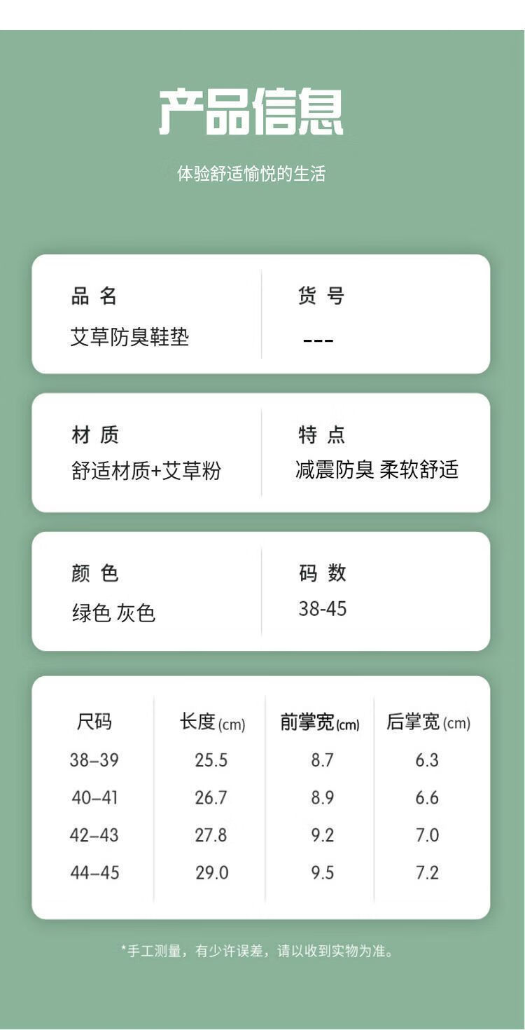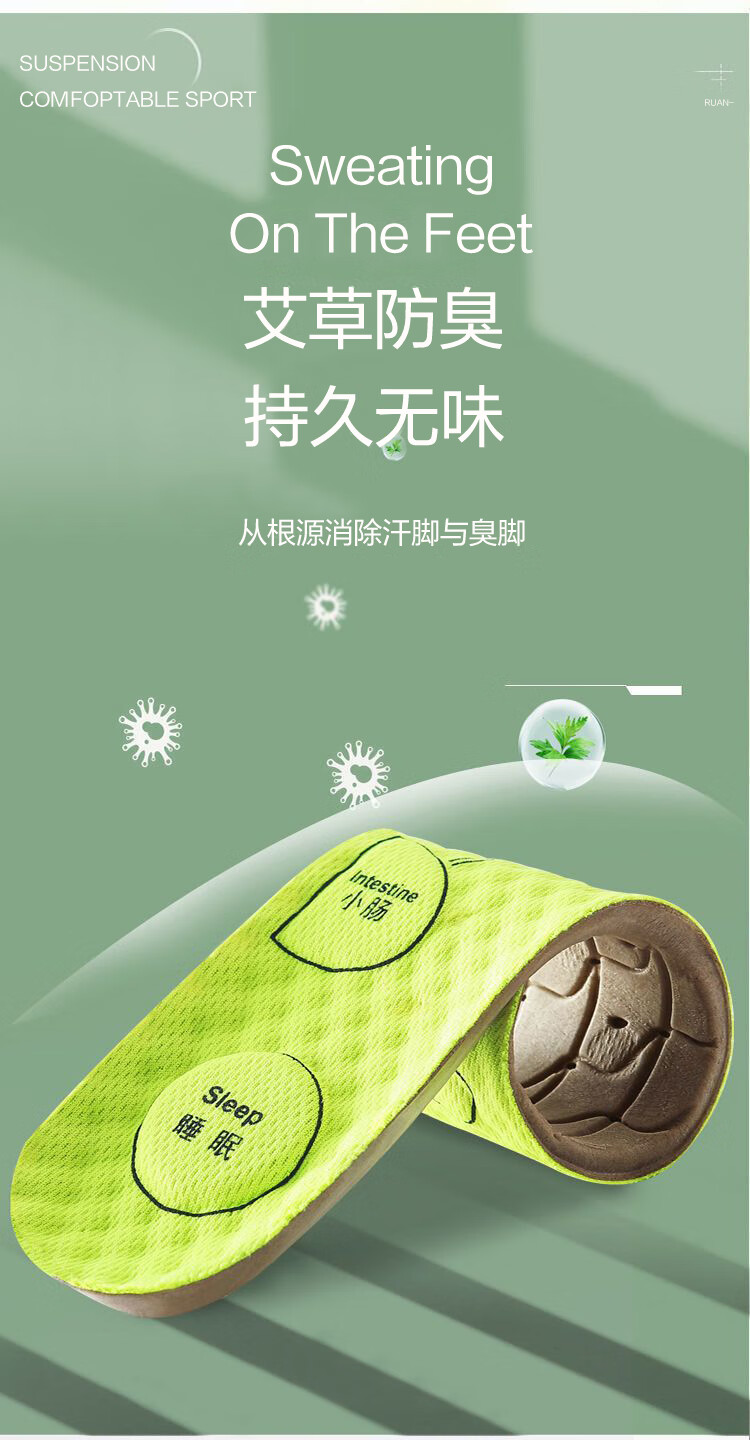 Mugwort anti-odor breathable insoles for men and women, high elasticity, shock absorption, anti-pain, massage, comfortable, soft, sweat-absorbent sports insoles, 2 pairs, soft-soled massage, sweat-absorbent and anti-odor/green, 43-44, can be cut