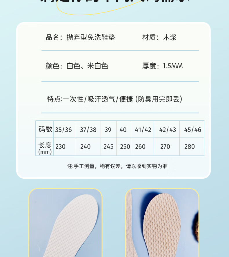 Disposable wood pulp insoles, sweat-absorbent, deodorant and breathable, ultra-thin single shoes, high heels for women's bare feet, anti-slip and sweat-absorbent 43-44, cuttable, hygienic wood pulp + sweat-absorbent and breathable, 2 pairs in total