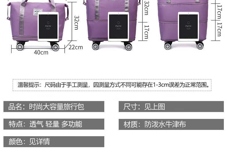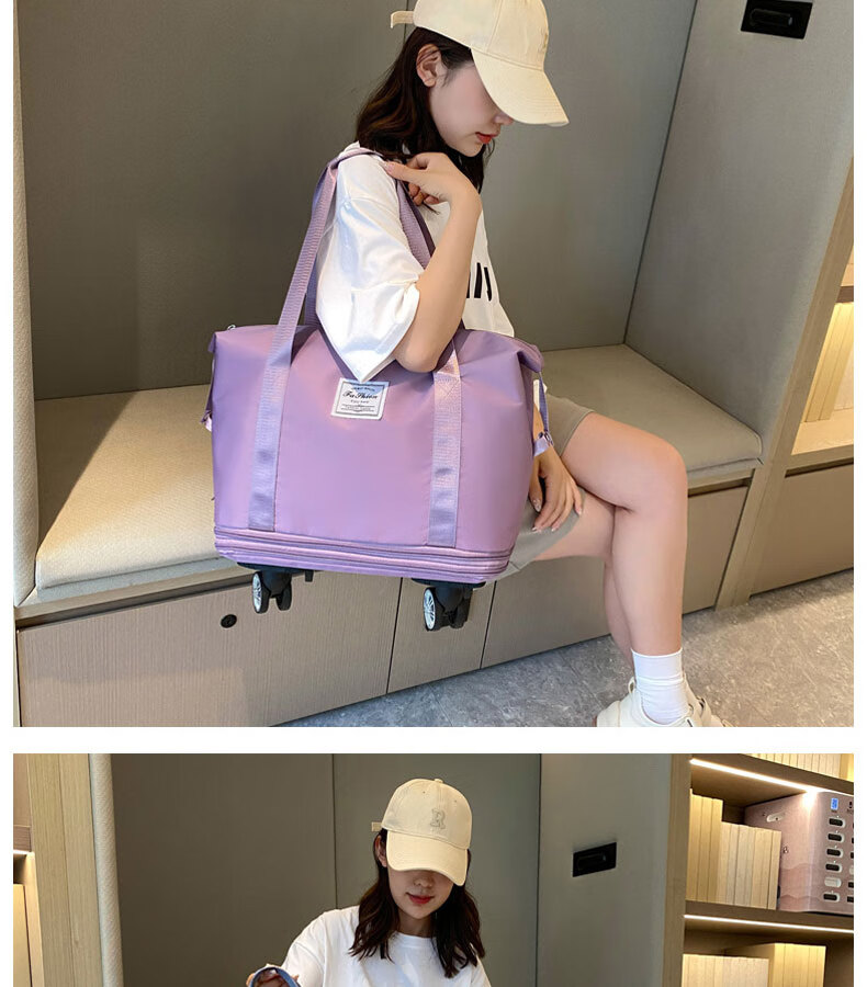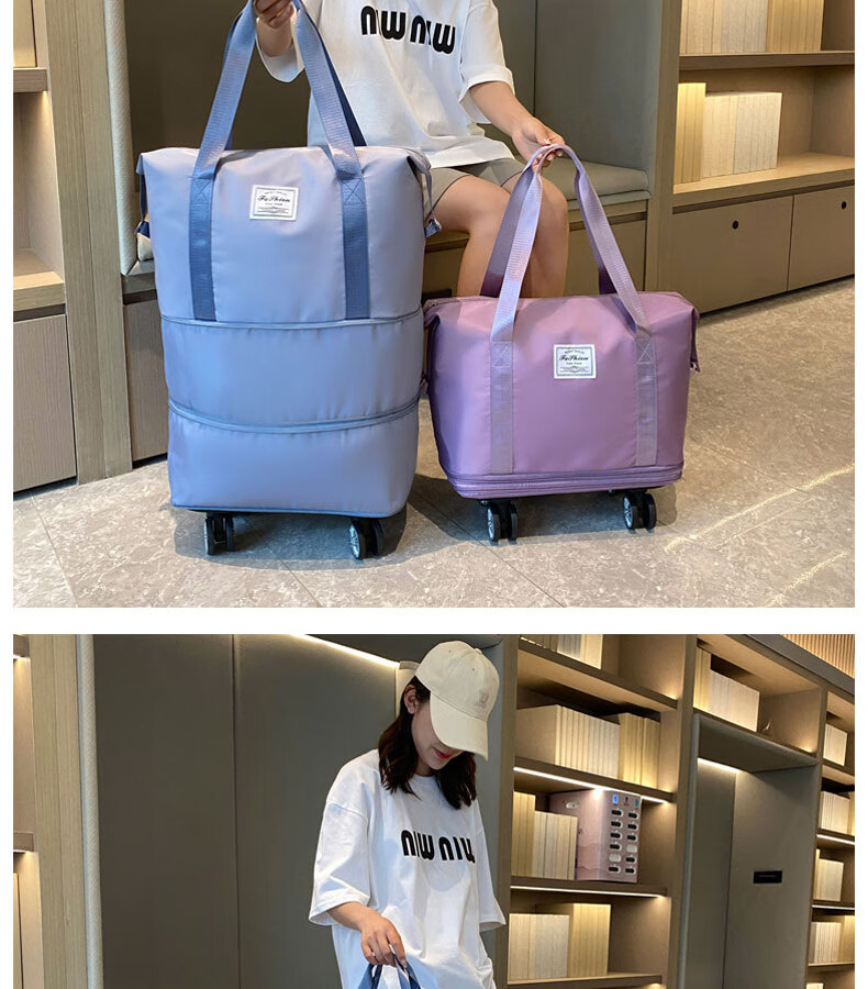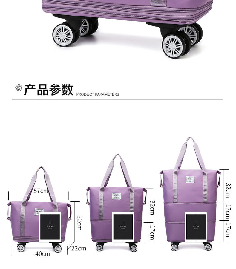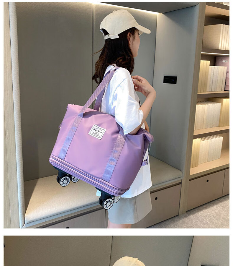 HUAJI Travel Storage Bag Foldable Hand-held Trolley Bag with Wheels Dry and Wet Separation Storage Bag Expandable Duffel Bag Black