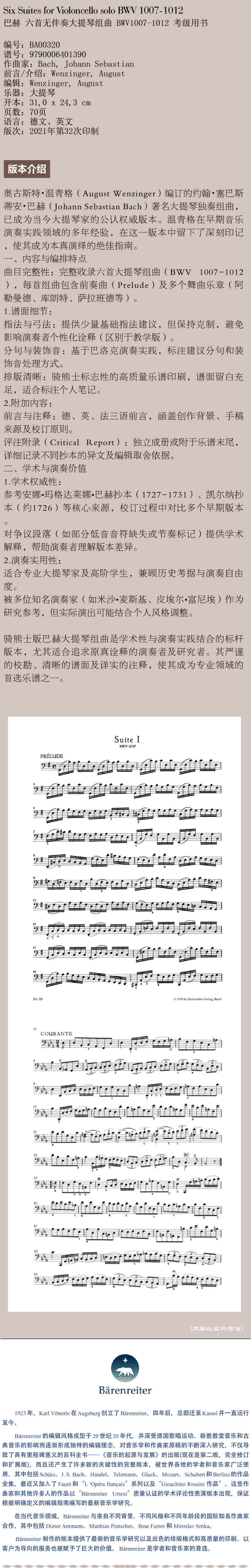 骑熊士原版 巴赫 六首无伴奏大提琴组曲 BWV1007-1012 考级用书 Bach Six Suites for Violoncello solo BWV 1007-1012 BA320-15