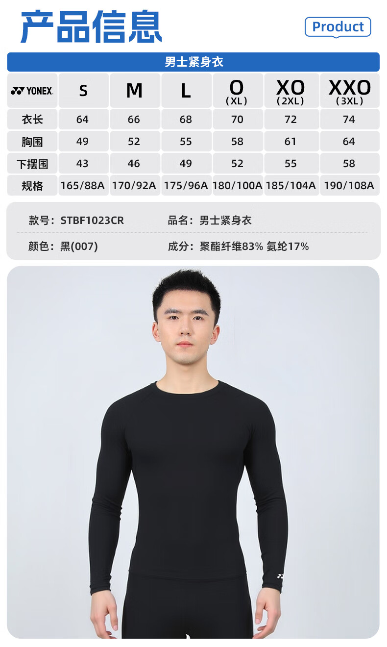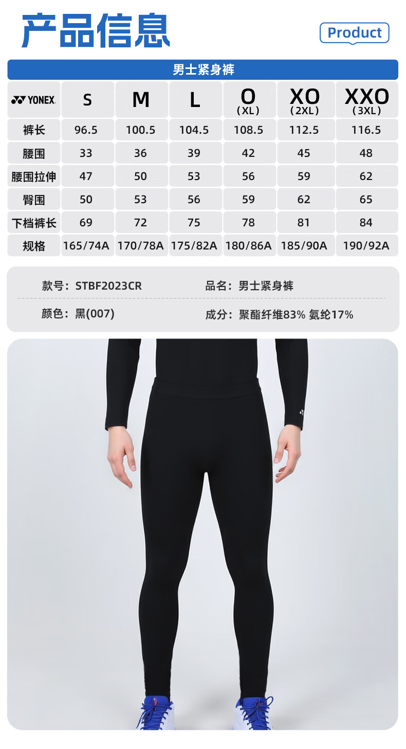 尤尼克斯(YONEX)羽毛球服男长袖紧身衣打底保暖瑜伽运动锻炼训练服上衣STBF1023CR 【紧身长裤】STBF2023CR黑色 XL
