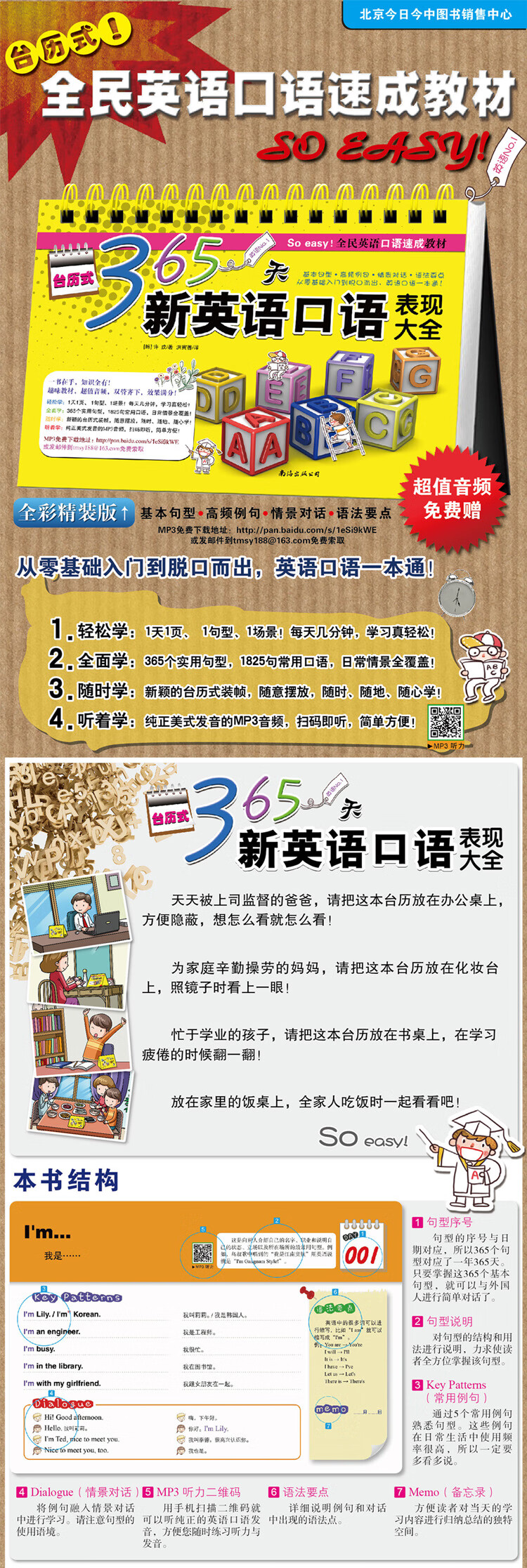 365-Tage-Leitfaden für neue englischsprachige Leistungen im Kalenderstil. Grundlegende Satzmuster + hochfrequente Beispiele + situative Dialoge + Grammatikpunkte. Scannen, zuhören und sprechen. Sprechen Sie mutig. So einfach!