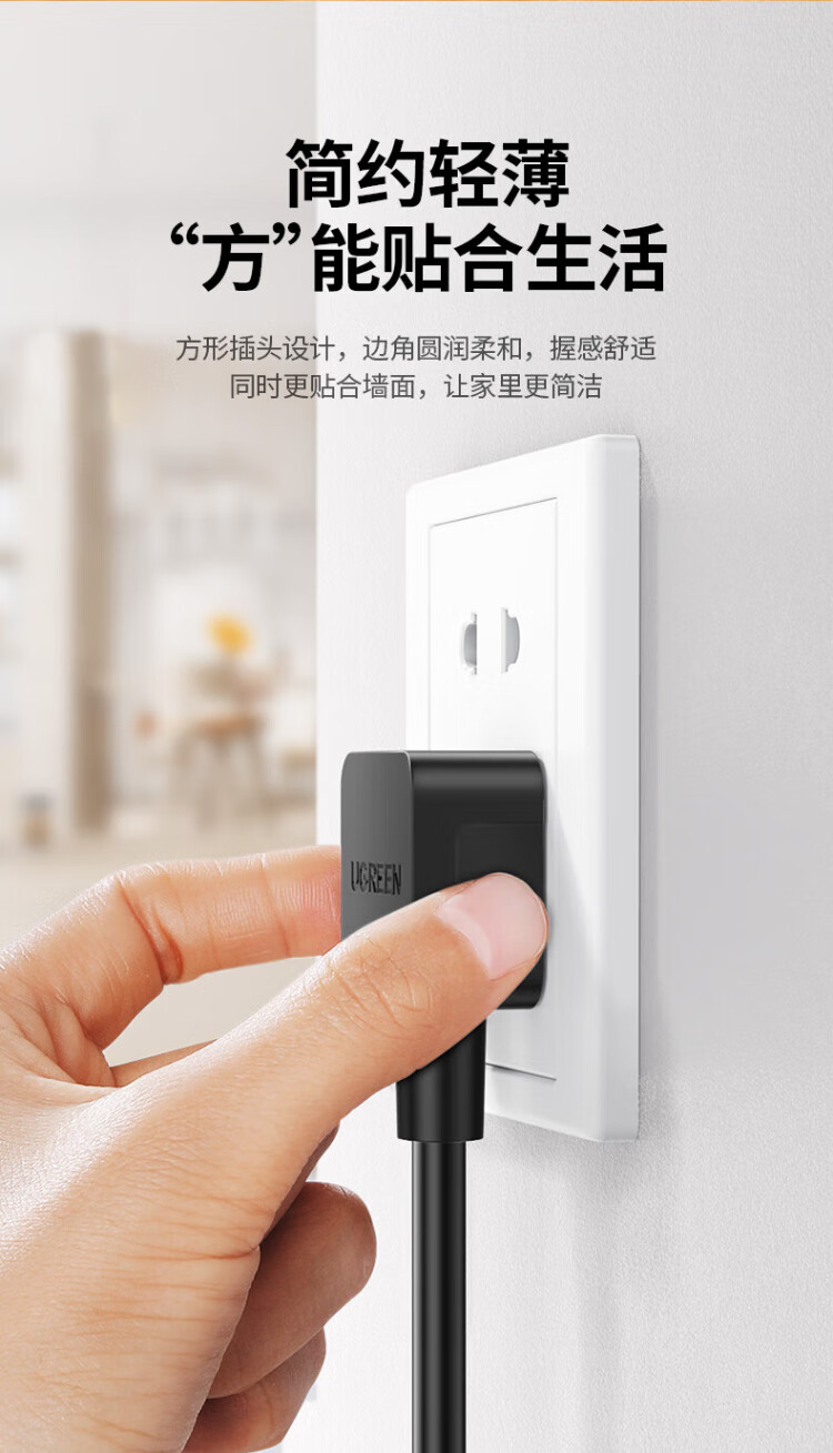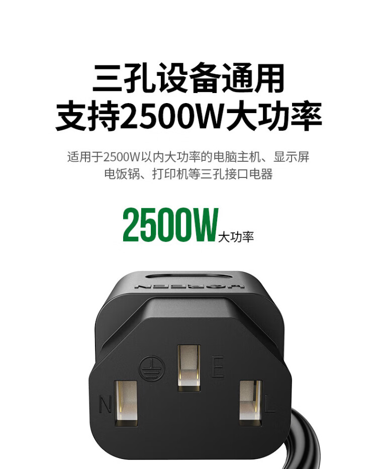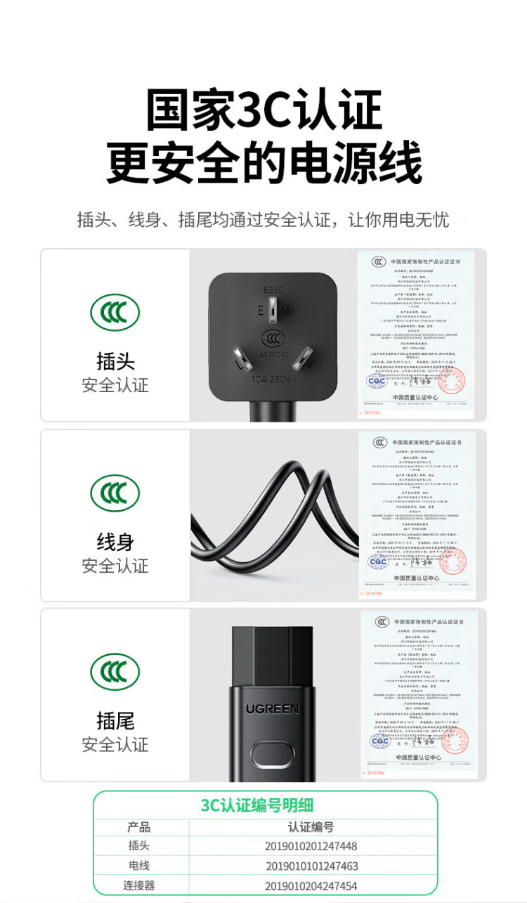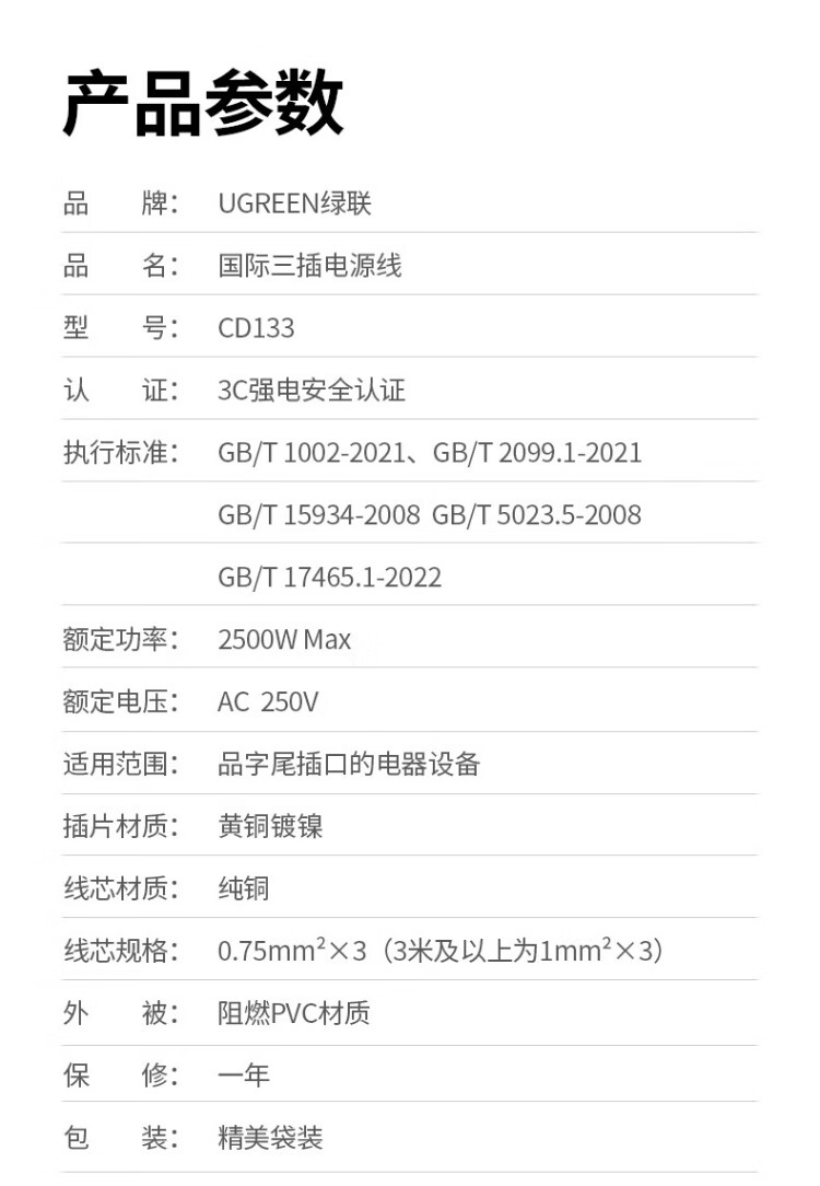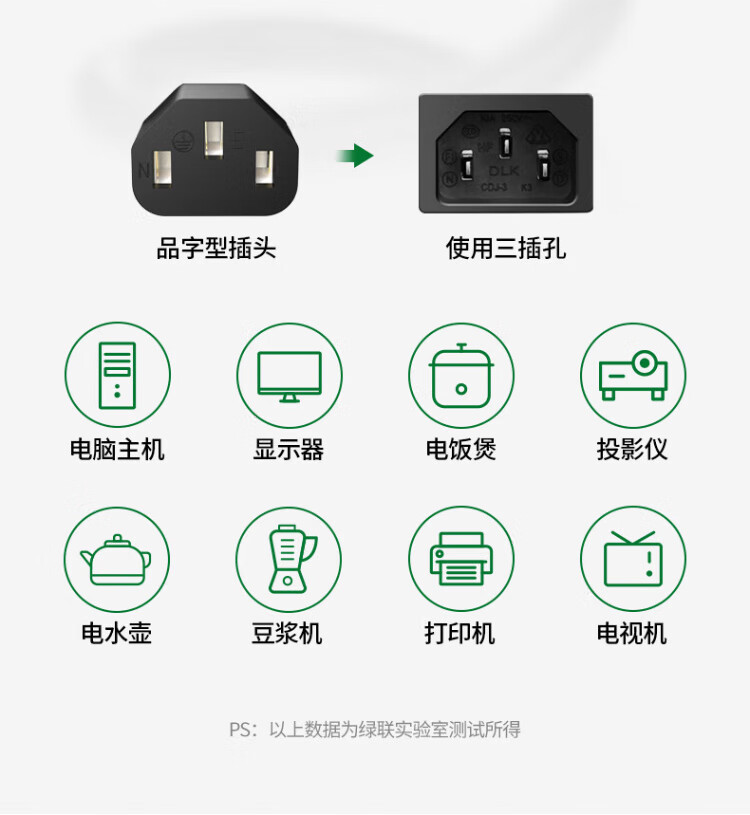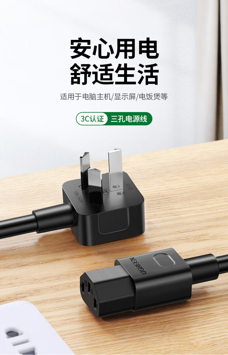 绿联国标三孔品字尾 三芯电源线 适用电脑台式主机显示器电炒锅电饭煲电子秤打印机连接线2米 30566