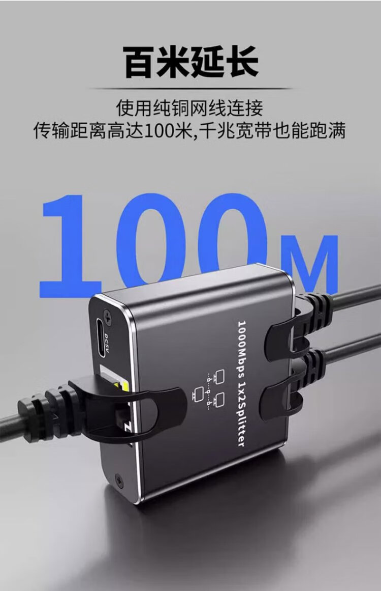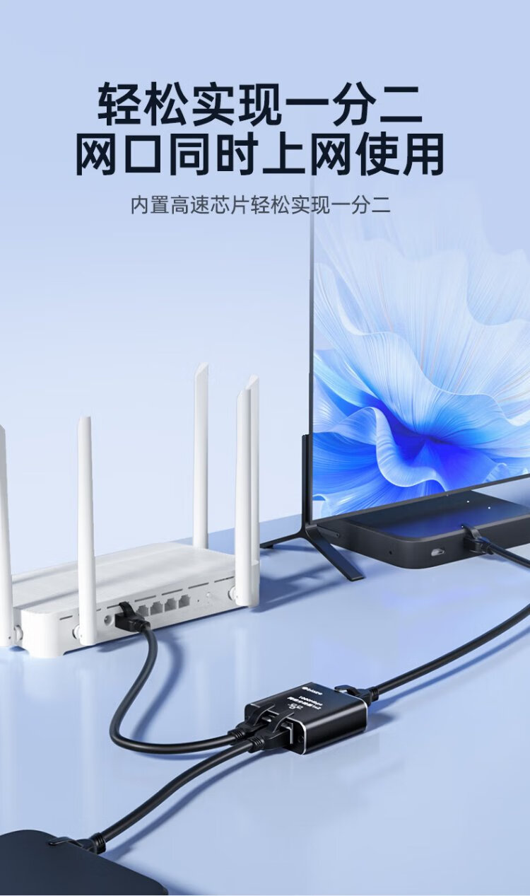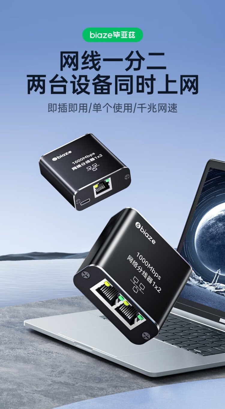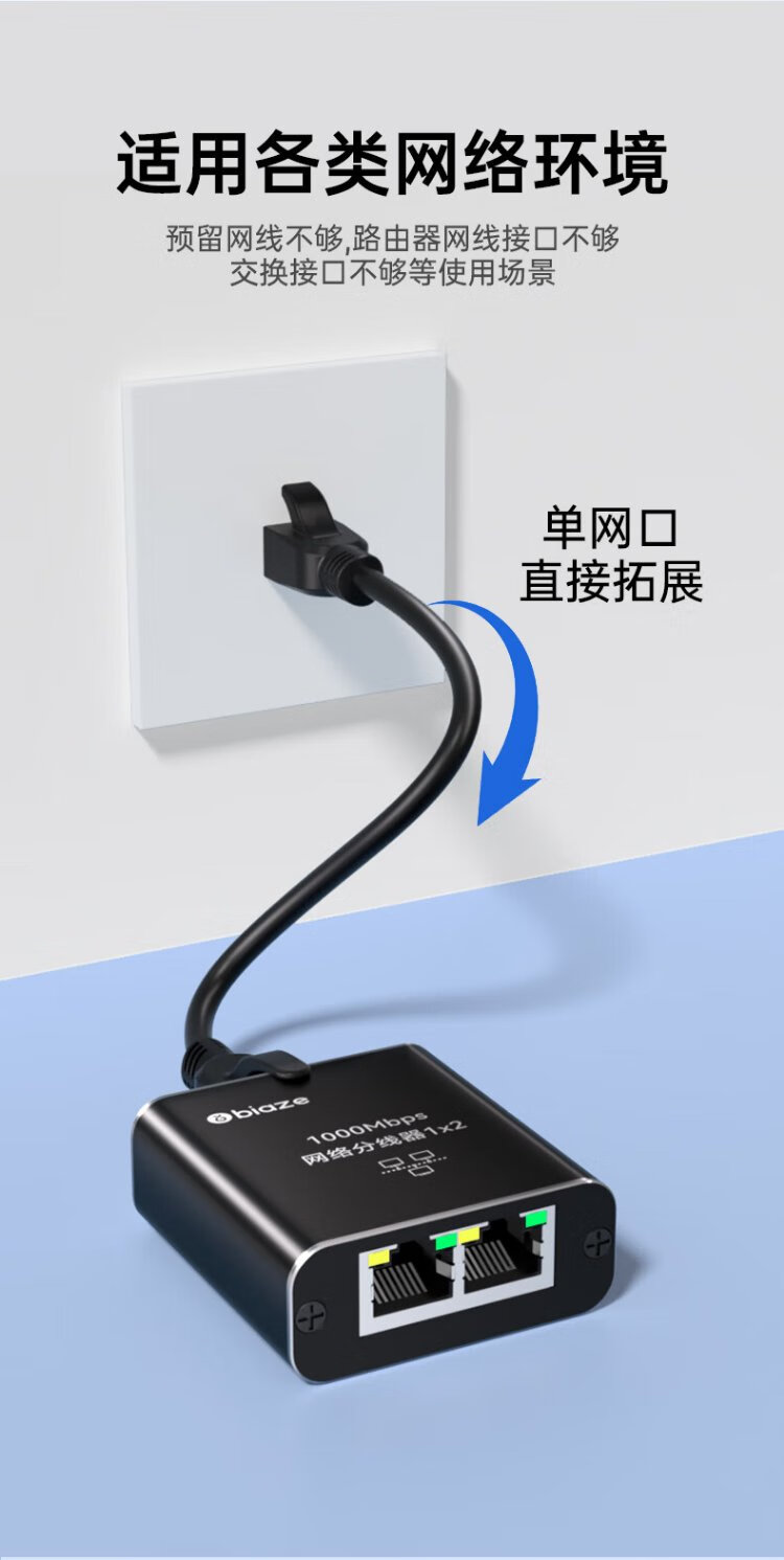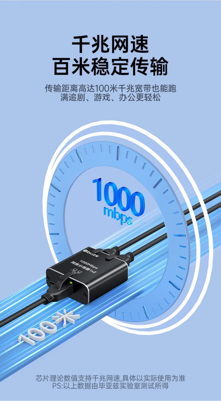 毕亚兹网线分线器一拖二 千兆网络扩展器 网口一拖二上网转换器转接头 RJ45双网口延长器宽带接口分接器
