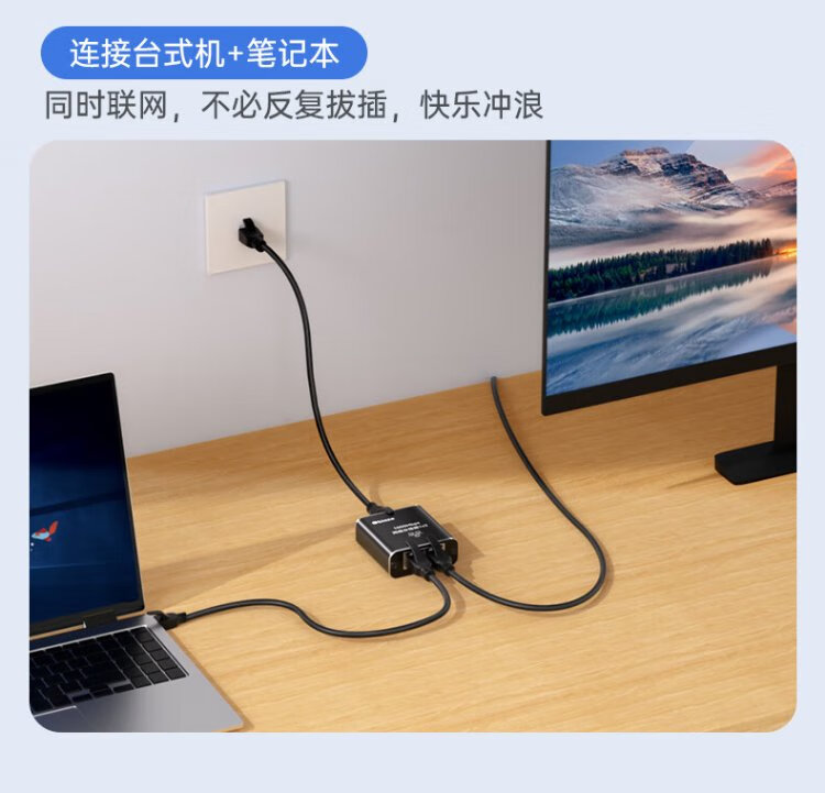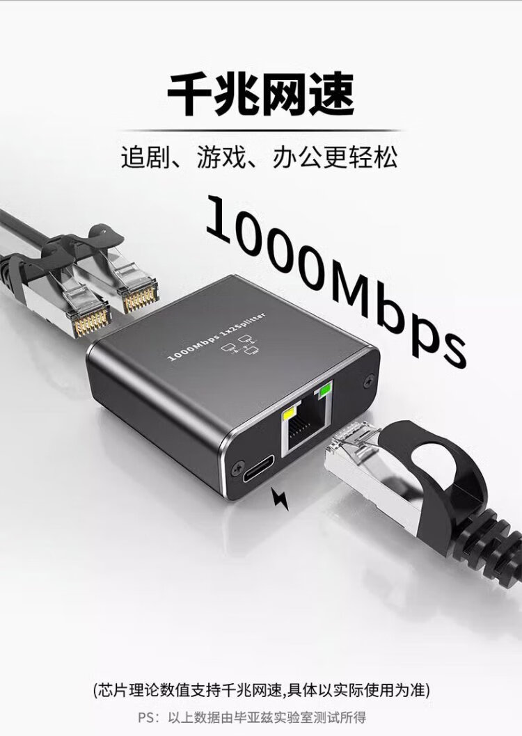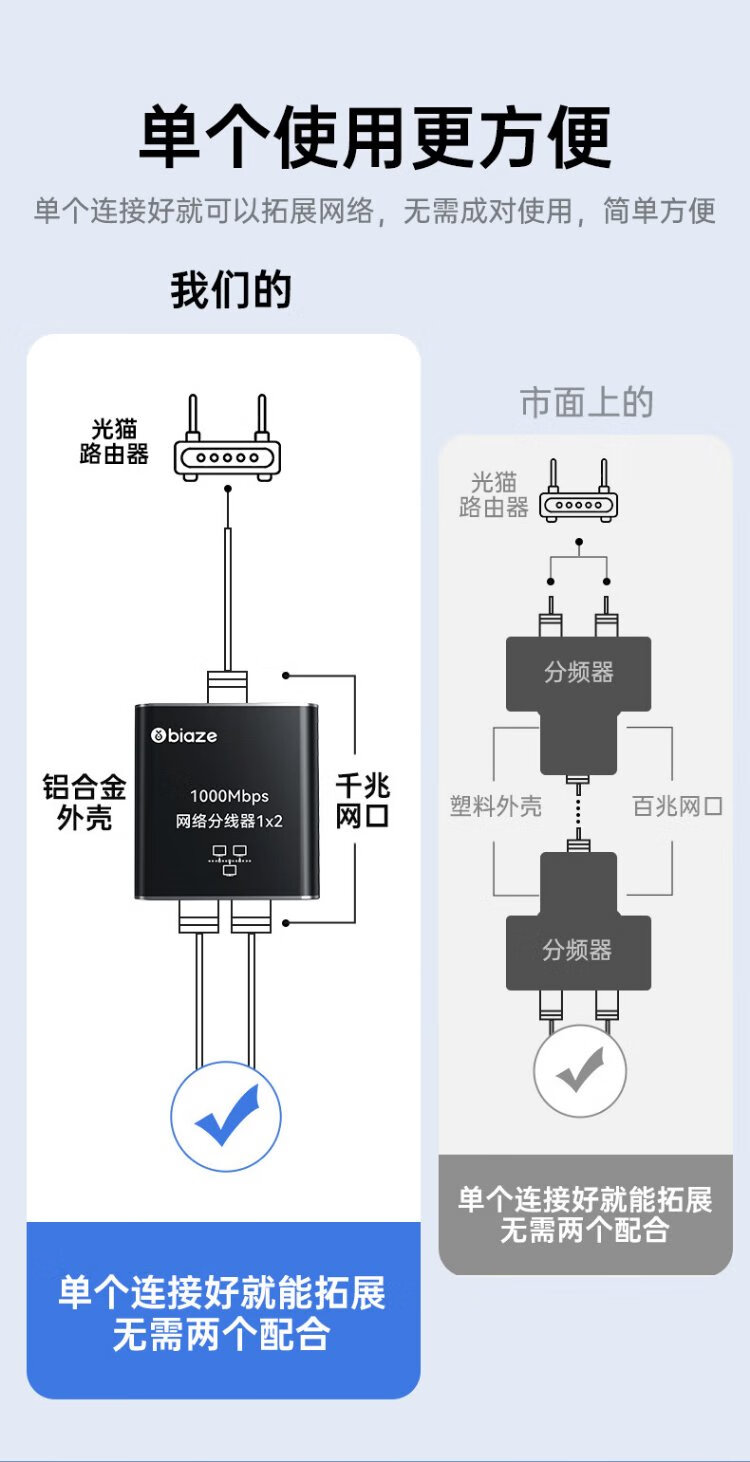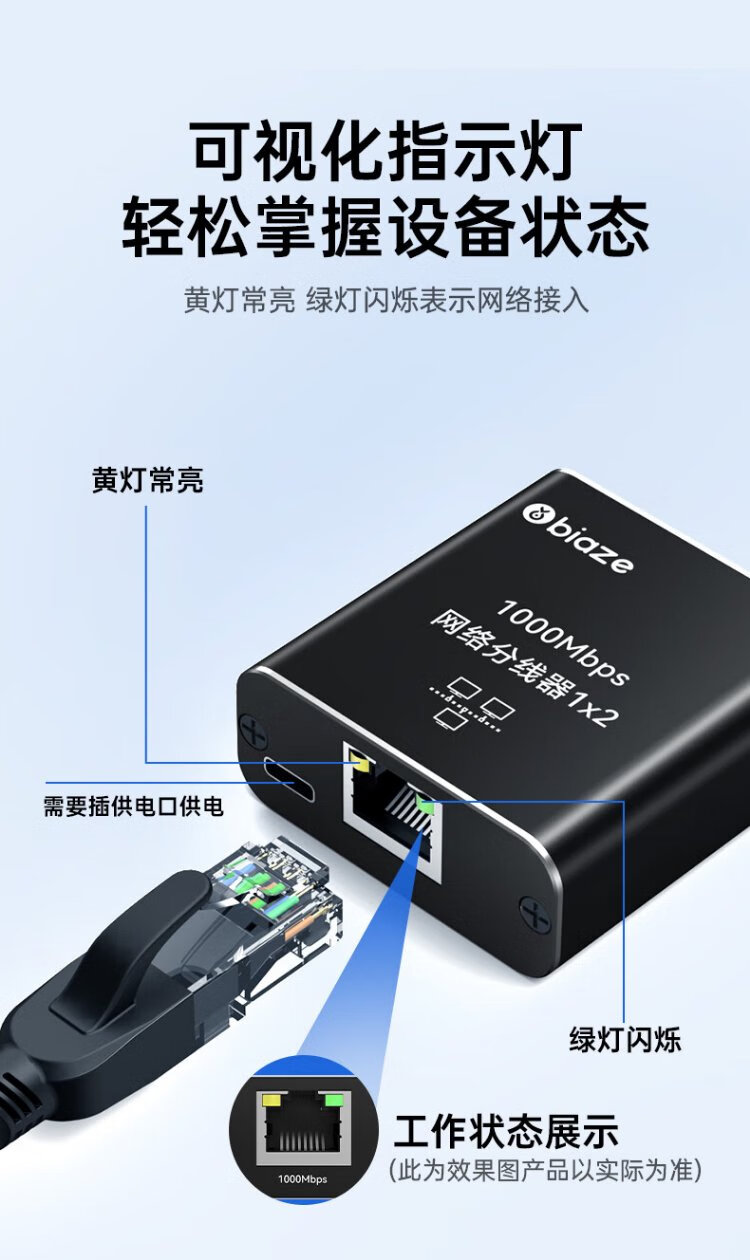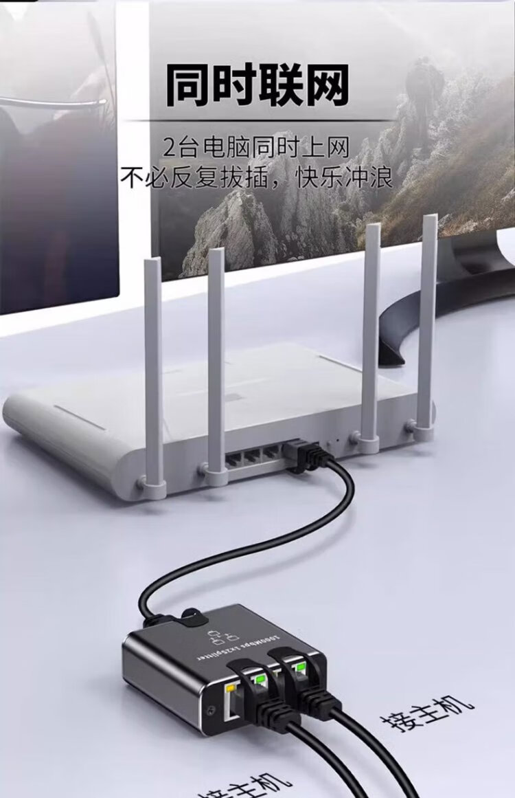 毕亚兹网线分线器一拖二 千兆网络扩展器 网口一拖二上网转换器转接头 RJ45双网口延长器宽带接口分接器