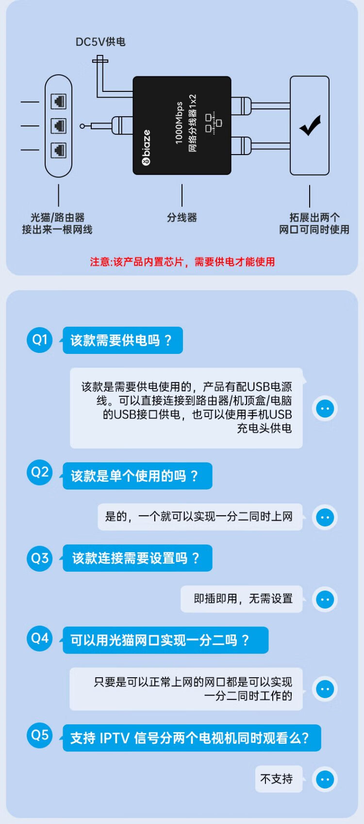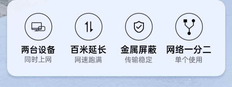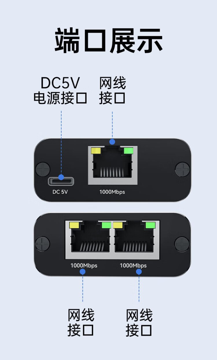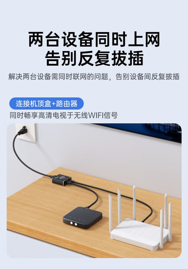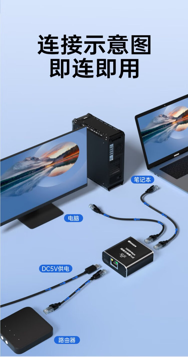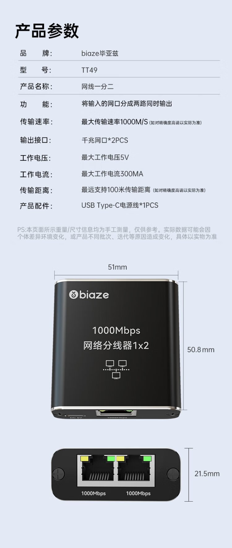 毕亚兹网线分线器一拖二 千兆网络扩展器 网口一拖二上网转换器转接头 RJ45双网口延长器宽带接口分接器