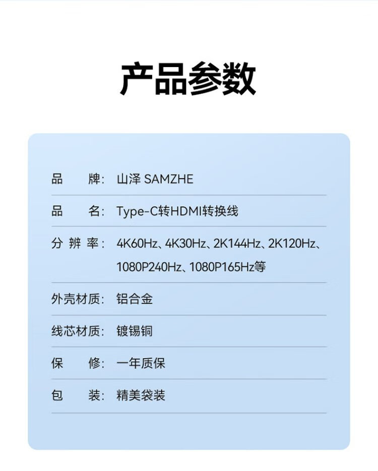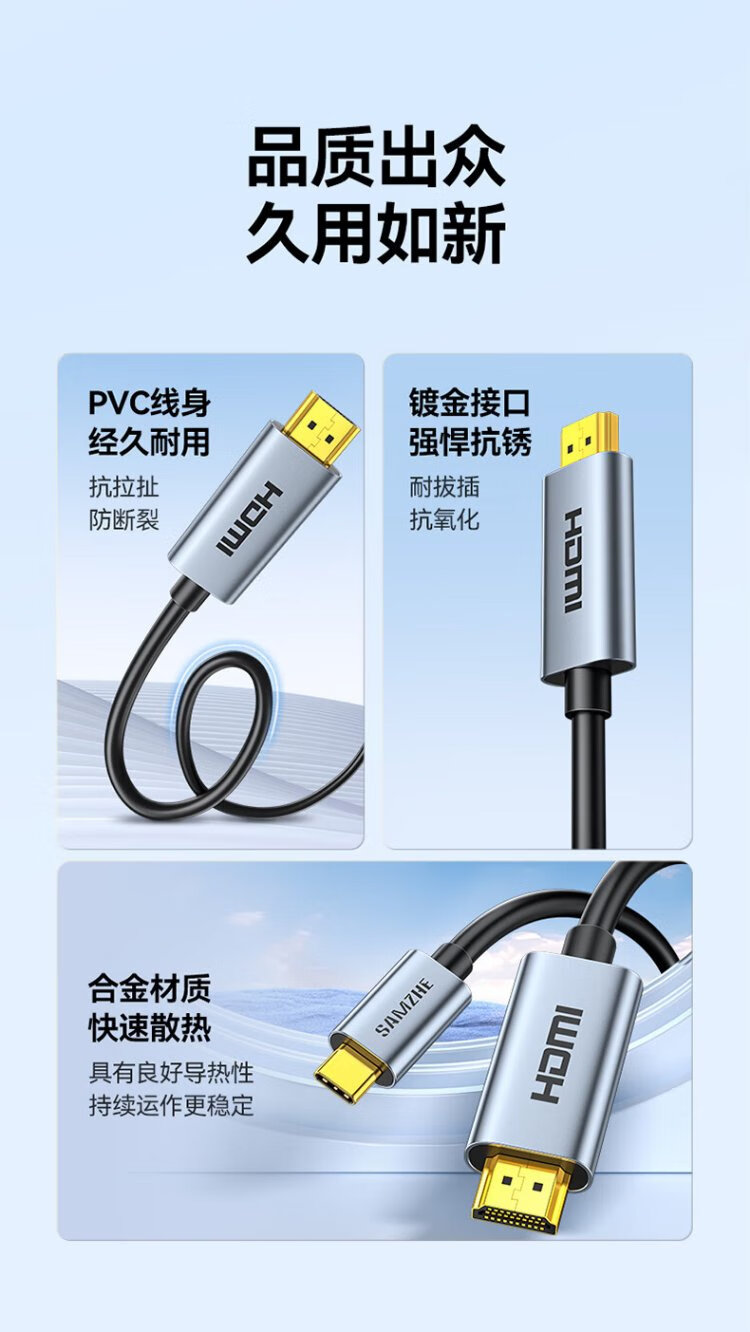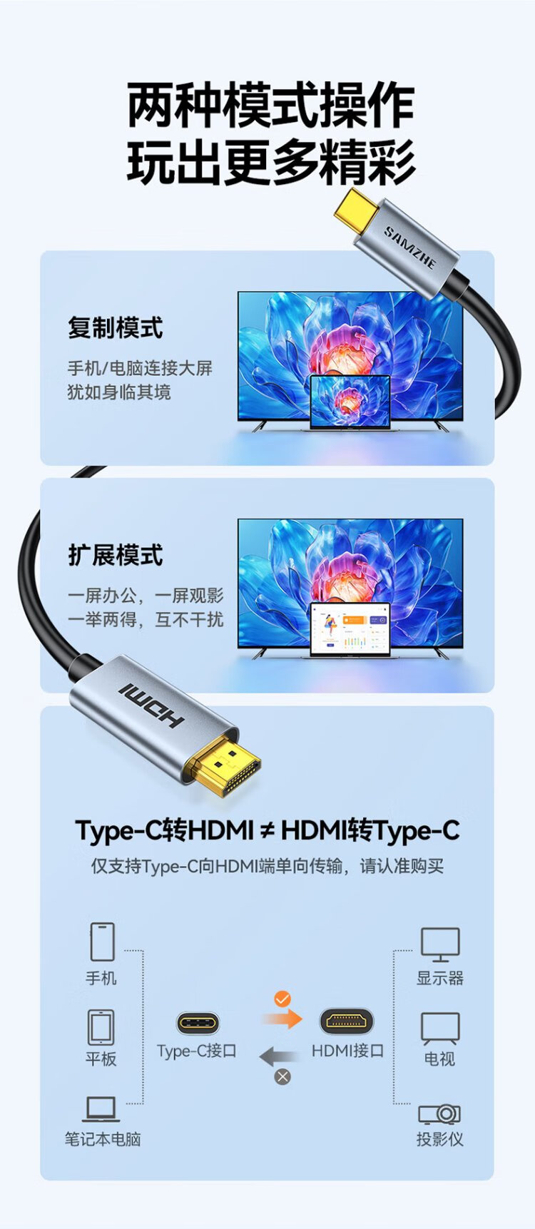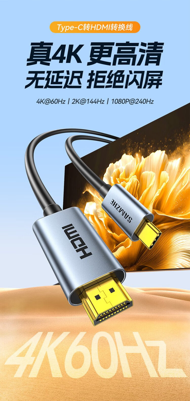 山泽Type-C转HDMI线雷电4/5转换器USB-C转接头高清4K60/2K144Hz投屏适用苹果16/15/iPad手机笔记本电脑