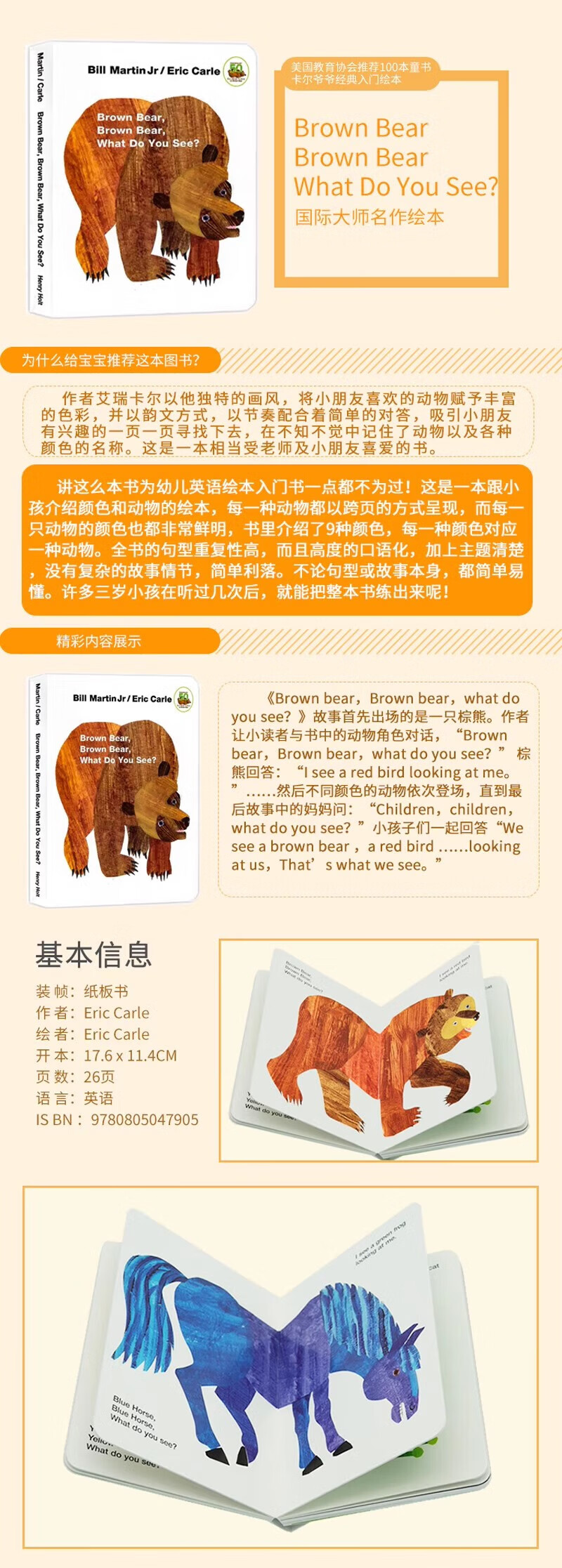 英文原版 Brown Bear Brown Bear What Do you see 棕熊你看到了什么 棕色的熊 Eric Carle 艾瑞卡尔 撕不烂纸板书 认知绘本