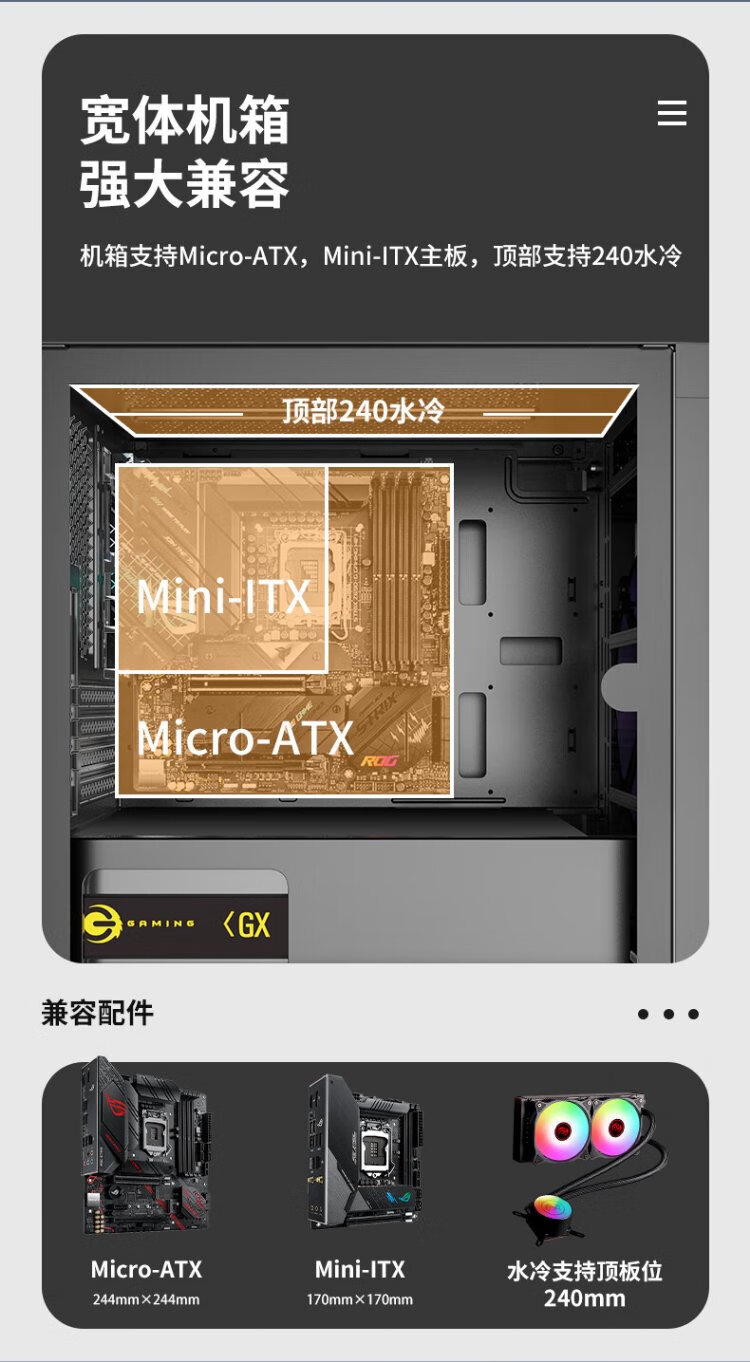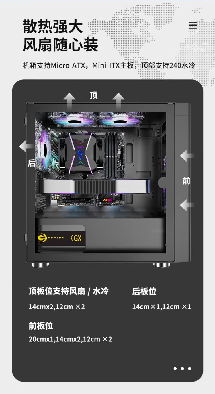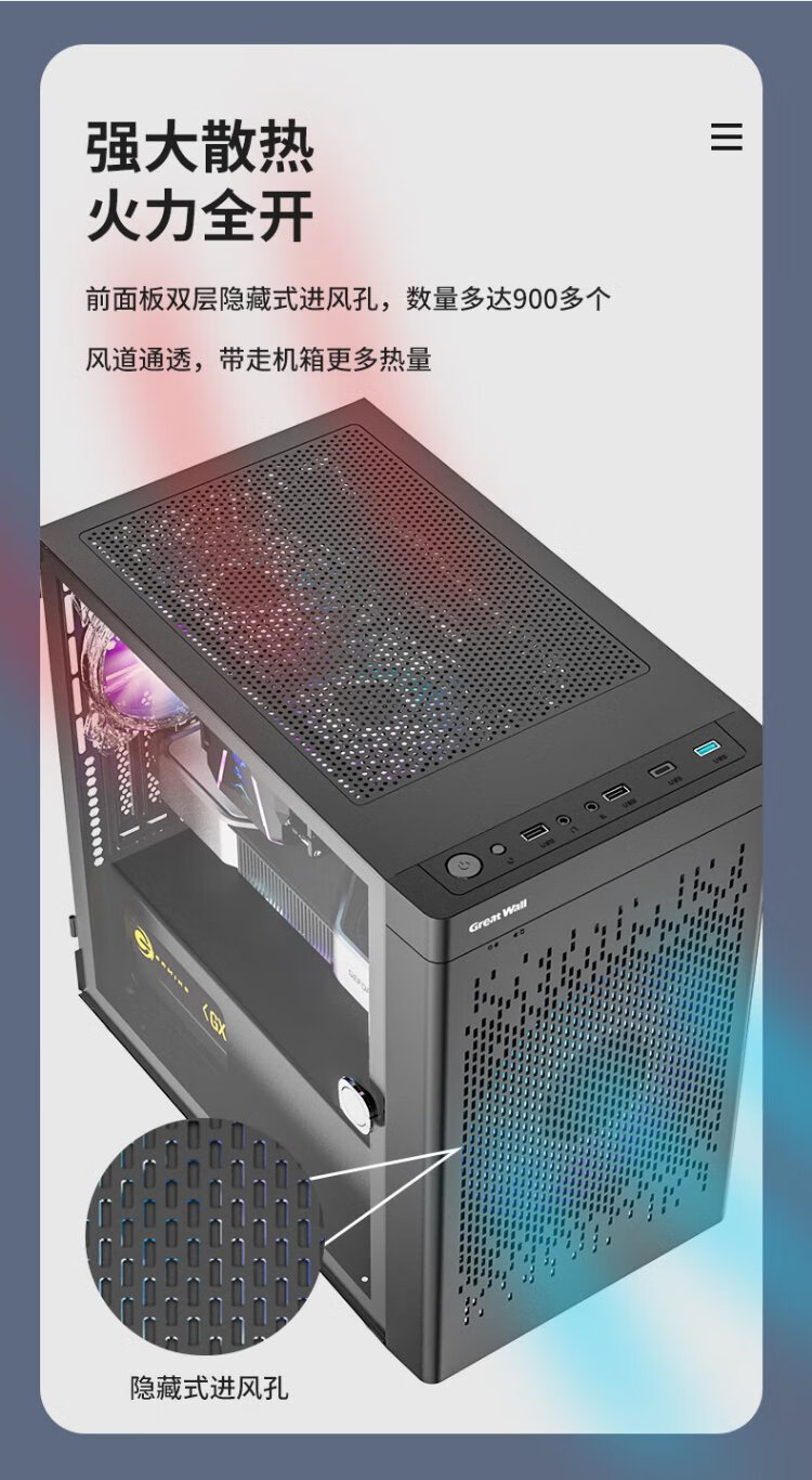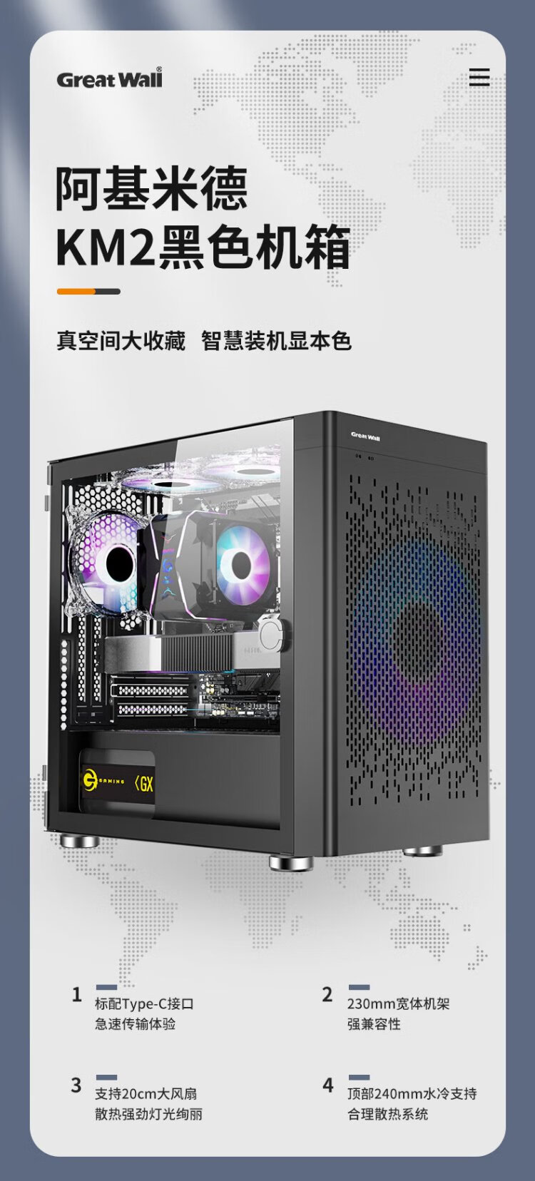 Great Wall Archimedes 2 schwarzes Computergehäuse (Typ-C 3,2/20 cm Lüfterposition/kleines MATX-Motherboard/240 Wasserkühlungsposition/breites Gehäuse/5080-Grafikkarte)