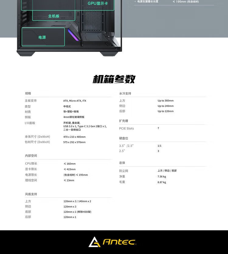 安钛克(Antec)FLUX机箱电脑主机玻璃侧透/实木外观/强劲散热/FLUX风道专利/标配5把风扇 /双位360/E-ATX