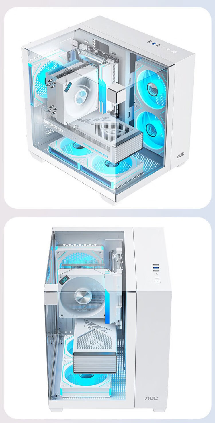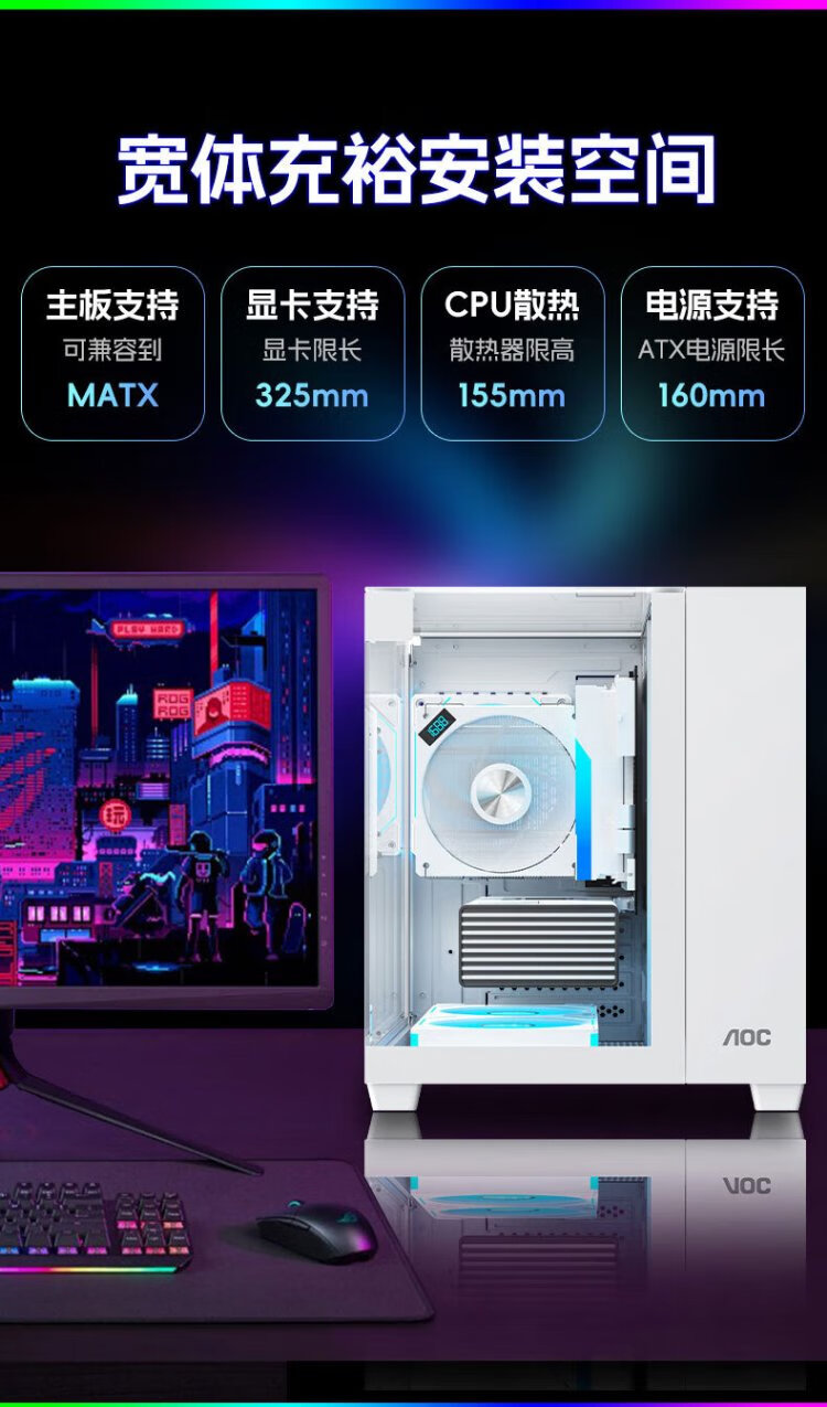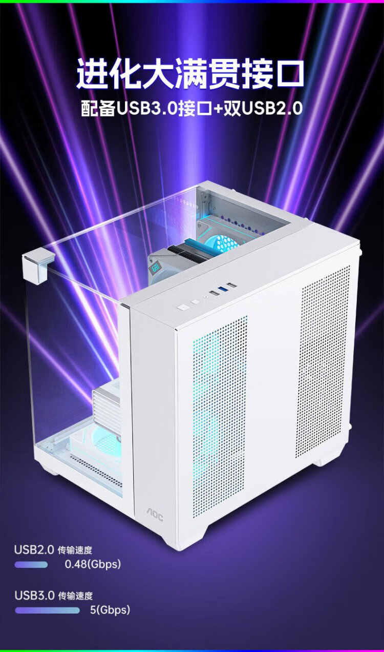 AOC星海CG389白色 游戏电脑主机海景房机箱 三面玻璃/无立柱/支持MATX/5风扇位/3D立体全景/左右分仓