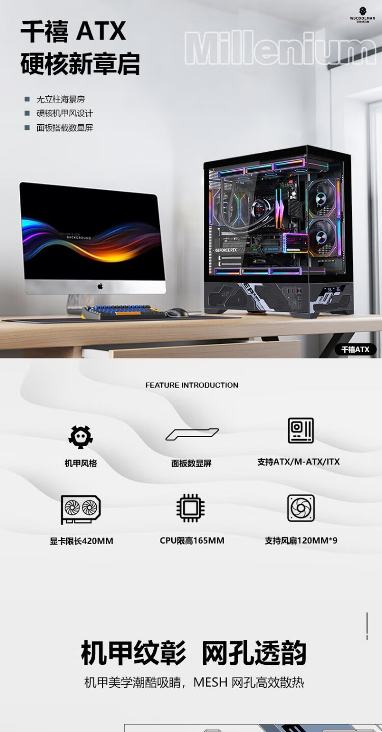 Wanjia Millennium AXT digital display version white gaming computer desktop case supports 360 water-cooled ATX motherboard digital display 270 sea view room