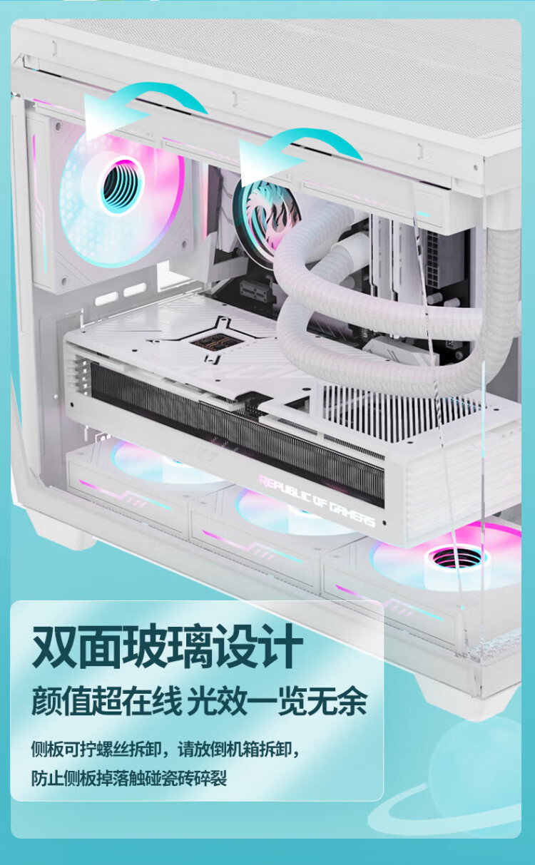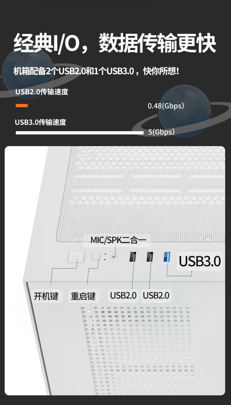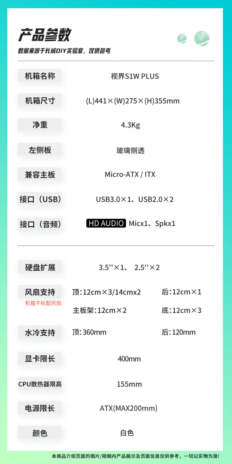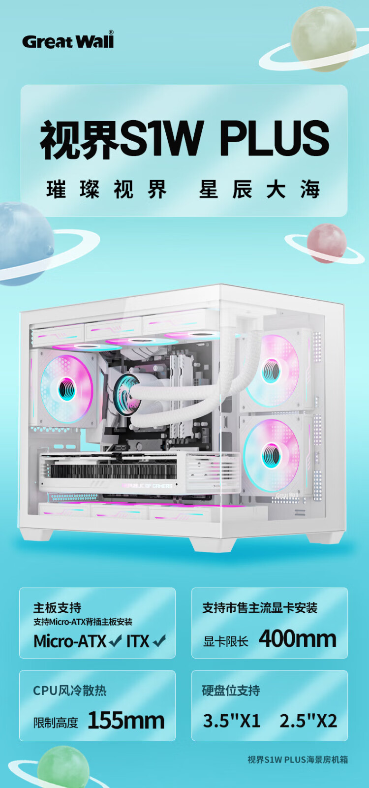 Châssis de salle blanc avec vue sur la mer Great Wall Vision S1W PLUS (carte mère MATX/verre double face/360 positions de refroidissement par eau/9 positions de ventilateur/USB3.0/filtre anti-poussière/carte graphique longue)