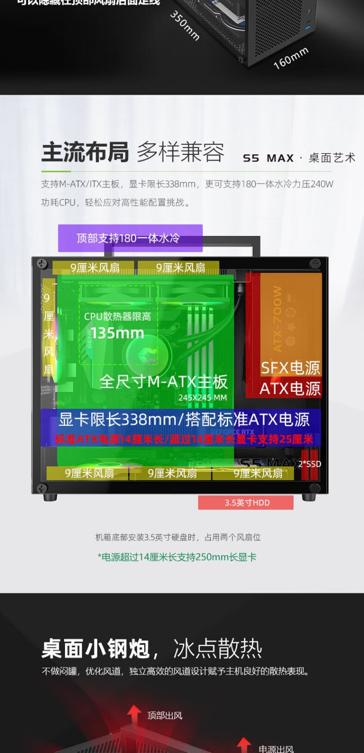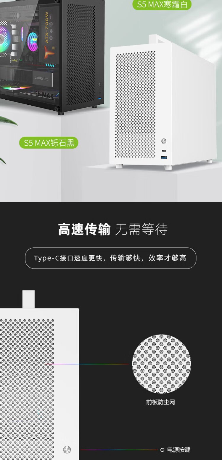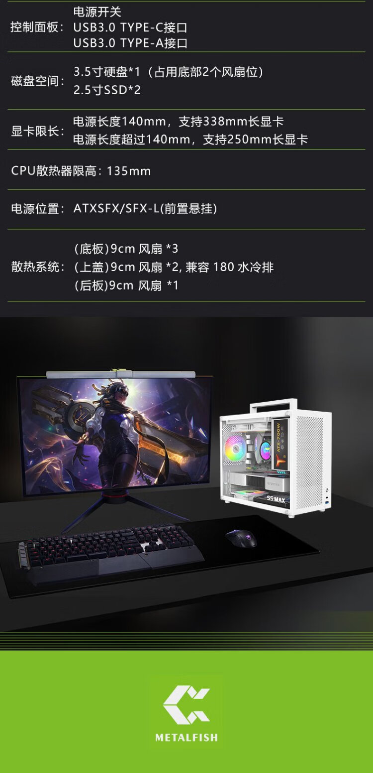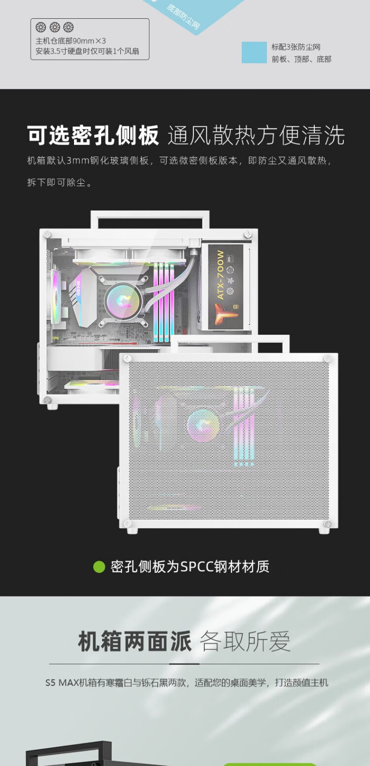 鱼巢 (MetalFish) S5MAX 电脑台式机小机箱 手提迷你桌面 多网孔散热支持180水冷 白色机箱+3个白光风扇
