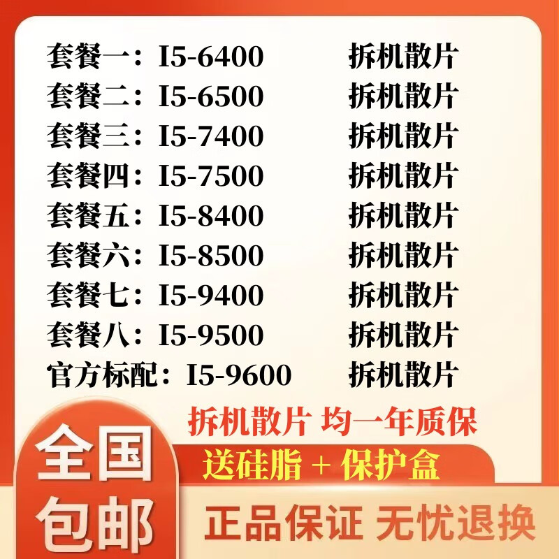 英特尔(Intel)I5 6500 7400 7500 8400 8500 9400 9500 9500F 6400 9代 I5-9600KF 全新拆机散片处理器cpu 9代 I5-9600 二手散片
